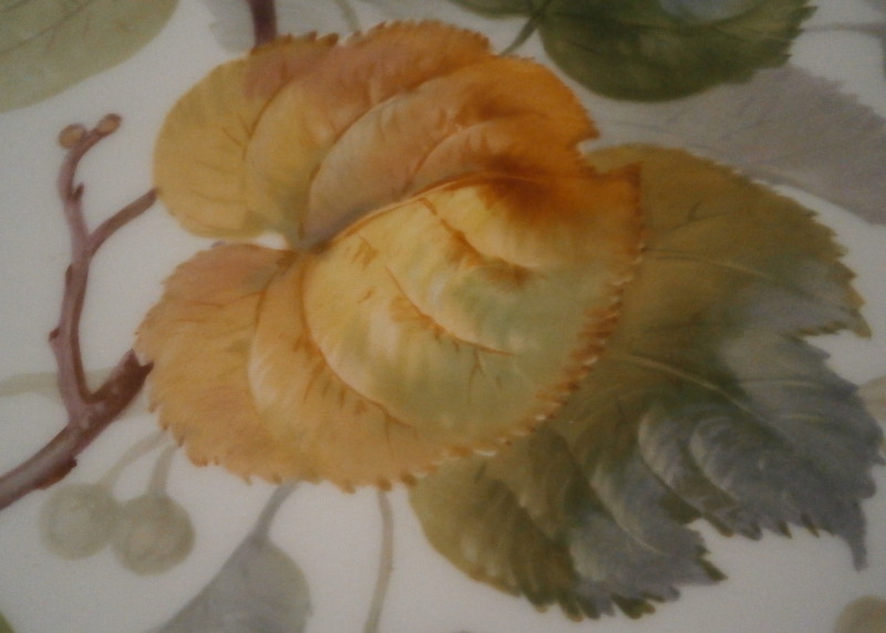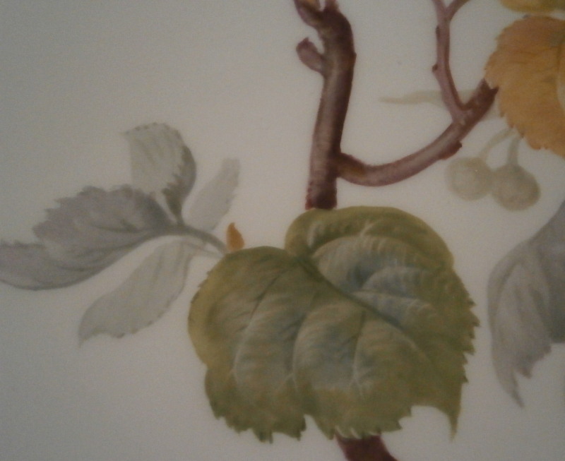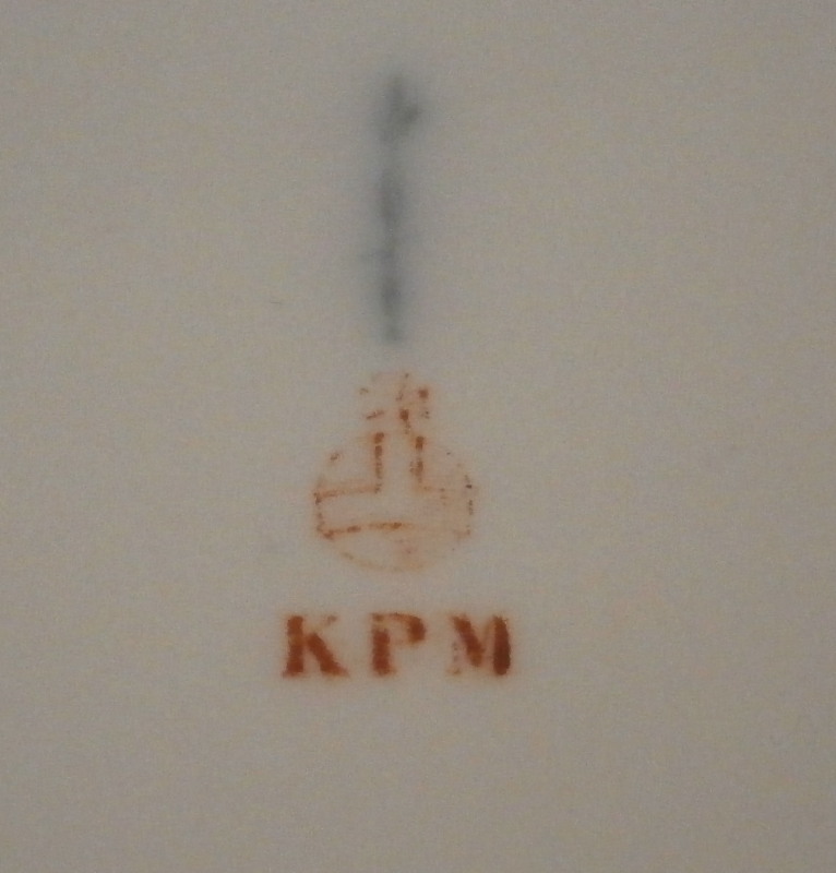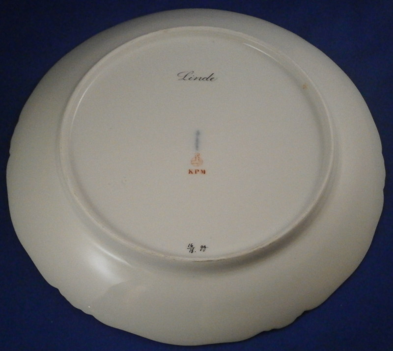 This is a plate made by KPM in the early 20th century. It is hand painted with the rarest design on these plates of this style - the tree branch / leaf motif. This one is of an Linden tree branch along with its leaves and some seeds - very nice! Kind of the German version of the Flora Danica :) Just an amazingly detailed painting. The rim itself is painted with gold on a raised design. The plate is in perfect condition. It is 8.5 inches in diameter so a nice size and 1 inch tall. The plate is marked underneath with the underglaze blue scepter, the red orb mark, some black numbers and letters, a gilder's mark, the usual impressed marks of this period and the name of the motif - Linde in black script. Please email me for more information or other pictures.