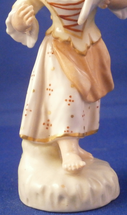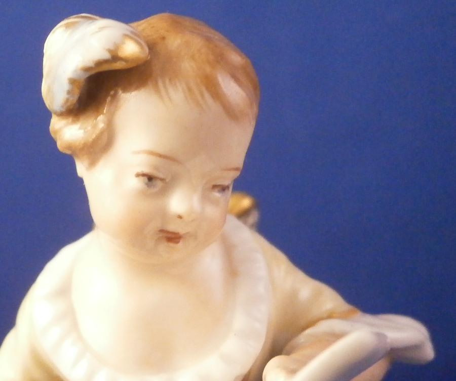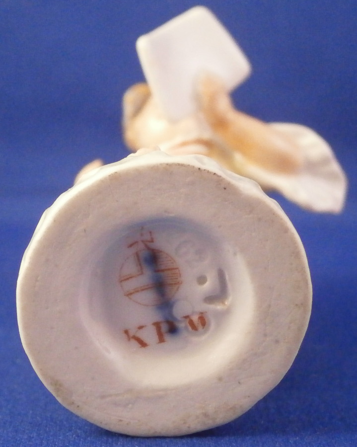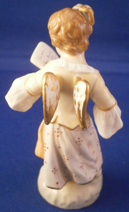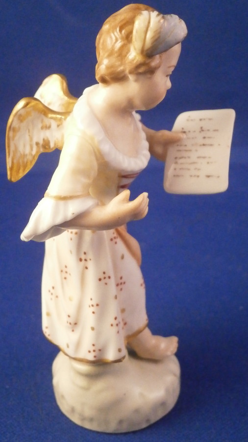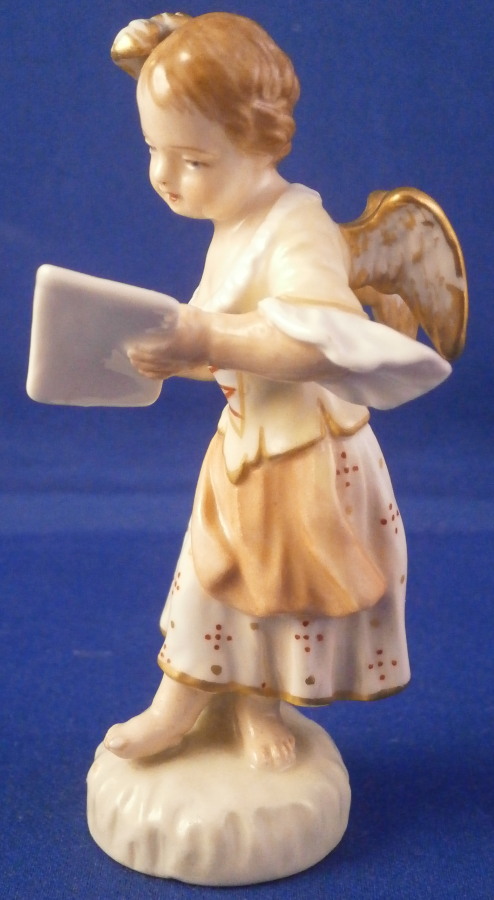 This is a really cute figurine made by KPM in the early 20th century during the Art Nouveau period in which they used these superb softer colors called Weichmalerei which I really like. The little figure is of a cherub holding a piece of paper in herleft hand. I imagine it to be a love letter but it could very well be a sheet of musical notes or anything else for that matter. Whatever you want it to be really :) The figurine is superbly modeled with a pair of feathers in her hair and little wings on her back. Nicely hand painted with lots of detail in thos softer tones that look superb! The piece is marked underneath with the under glaze blue scepter, the rred orb and the usual other marks one would find one pieces from this period as shown. The figurine is in perfect condition which is always nice to find! Please email me for more information or other pictures.