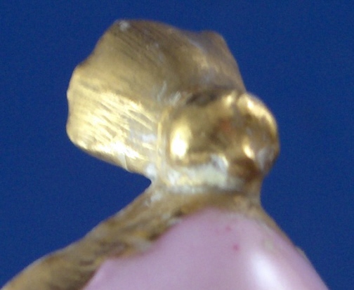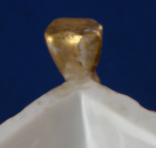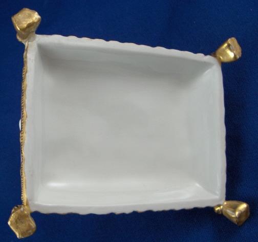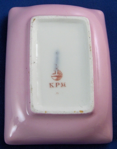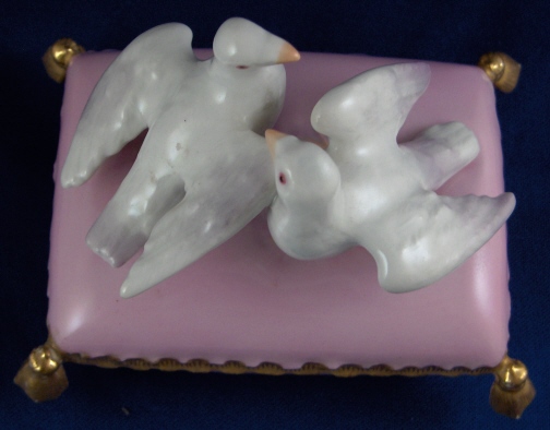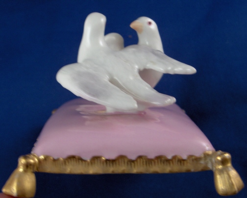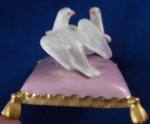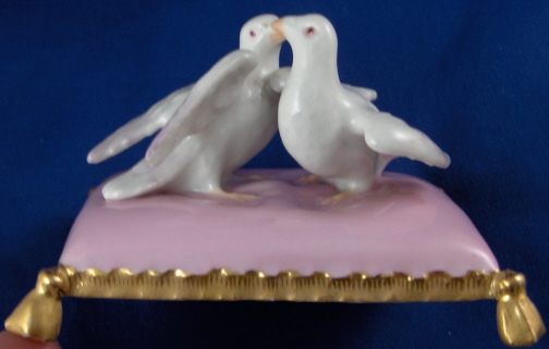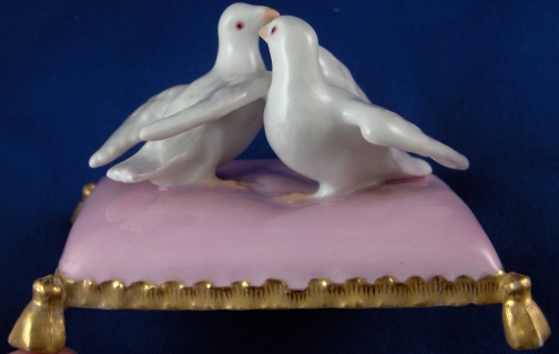 This is a very interesting box and not one I have ever seen before nor can I find it anywhere. It was made by KPM in the early 20th century and is of a pair of doves sitting on a pink cushion with gold tassles at the corners. The bottom is pnk on the outside as well! A really fun piece that would make a superb present for your lady! The piece is in great condition with one of the corner tassles broken off and reglued - it is the back right corner one and not obvious at all! The box is marked underneath with the underglaze blue scepter mark and the red orb mark and what looks to be an impressed U which would be the date letter. The piece including the lid and birds is about 3 inches tall, 4.125 inches wide and 3.25 inches deep. Please email me for more information or other pictures.