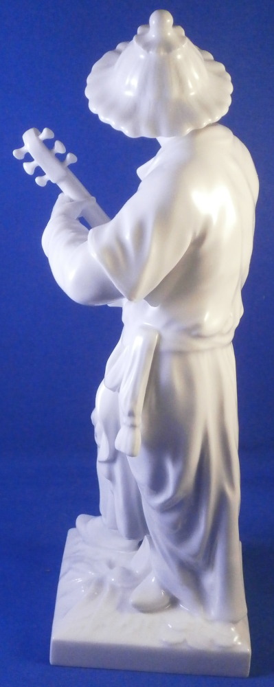 This is a superb figurine of a Malabar made by KPM in the later 20th century. It is of an Asian gentleman playing the lute. A superbly modeled figure with lots o details standing on a square base with plants in relief to the top. The gentleman is wearing his traditional outfit of a flowing robe and a nice hat. This figurine was originally modeled by Elias Meier in 1777 and comes from the series Fremde Voelker (foreign peoples). The figure is in perfect condition! The figurine is 8.75 inches tall, 3.25 inches wide and 3.5 inches deep. It is marked underneath with the under glaze blue scepter (first choice) as well as an impressed star mark as shown. A really nice figurine! Please email me for more information or other pictures.
