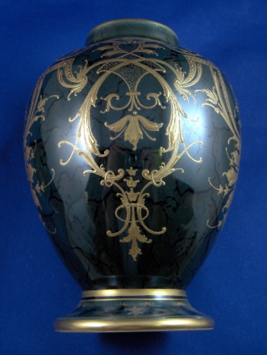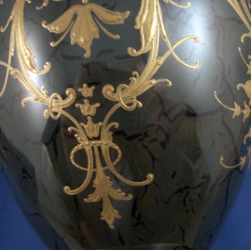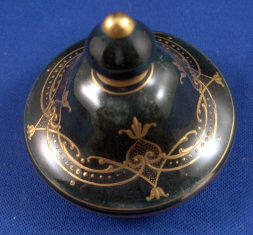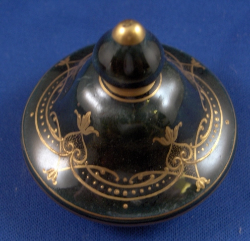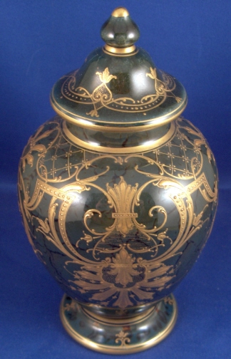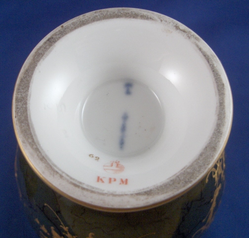 This is a lidded tea caddy or jar made by KPM around 1900. It is handpainted with a green base color with black in between to make it look marbelized. Really very neat. On top of that is a raised fancy gold trim. Marked underneath with the underglaze blue scepter mark as well as the overglaze red KPM orb mark showing it was painted by KPM. The jar is 7 inches tall with the lid and 3.75 inches in diameter. The jar and lid are in perfect condition except for a tiny flat chip to the bottom lid rim that goes inside the tea jar and cannot be seen. Please email me for more information or other pictures.