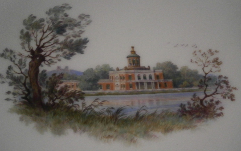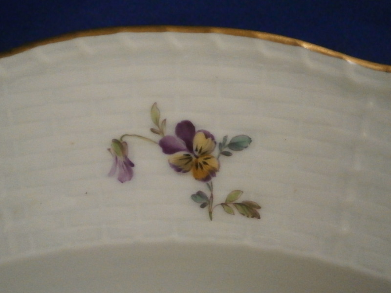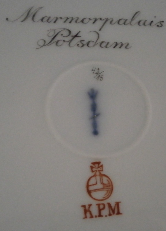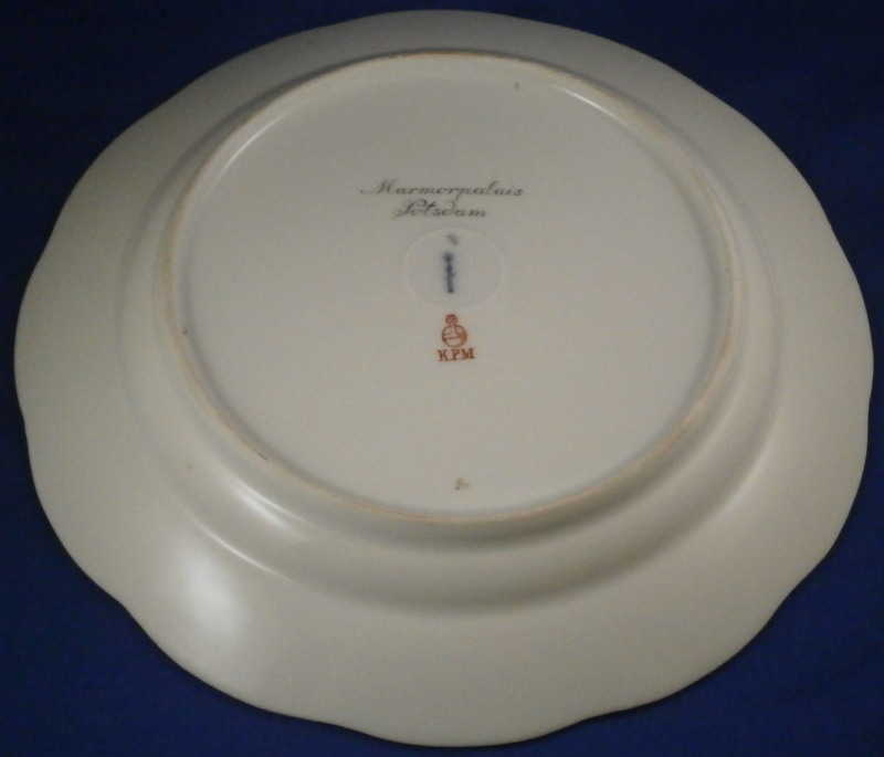This is a superb plate made by KPM in the early 20th century. It is hand painted with a scene of the Marmorpalais ( Marble Palace )in the city of Potsdam in the center surrounded by a nice landscape including water, trees and bushes and even some birds flying above. A few nice single flowers scattered throughout with a basketweave rim and a gold trim to the edge. The plate is 1.25 inches tall and 9.75 inches in diameter. It is in perfect condition. It is marked underneath with the underglaze blue scepter mark, the red orb mark, the usual other marks normal to this period as well as the name of the scene in the front in black - Marmorpalais Potsdam. Please email me for more information or other pictures.