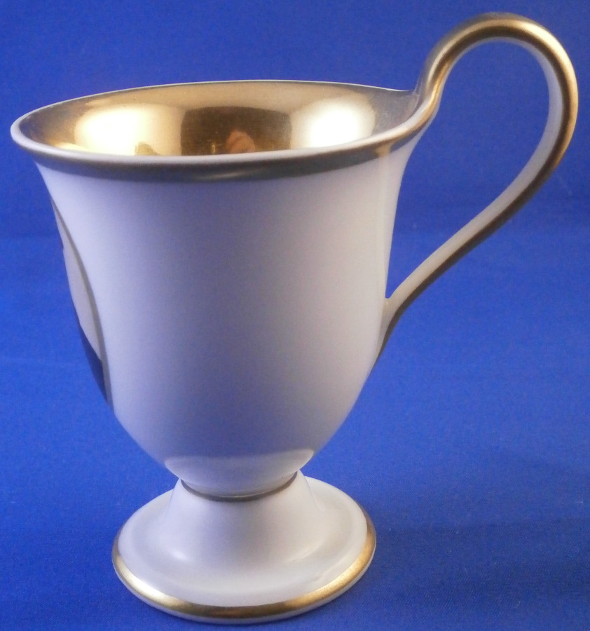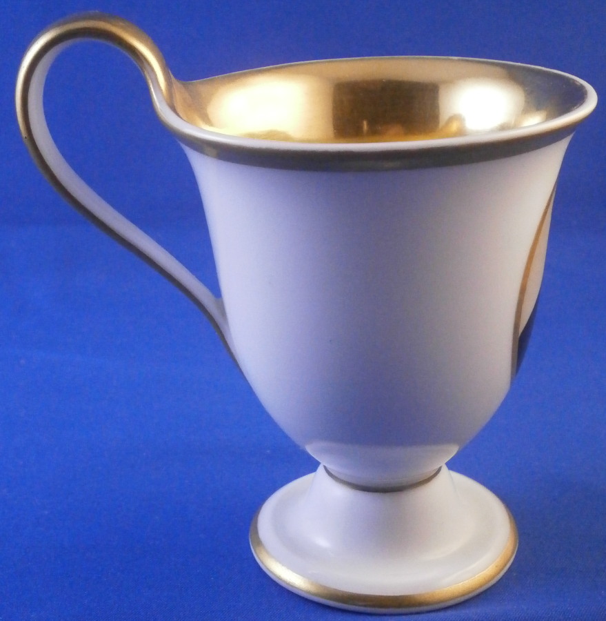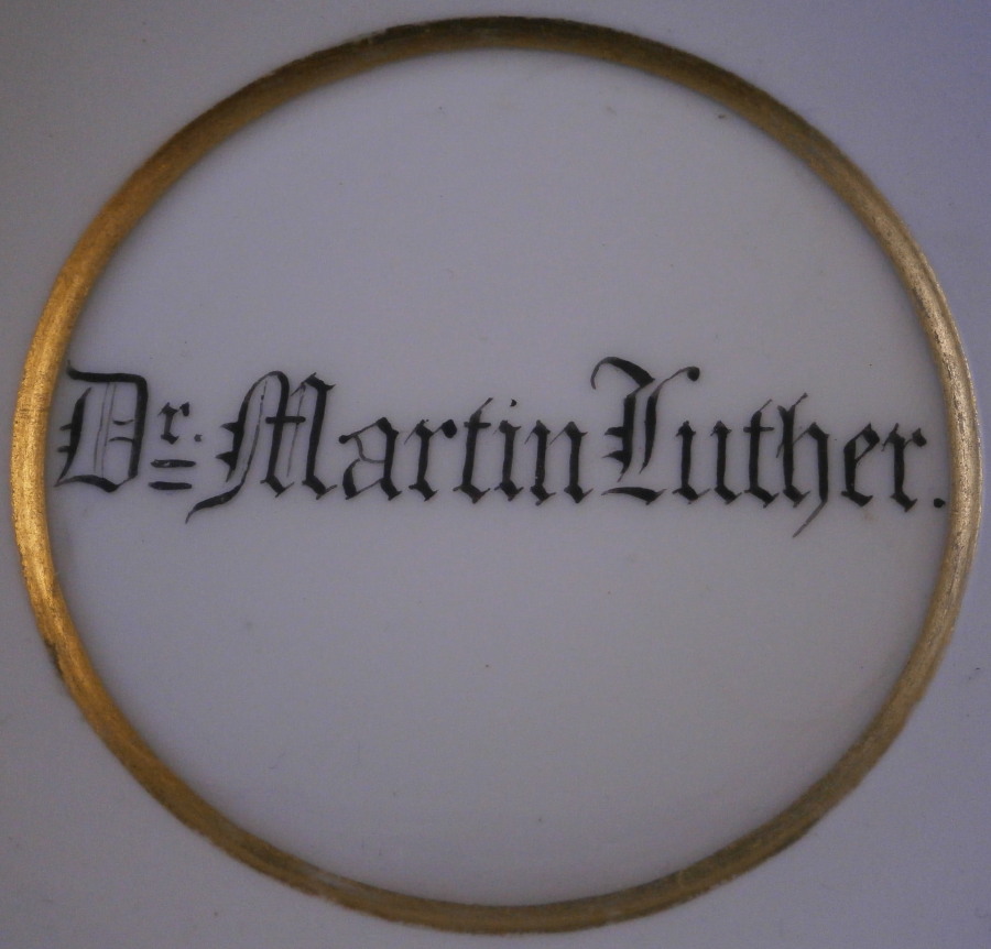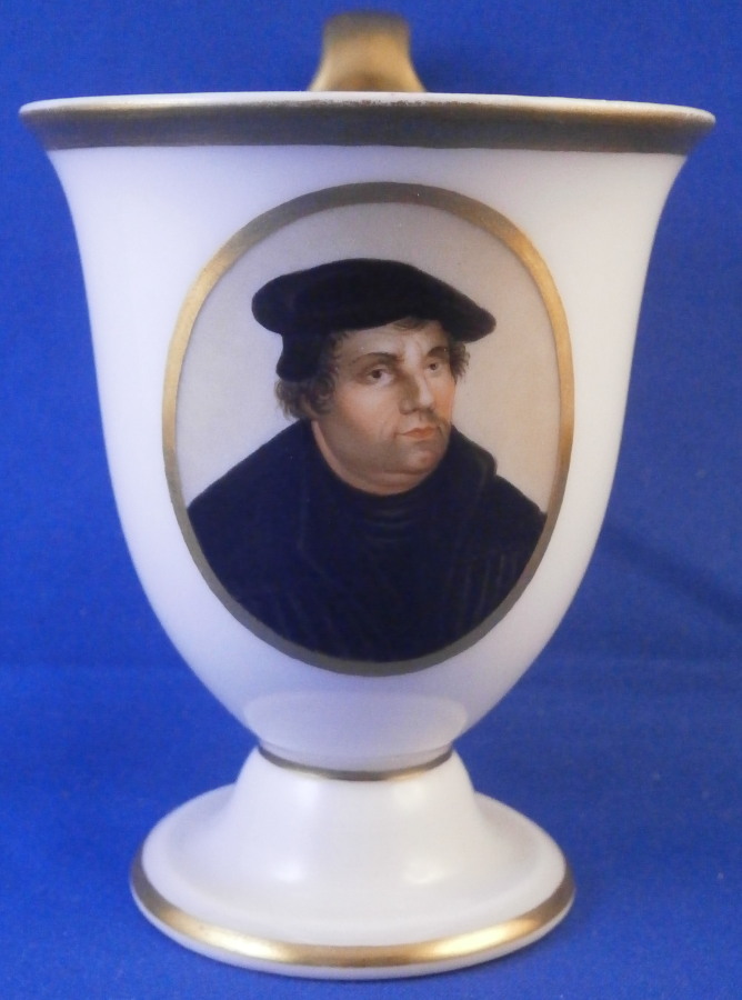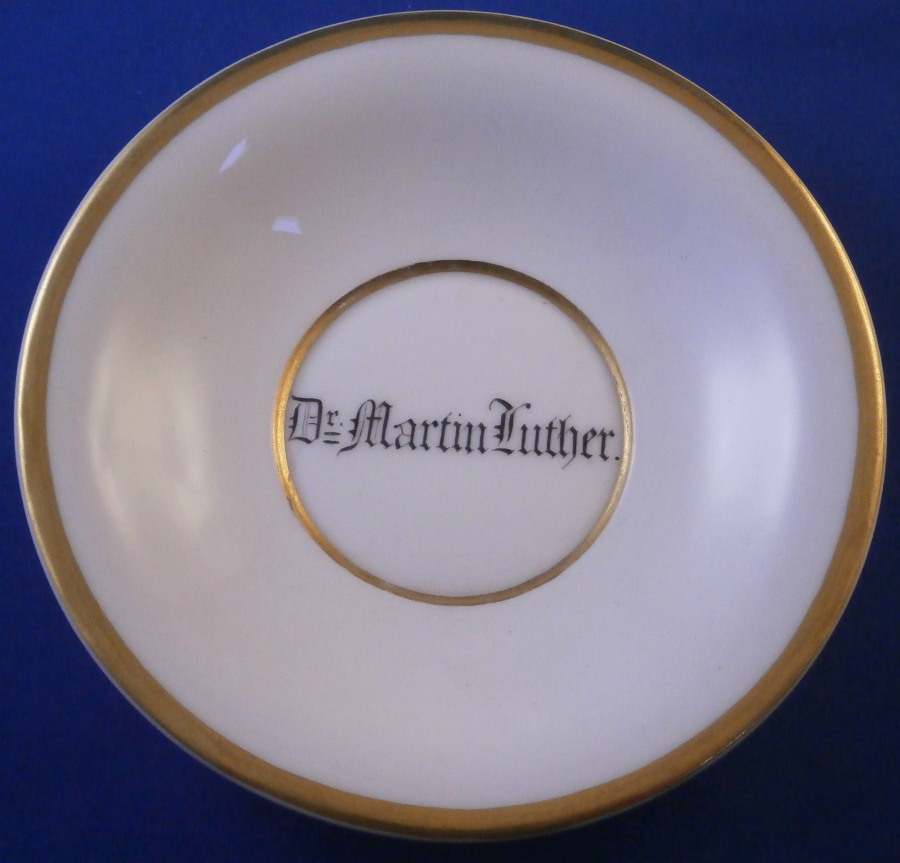 This is a cup and saucer made by KPM in the early 19th century during the Biedermeier period around 1815-20. It was made before they used their red orb mark thus you only have the blue scepter and impressed marks / painter's marks most of the time. The painter's marks here are the orange line and dots. The style of the cup is really very sleek and typical of this period but the best part is the portrait to the front of the cup of Dr. Martin Luther. It is very well painted. Some nicely placed gold trim and a full gilding (except the very bottom) of the inside make this a very elegant set. The saucer simply has two gold lines and the his name in black in the center. Somewhere in the distant past I am related to this guy which might explain the stubbornness running in my family :) My brother is really into genealogy and he has found some really interesting things through it. I don't have the time or patience for it but it's really neat to see his work on it. Both pieces are in great condition with just the most minor of wear to the gilding. As nice as you will find! The cup is 4.125 inches tall including the handle and just under 3 inches in diameter. The saucer is 1 inch tall and just under 5.5 inches in diameter. Both pieces are marked underneath with the under glaze blue scepter mark as well as the painter's marks and impressed marks as shown. Please email me for more information or other pictures.