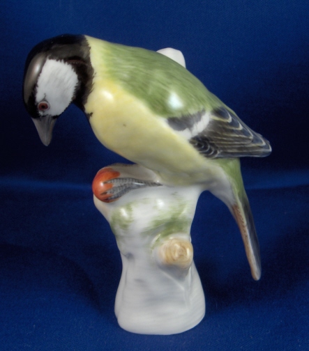 This is a bird made by KPM in the 20th century.it is a bluetit holding a red berry in its feet ready to eat it. It is handpainted with lots of detail and is sitting on a tree trunk. The figurine is in perfect condition and about 4 inches tall, 3 inches deep and 2 inches wide. It is marked with the underglaze blue scepter as well as the red orb mark and a back artist mark. Please email me for more information or other pictures.