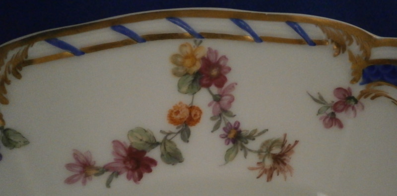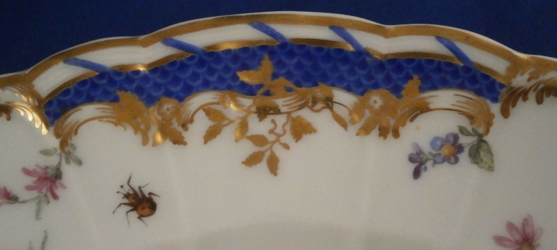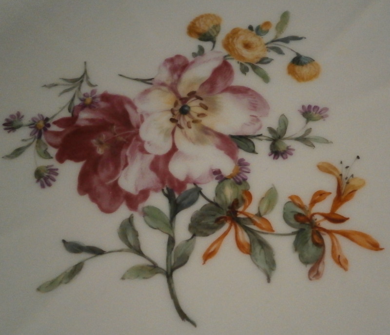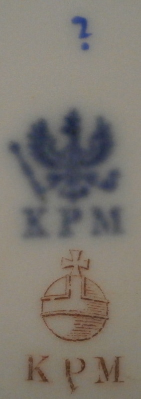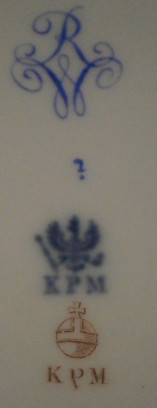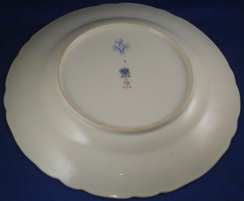 This is a very rare large plate made by KPM around 1845. It is from the actual Breslauer Stadtschloss royal service and not a copy for the general public. Never come across one of these before. Sadly not the original 18th century version but a mid 19th century replacement piece but still something very special. The piece is hand painted with the blue scale trim along the edge that make this design so popular and stunning along with some floral garlands a nice large floral arrangement in the center as well as three small bugs. A stunning piece with some nice history attached to it. The plate has the royal cypher of Wilhelm I ( Wilhelm Rex ) of the House of Hohenzollern without the crown so before he was King or later on Kaiser ( Emperor ) of Germany. He was the prince of Prussia during this time. The plate is 1.125 inches tall and 10.625 inches in diameter. It is marked underneath with the underglaze blue scepter mark as well as the red orb and the royal cypher above it as well as a painter's mark and the usual impressed marks one finds on KPM pieces from this period. Amazingly the plate is in perfect condition! Please email me for more information or other pictures.
