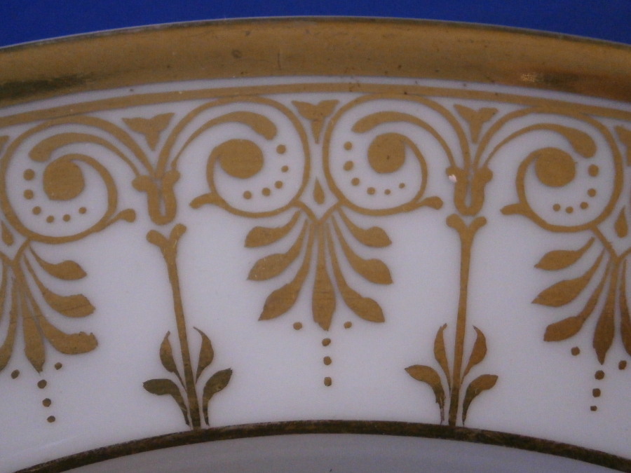 This is a superb deep soup plate made by KPM around 1840. The plate is nicely hand painted with a honeysuckle blossom design in the center and a fancy gold trim to the rim. A very elegant looking plate! I am a big fan of this style but you don't see them often at all anymore. They are getting up there in age :) The plate is in great condition with somevery minor use marks but as nice as they come! It displays perfectly. The piece is marked underneath with the under glaze blue eagle holding a scepter and orb with the letters KPM under it as well as the red orb mark and the usual impressed numbers of the period as shown. The plate is 1.75 inches tall and 9.125 inches in diameter. Please email me for more information or other pictures.
