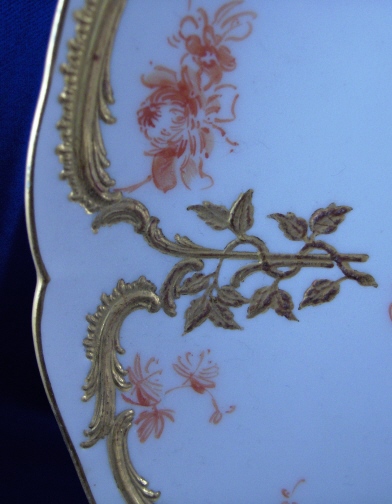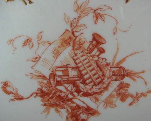 This is a plate made by KPM in 1912. It matches the other one I have up on the site. It is handpainted with an orange scene in the center comprised of a few little hidden things - A sheet of notes, a trumpet, a pan flute, another musical instrument as well as flowers. Just an amazingly detailed painting. There are sprigs of flowers throughout the plate near the rim and the rim itself is painted gold on relief in the form of leaves and scroll work. The plate is in perfect condition. It is 8.5 inches in diameter and marked underneath with the underglaze blue scepter, a blue letter Z, the red orb mark, an artist mark of two arrows pointing in opposite direction, a gilders mark, the impressed letter M and some kind of mark that looks like a sun imressed as well. Please email me for more information or other pictures.