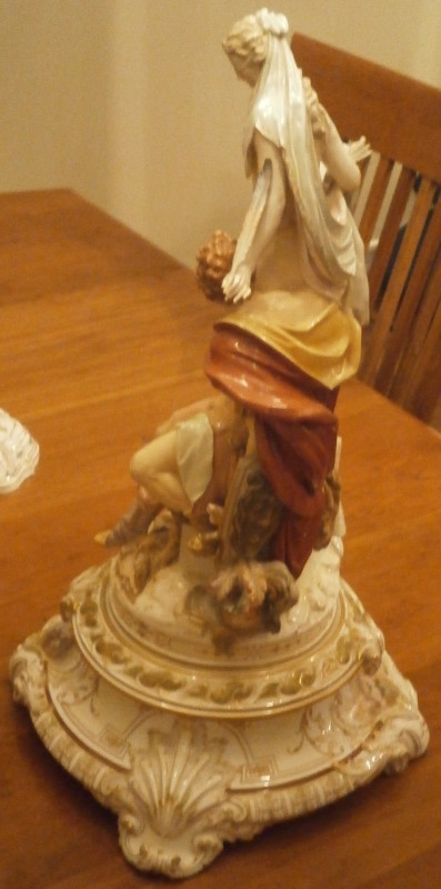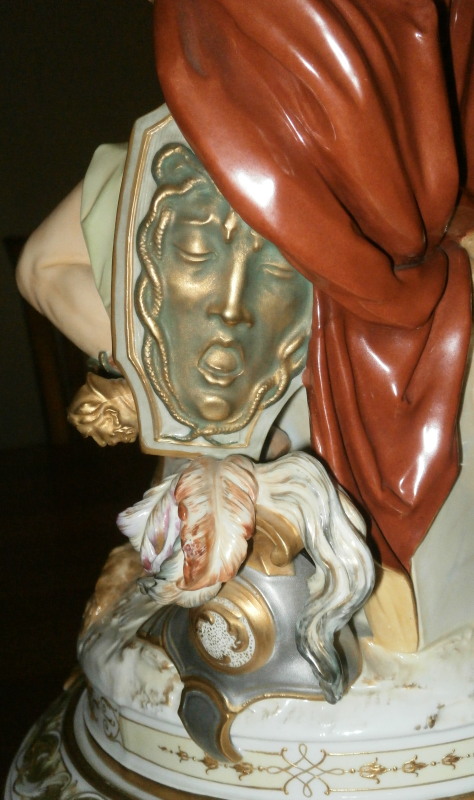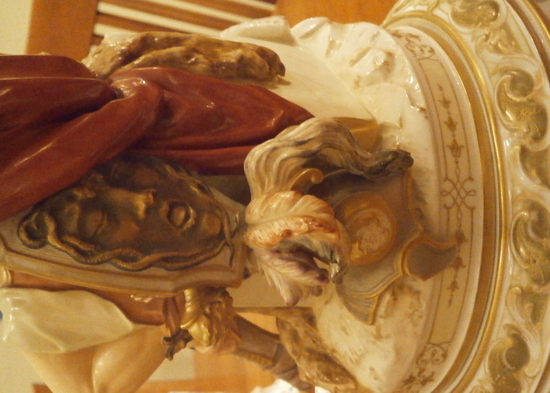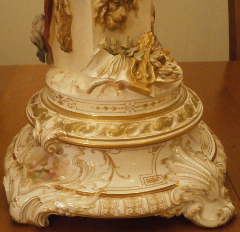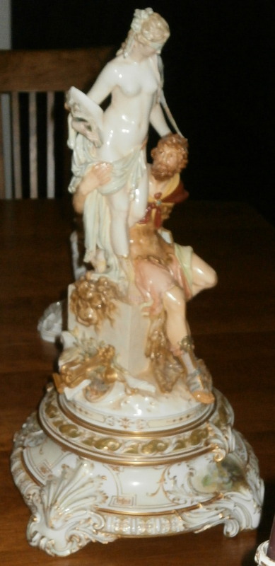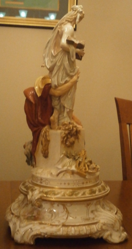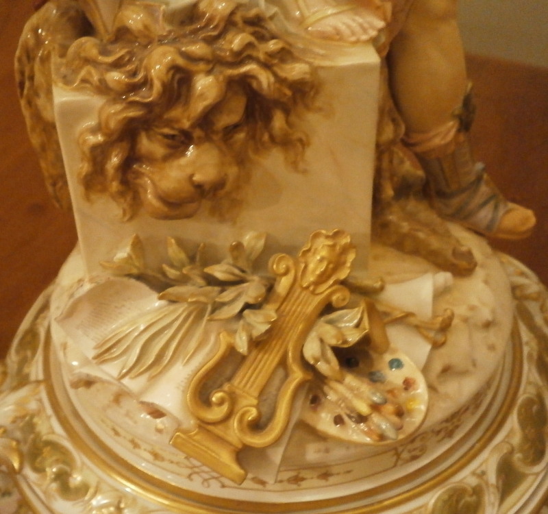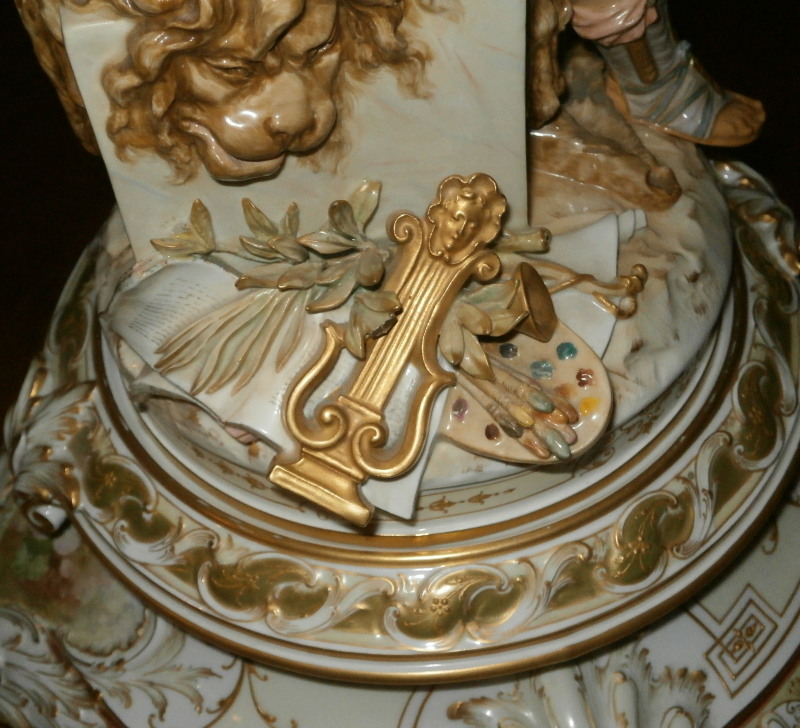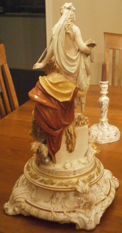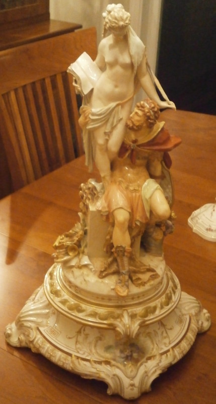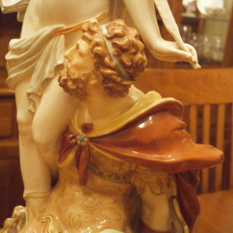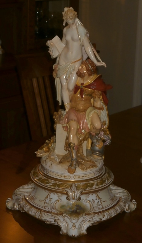 This is an amazing large figurine with a separate base for it made by KPM in the early 20th century. The mythological figurine which was first modeled by F.E. Meyer in the 18th century is of Mars, the god of war sitting below History which looks more like the goddess of justice to me. The figure is modeled with lots of detail and hand painted to perfection in the typical softer color palette of the Art Nouveau period. She is modeled as a blind folded muse that is holding a quill in her left hand and a ledger in her right hand. He is sitting on a block covered by a lion skin with his sword, shield and helmet by his side. The base has a lyre on it, a trumpet, some olive branches I assume, a book, a bow, paint brushes and a white flag (at least that is what it looks like). The already really large figurine comes with its own base / stand that is modeled superbly and hand painted with two Weichmalerei flower panels as well as lots of gilding much of which is raised and some red and green designs to it. Together these two make for a stunning display of one of the largest figures I have ever seen by them. The base is in excellent condition with the tiniest bit of gold wear. The stand is about 4.75 inches tall and has a diameter of 7.5 inches to the top inner part where the figurine sits and the bottom diameter is about 15 inches. The figure is in great condition with the very tip of the bottom end of the quill possibly chipped a tiny bit, one small chip to the red feather of his helmet, two leaves of the olive branch chipped and the bottom end of something that stick out underneath the book on the base is also chipped though I am not sure what that is supposed to be. All of this is really minor and invisible when on display. The piece displays perfectly! The figure is about 18 inches tall with a base diameter of 7.25 inches. Both pieces together are an impressive 23 inches tall!! Both pieces are marked underneath with the under glaze blue scepter, the red orb showing it was painted by KPM as well as various impressed marks normal to this period and painter's marks, etc. as shown. A very similar piece sold at Christie's not too long ago for just over 8K. They ahve better pictures of it as well if you'd like to take a look. Please email me for more information or other pictures.