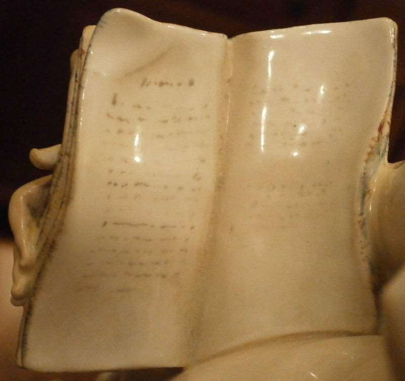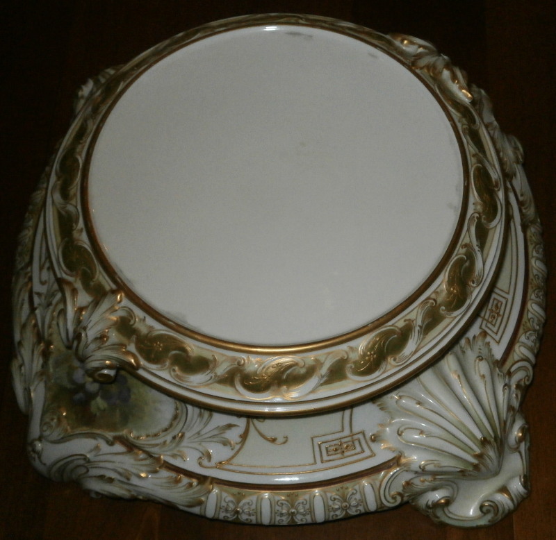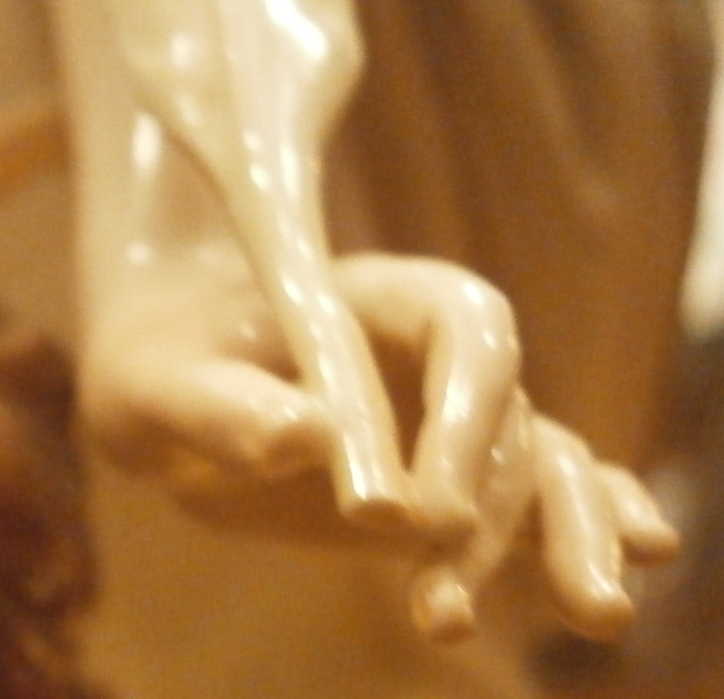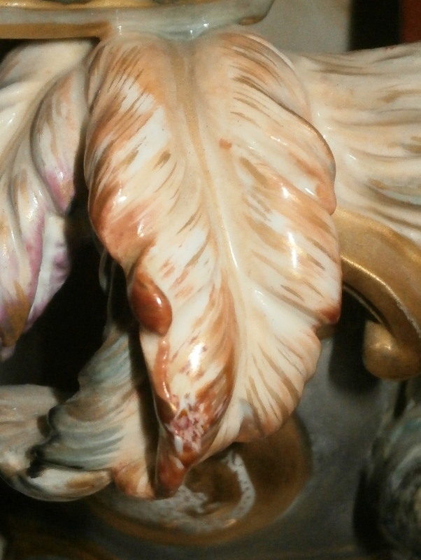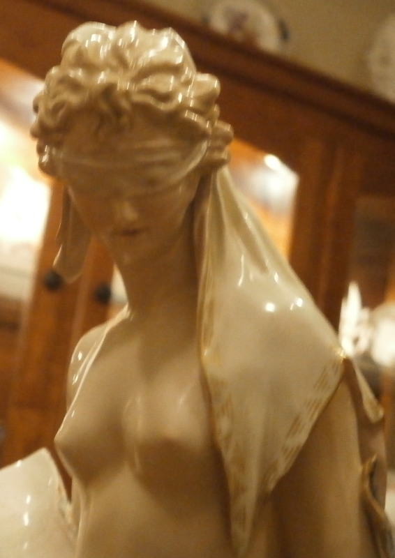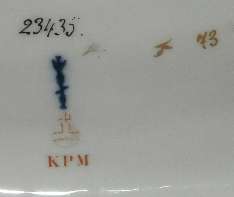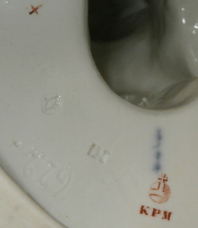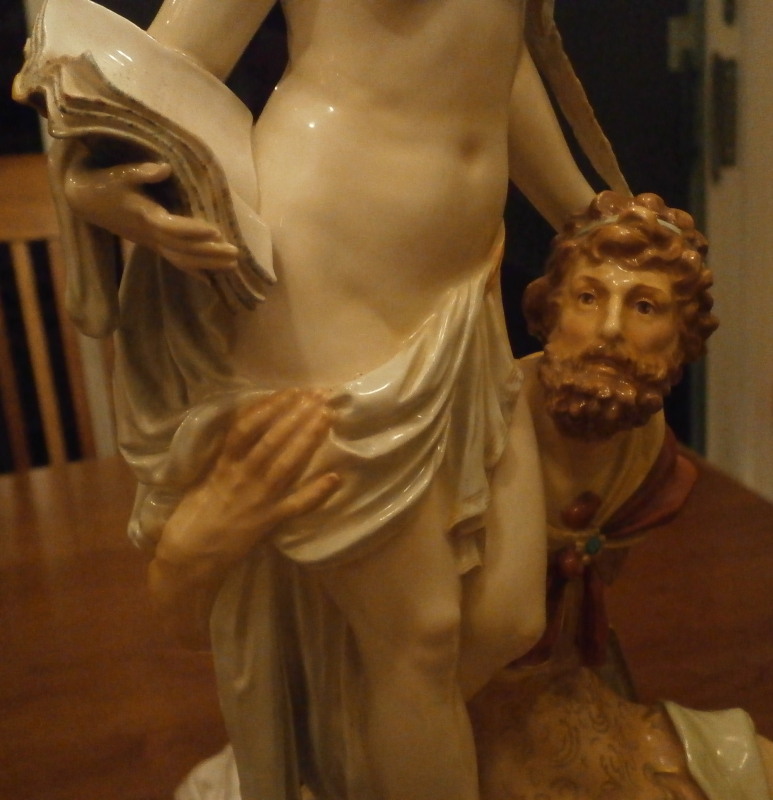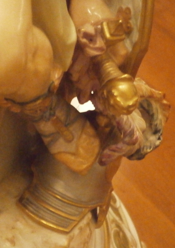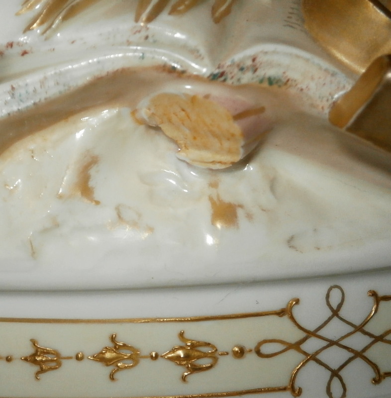 This is an amazing large figurine with a separate base for it made by KPM in the early 20th century. The mythological figurine which was first modeled by F.E. Meyer in the 18th century is of Mars, the god of war sitting below History which looks more like the goddess of justice to me. The figure is modeled with lots of detail and hand painted to perfection in the typical softer color palette of the Art Nouveau period. She is modeled as a blind folded muse that is holding a quill in her left hand and a ledger in her right hand. He is sitting on a block covered by a lion skin with his sword, shield and helmet by his side. The base has a lyre on it, a trumpet, some olive branches I assume, a book, a bow, paint brushes and a white flag (at least that is what it looks like). The already really large figurine comes with its own base / stand that is modeled superbly and hand painted with two Weichmalerei flower panels as well as lots of gilding much of which is raised and some red and green designs to it. Together these two make for a stunning display of one of the largest figures I have ever seen by them. The base is in excellent condition with the tiniest bit of gold wear. The stand is about 4.75 inches tall and has a diameter of 7.5 inches to the top inner part where the figurine sits and the bottom diameter is about 15 inches. The figure is in great condition with the very tip of the bottom end of the quill possibly chipped a tiny bit, one small chip to the red feather of his helmet, two leaves of the olive branch chipped and the bottom end of something that stick out underneath the book on the base is also chipped though I am not sure what that is supposed to be. All of this is really minor and invisible when on display. The piece displays perfectly! The figure is about 18 inches tall with a base diameter of 7.25 inches. Both pieces together are an impressive 23 inches tall!! Both pieces are marked underneath with the under glaze blue scepter, the red orb showing it was painted by KPM as well as various impressed marks normal to this period and painter's marks, etc. as shown. A very similar piece sold at Christie's not too long ago for just over 8K. They ahve better pictures of it as well if you'd like to take a look. Please email me for more information or other pictures.