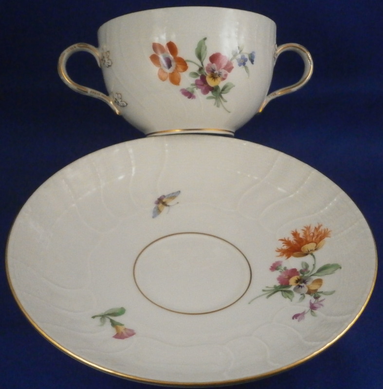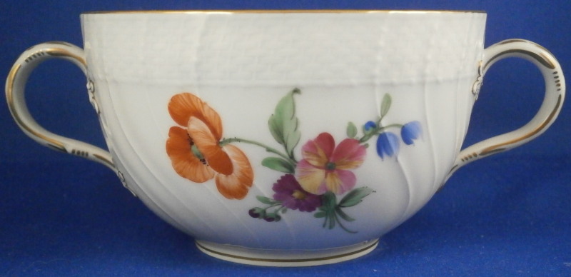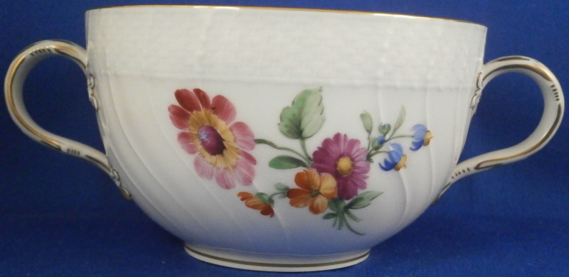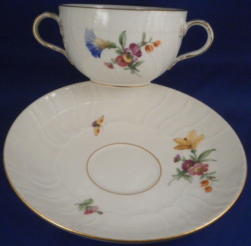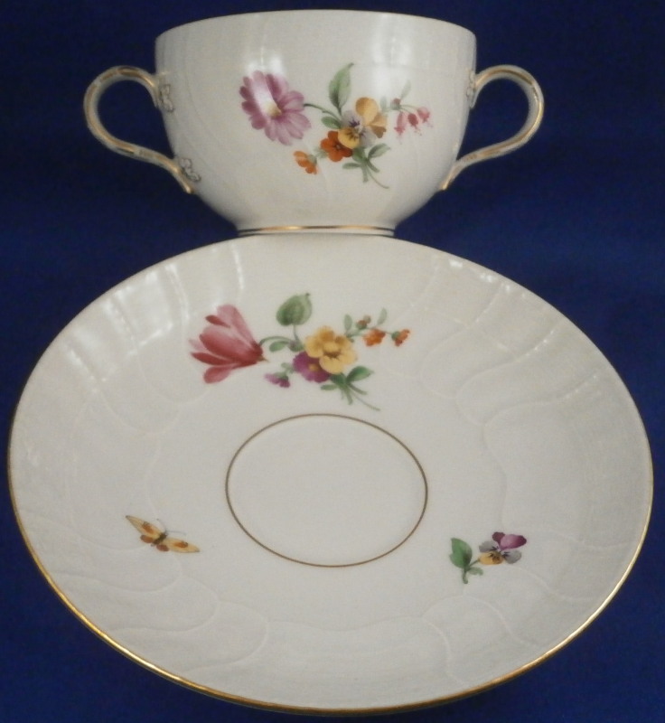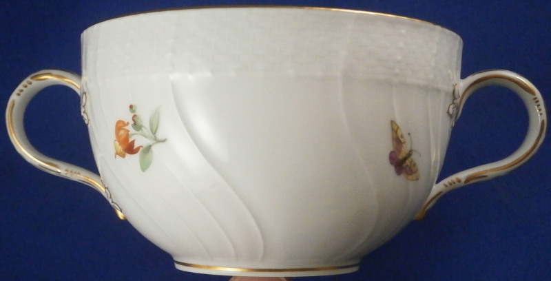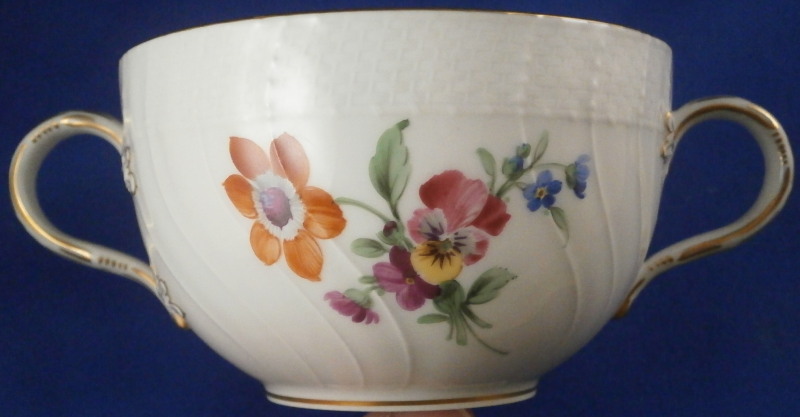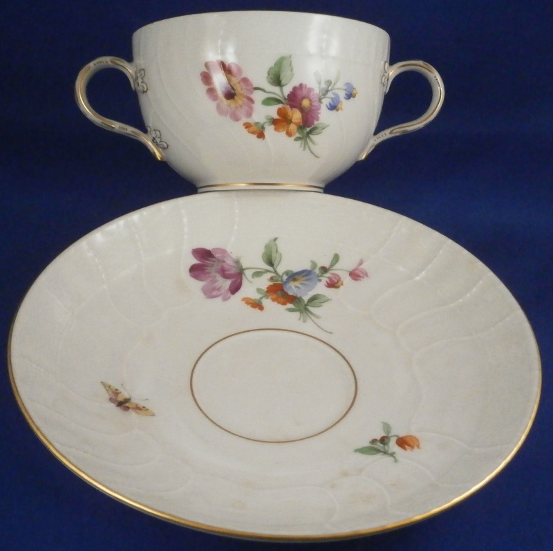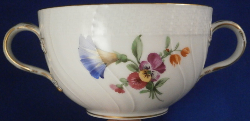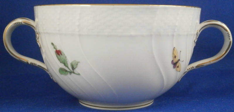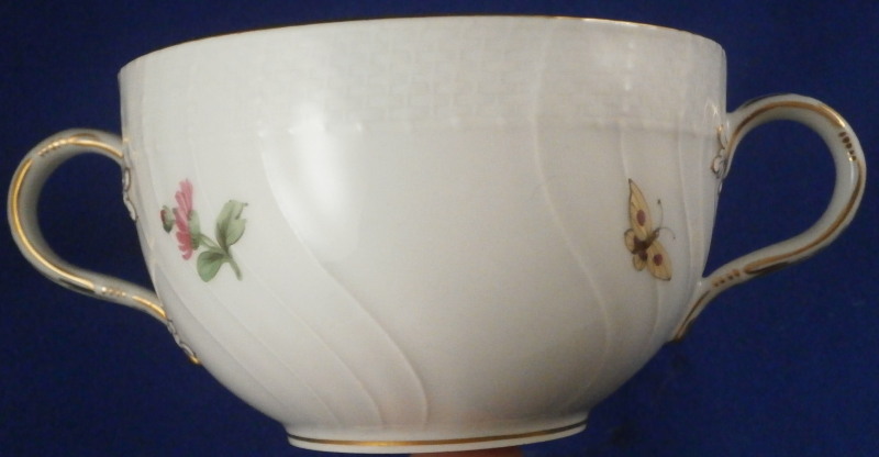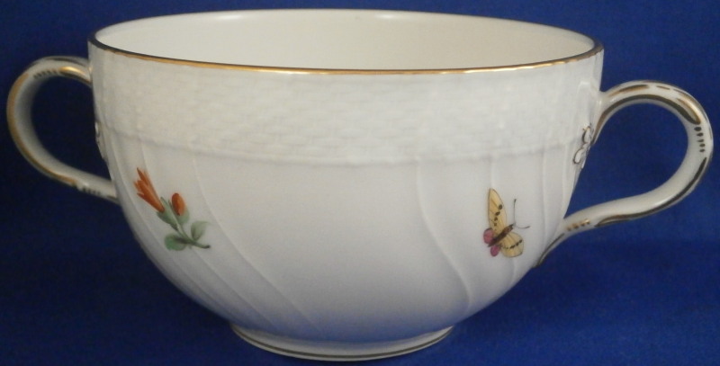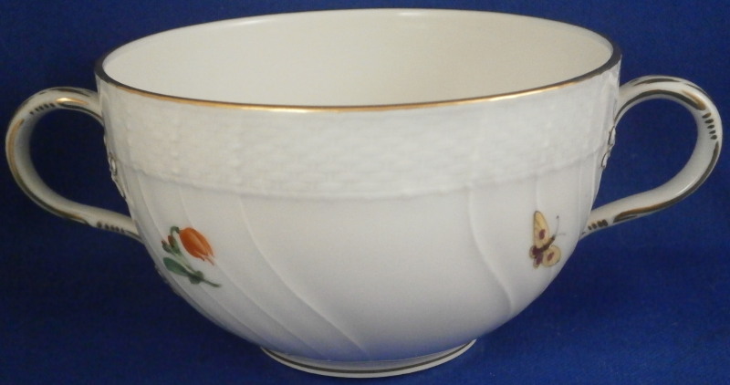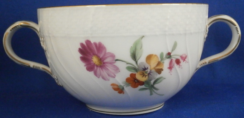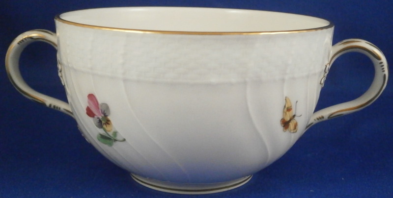 This is a nice set of six boullion / soup cups and saucers in the Neuosier pattern made by KPM in the 20th century. Each piece is hand painted with a nice floral arrangement as well as a single flower and a butterfly with a nice simple gold ring around the edges and some nice gilding to the handles with floral terminals. The paste has a nice basket weave design to the edge as shown. The cups and saucers are all in perfect condition. Each cup and saucer is marked underneath with the underglaze blue scepter as well as the red orb as well as the usual other marks of this period. Each cup is 2.25 inches tall and 3.875 inches in diameter with the handles sticking out on either side. Each saucer is 1.125 inches tall and 6.5 inches in diameter. I will split the set up if need be! Please email me for more information or other pictures.