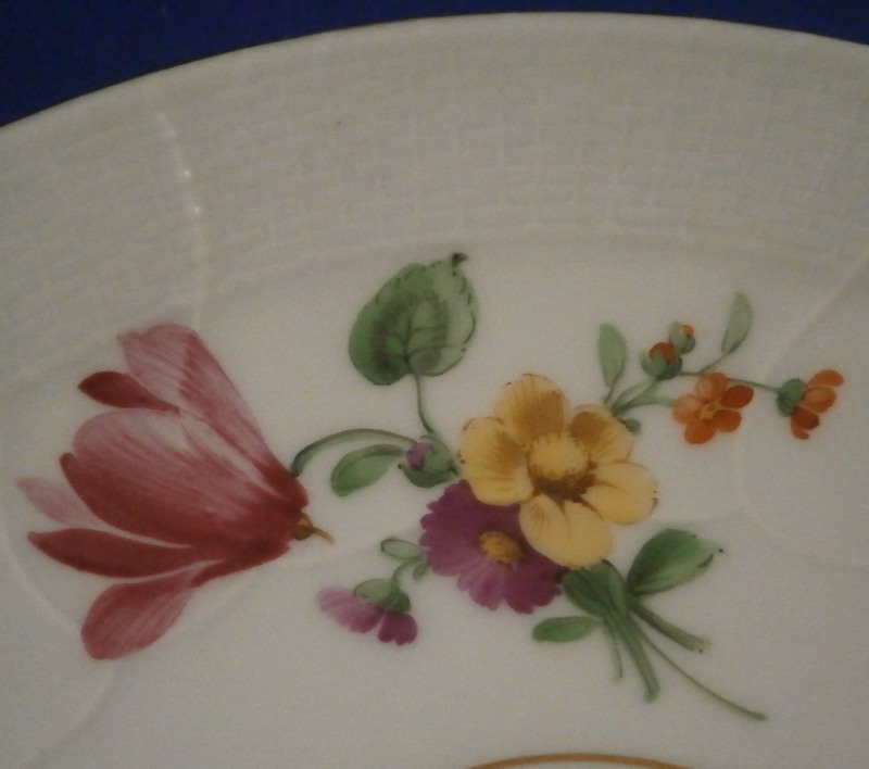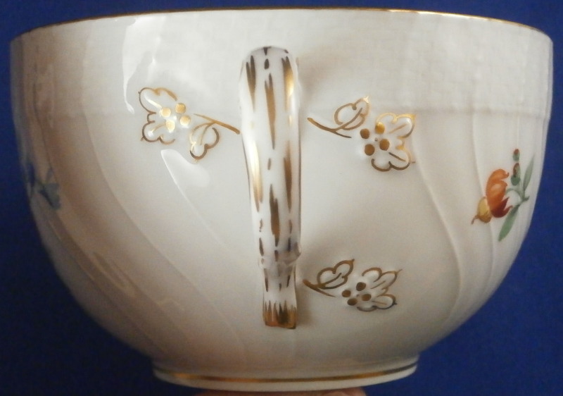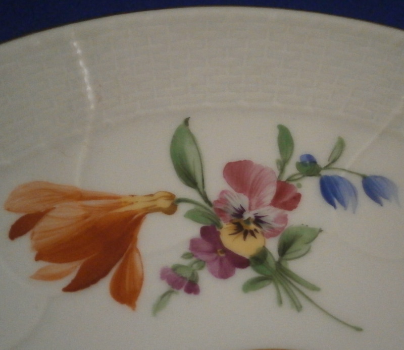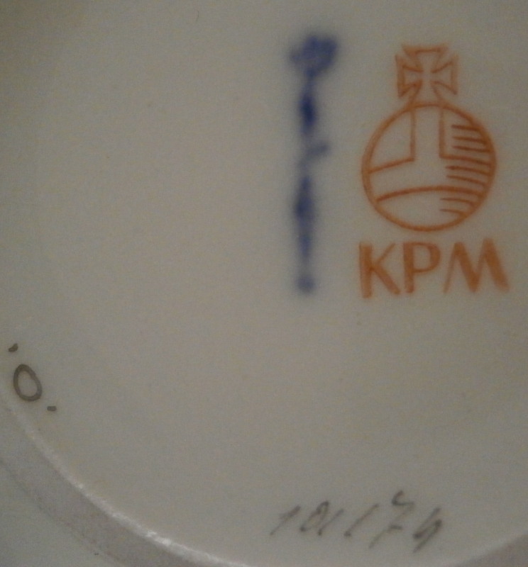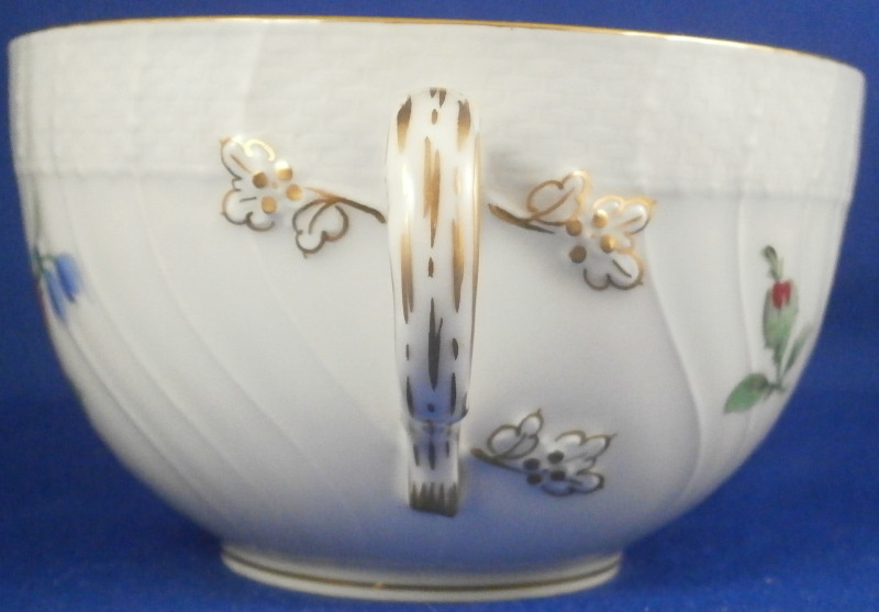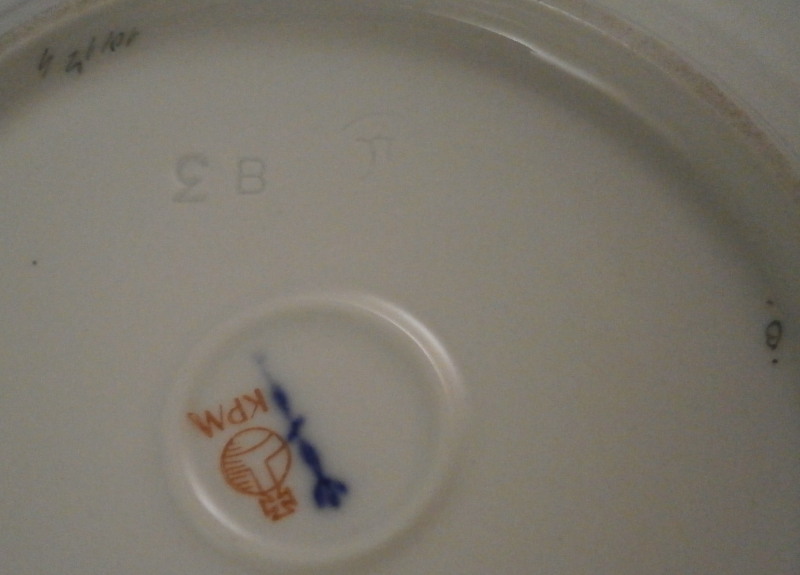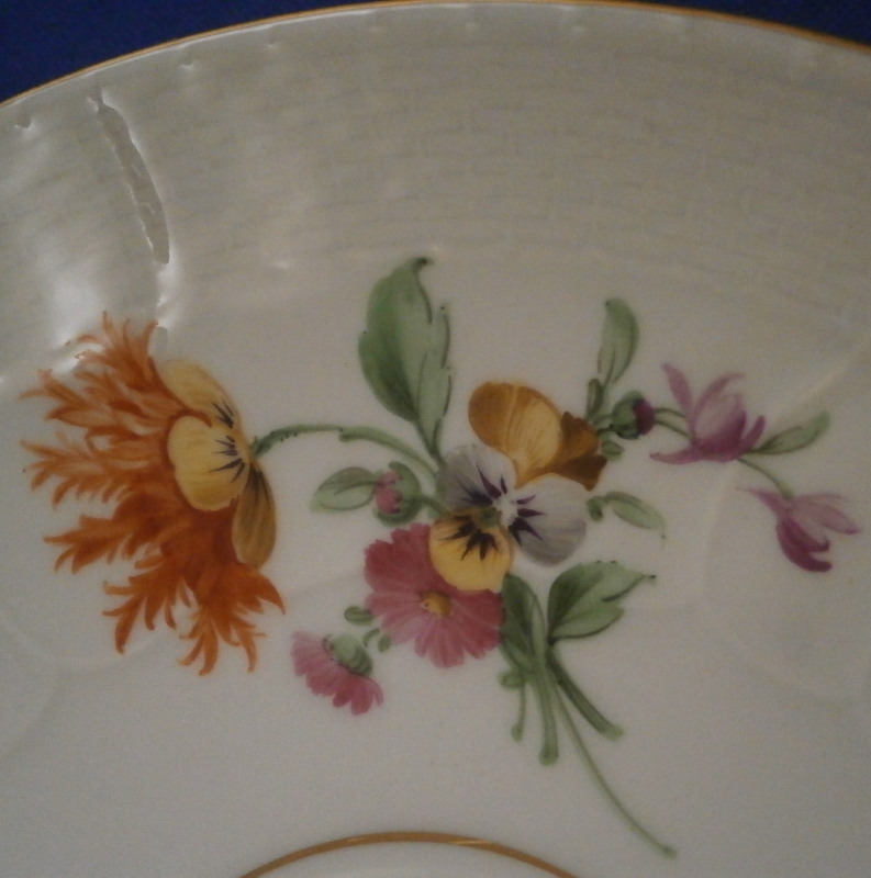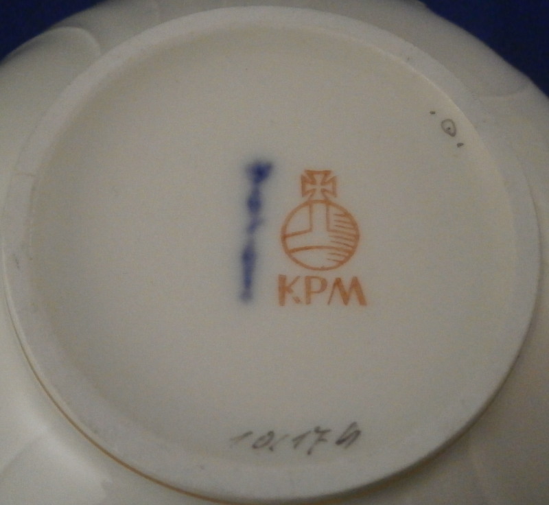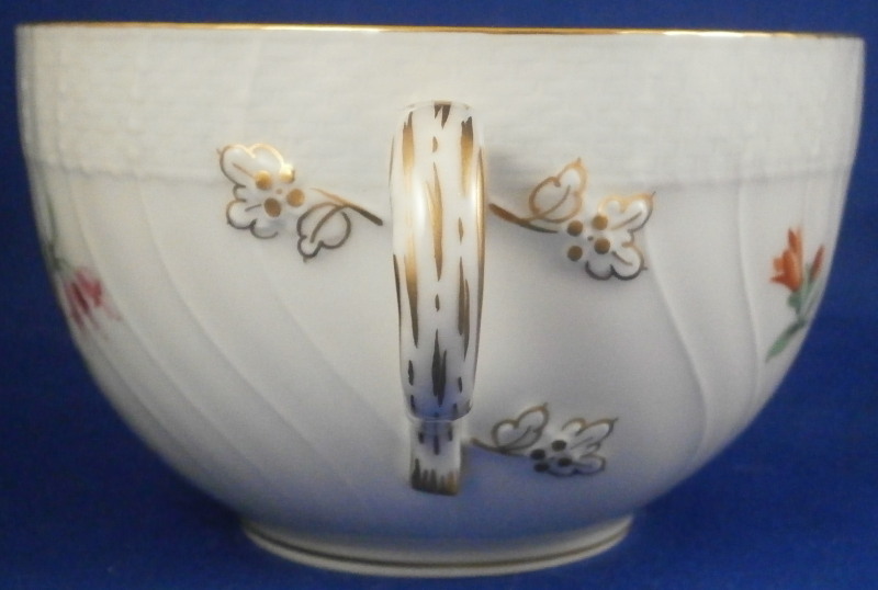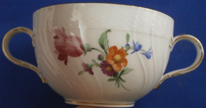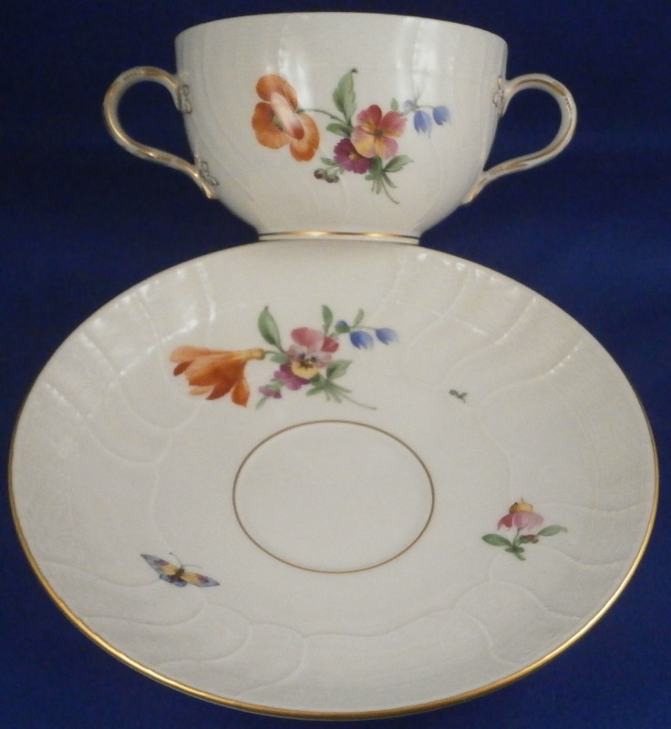 This is a nice set of six boullion / soup cups and saucers in the Neuosier pattern made by KPM in the 20th century. Each piece is hand painted with a nice floral arrangement as well as a single flower and a butterfly with a nice simple gold ring around the edges and some nice gilding to the handles with floral terminals. The paste has a nice basket weave design to the edge as shown. The cups and saucers are all in perfect condition. Each cup and saucer is marked underneath with the underglaze blue scepter as well as the red orb as well as the usual other marks of this period. Each cup is 2.25 inches tall and 3.875 inches in diameter with the handles sticking out on either side. Each saucer is 1.125 inches tall and 6.5 inches in diameter. I will split the set up if need be! Please email me for more information or other pictures.