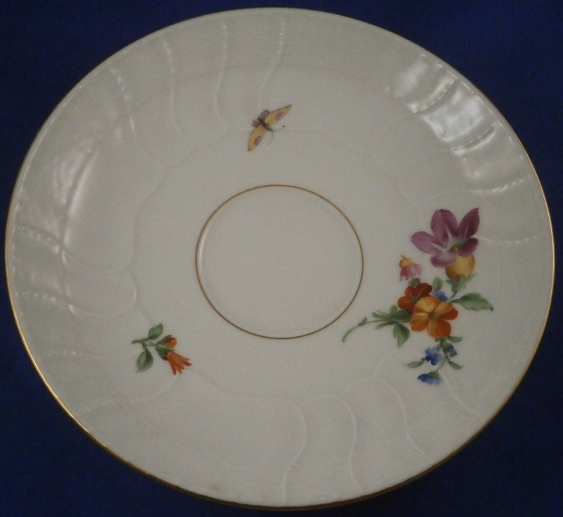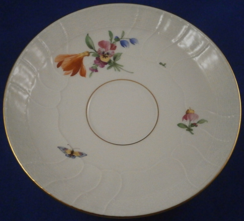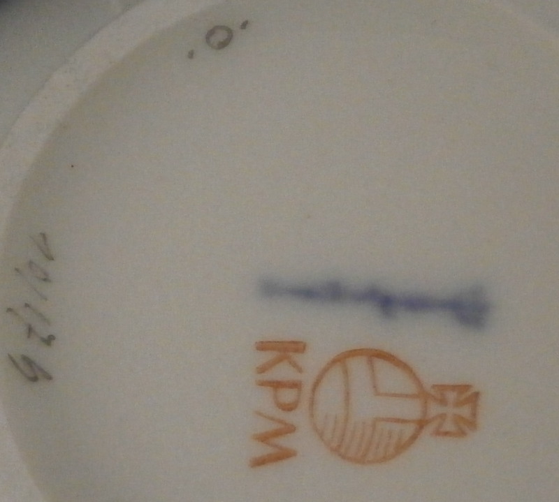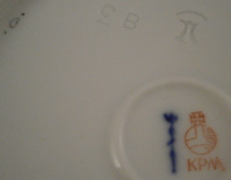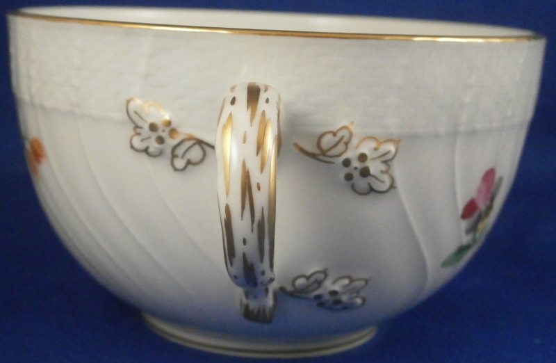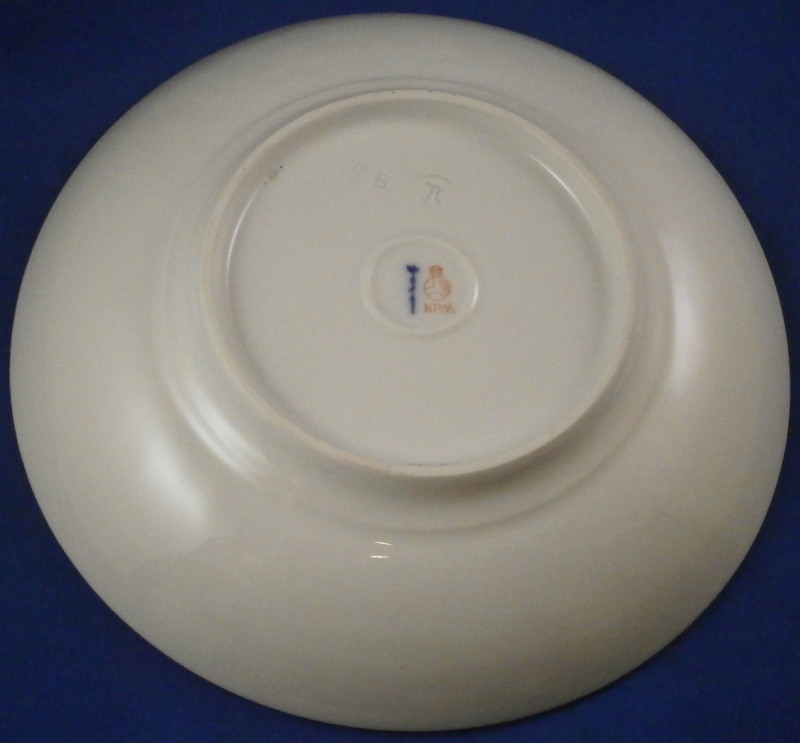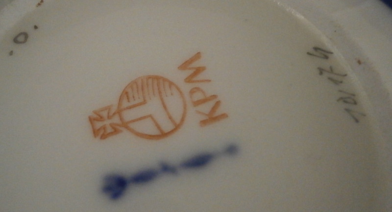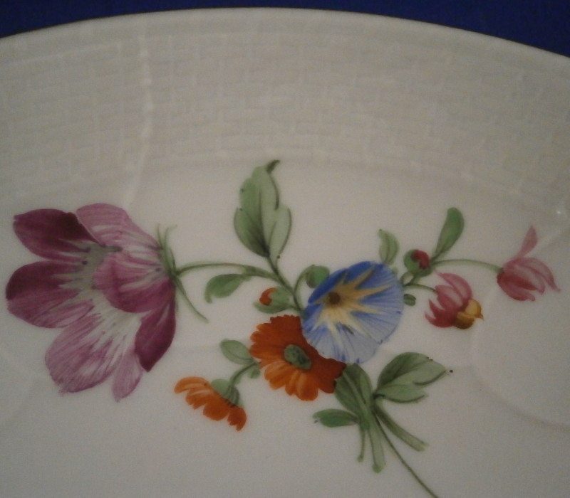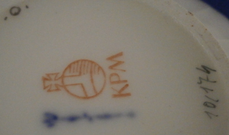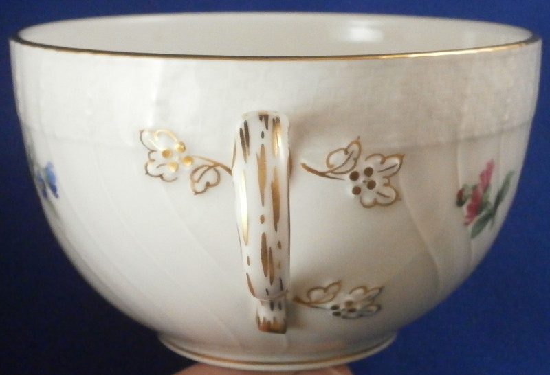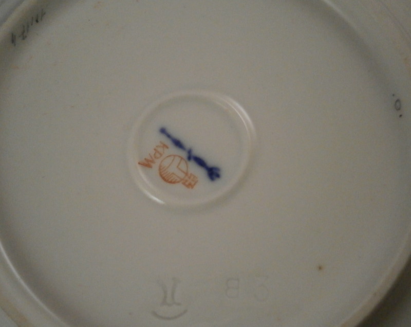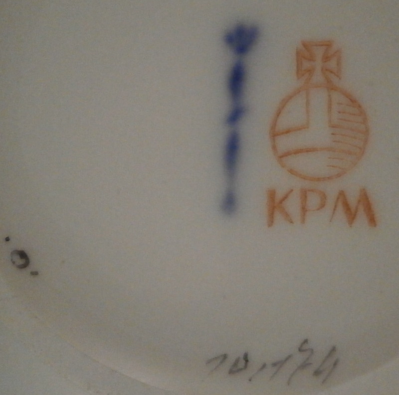 This is a nice set of six boullion / soup cups and saucers in the Neuosier pattern made by KPM in the 20th century. Each piece is hand painted with a nice floral arrangement as well as a single flower and a butterfly with a nice simple gold ring around the edges and some nice gilding to the handles with floral terminals. The paste has a nice basket weave design to the edge as shown. The cups and saucers are all in perfect condition. Each cup and saucer is marked underneath with the underglaze blue scepter as well as the red orb as well as the usual other marks of this period. Each cup is 2.25 inches tall and 3.875 inches in diameter with the handles sticking out on either side. Each saucer is 1.125 inches tall and 6.5 inches in diameter. I will split the set up if need be! Please email me for more information or other pictures.