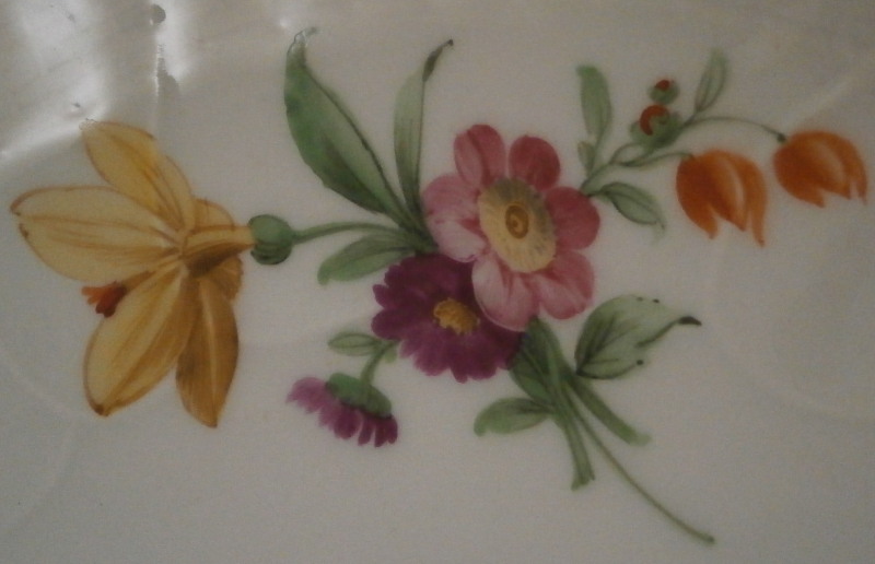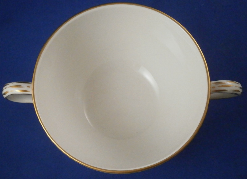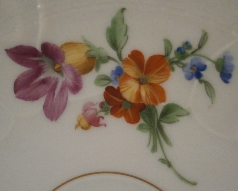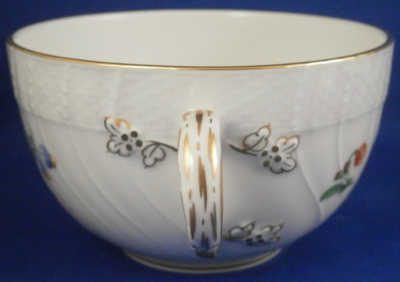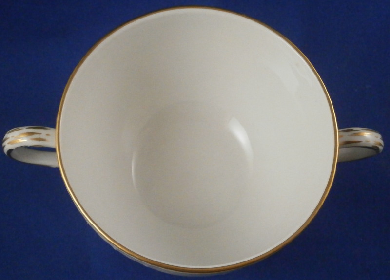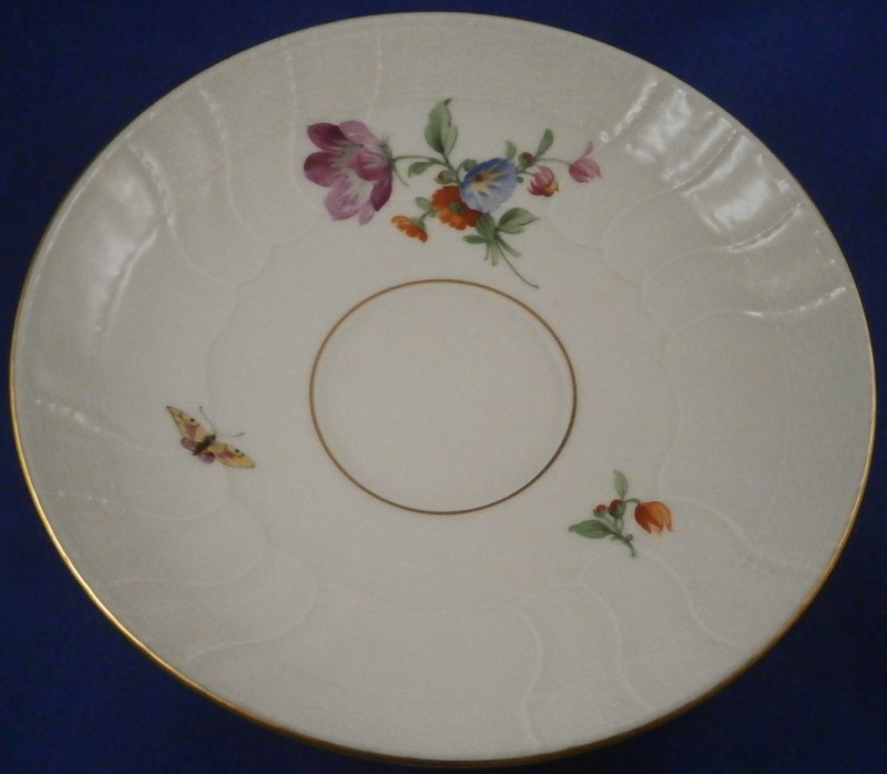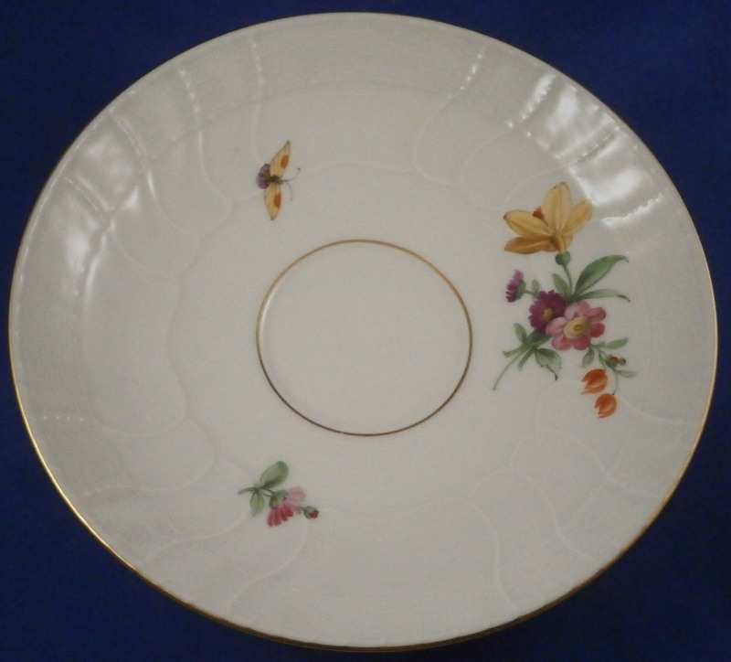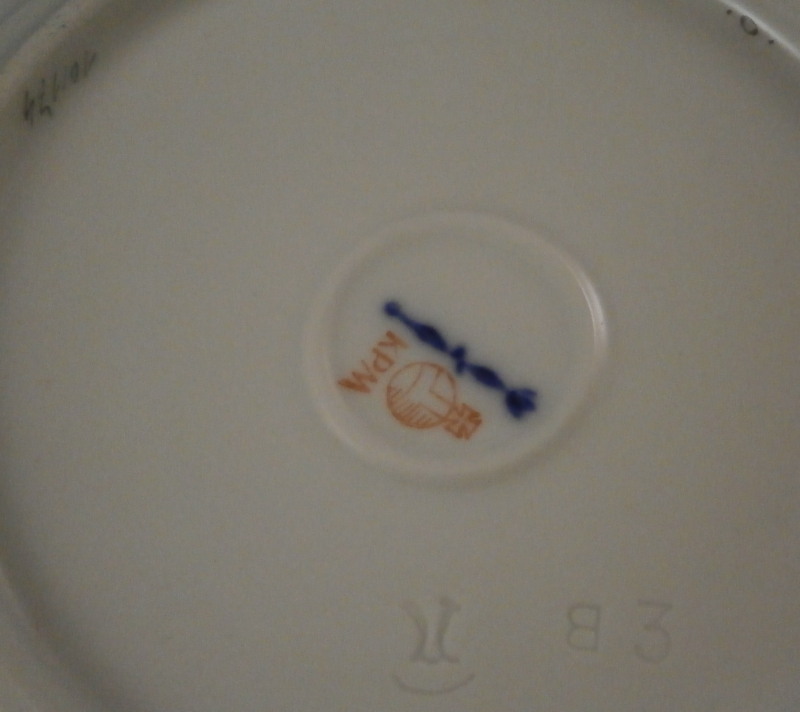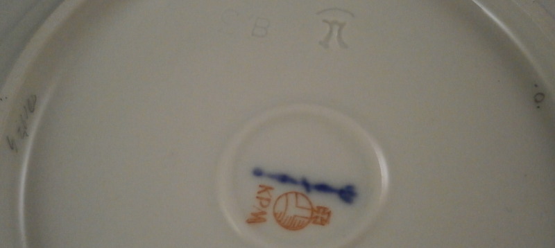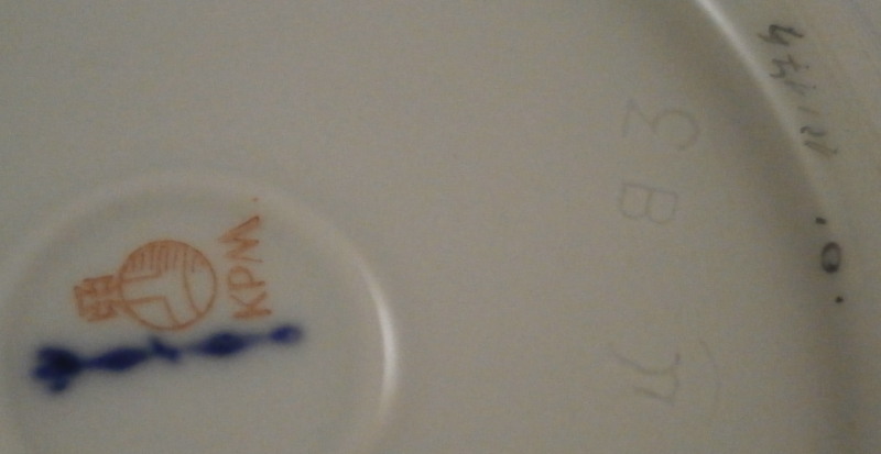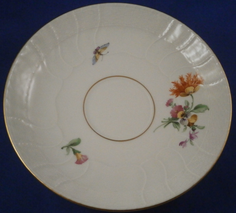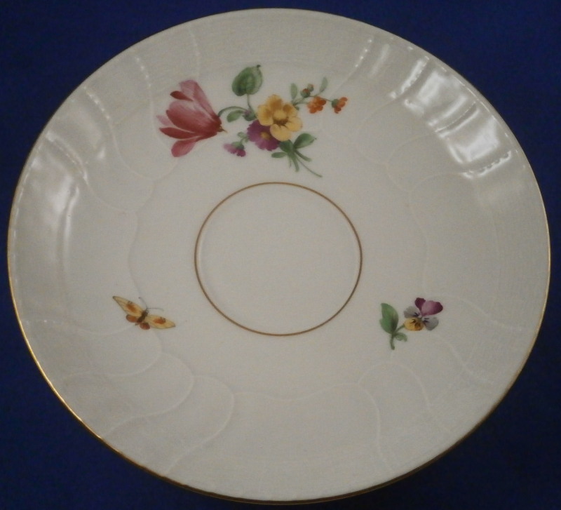 This is a nice set of six boullion / soup cups and saucers in the Neuosier pattern made by KPM in the 20th century. Each piece is hand painted with a nice floral arrangement as well as a single flower and a butterfly with a nice simple gold ring around the edges and some nice gilding to the handles with floral terminals. The paste has a nice basket weave design to the edge as shown. The cups and saucers are all in perfect condition. Each cup and saucer is marked underneath with the underglaze blue scepter as well as the red orb as well as the usual other marks of this period. Each cup is 2.25 inches tall and 3.875 inches in diameter with the handles sticking out on either side. Each saucer is 1.125 inches tall and 6.5 inches in diameter. I will split the set up if need be! Please email me for more information or other pictures.