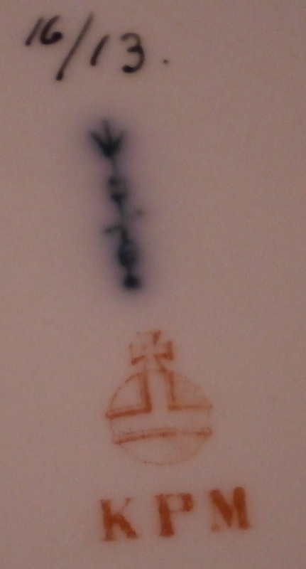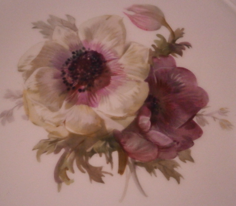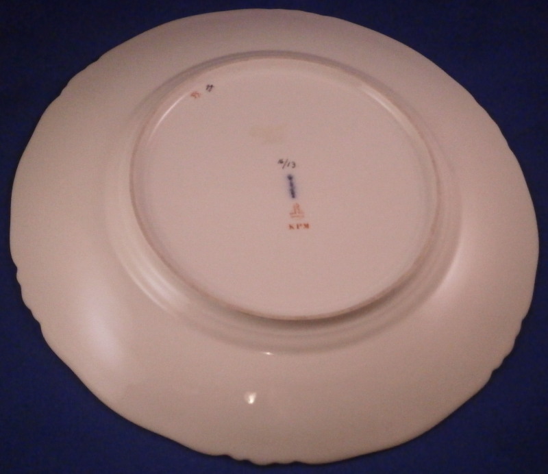This is a really nice plate made by KPM in the early 20th century. It is hand painted with a superb flower design in the center of two anemones with another flower bud and some leaves that is just amazing! The Weichmalerei colors KPM used during this period are among the best ever! The rim itself is painted with gold trim on a raised design. The plate is in perfect condition which is nice since it is over 100 years old now :) It is the rare larger size which is very very hard to find unlike the smaller versions of these plates! The piece is 9.675 inches in diameter and 1 inch tall. The plate is marked underneath with the underglaze blue scepter, the red orb mark, some black numbers, a painter's and / or gilder's mark and the usual impressed marks of this period. Please email me for more information or other pictures.