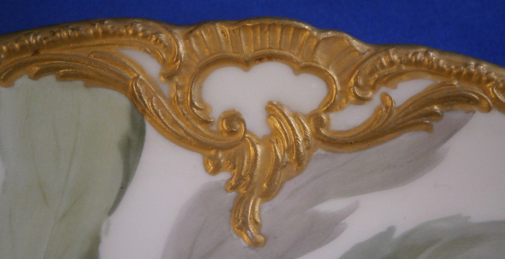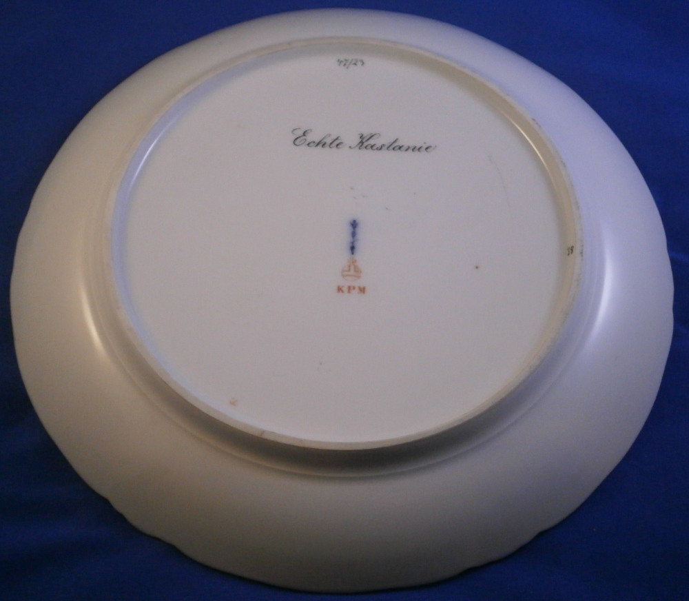 This is a great plate made by KPM in the early 20th century. It is hand painted with the rarest design on these plates of this style - the tree branch / leaf motif. This one is of a branch of a European Chestnut tree including its leaves on a branch but also half opened chestnut which makes this one really superb plate! Kind of the German version of the Flora Danica :) Just an amazingly detailed painting and with the rim painted with gold on a raised design it is just spectacular. The plate is in great condition with one of spot of wear on one of the outer leaves from stacking. Light and not obvious when on display jsut when held at a certain angle to the light. Two scratches to the glaze in the white area also not visible when on display. It is 8.625 inches in diameter so a nice size and 1 inch tall. The plate is marked underneath with the under glaze blue scepter, the red orb mark, some black numbers, a painter's and a gilder's mark, the usual impressed marks of this period as well as the name of the tree - Echte Kastanie in black script. Please email me for more information or other pictures.