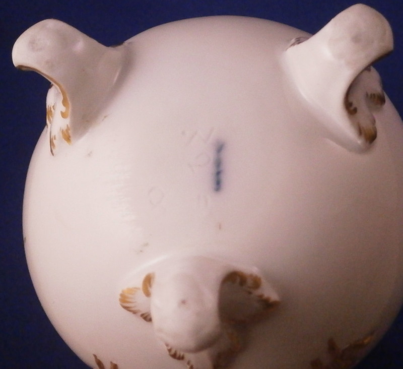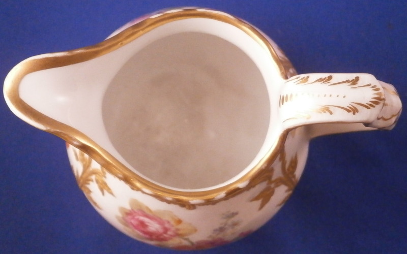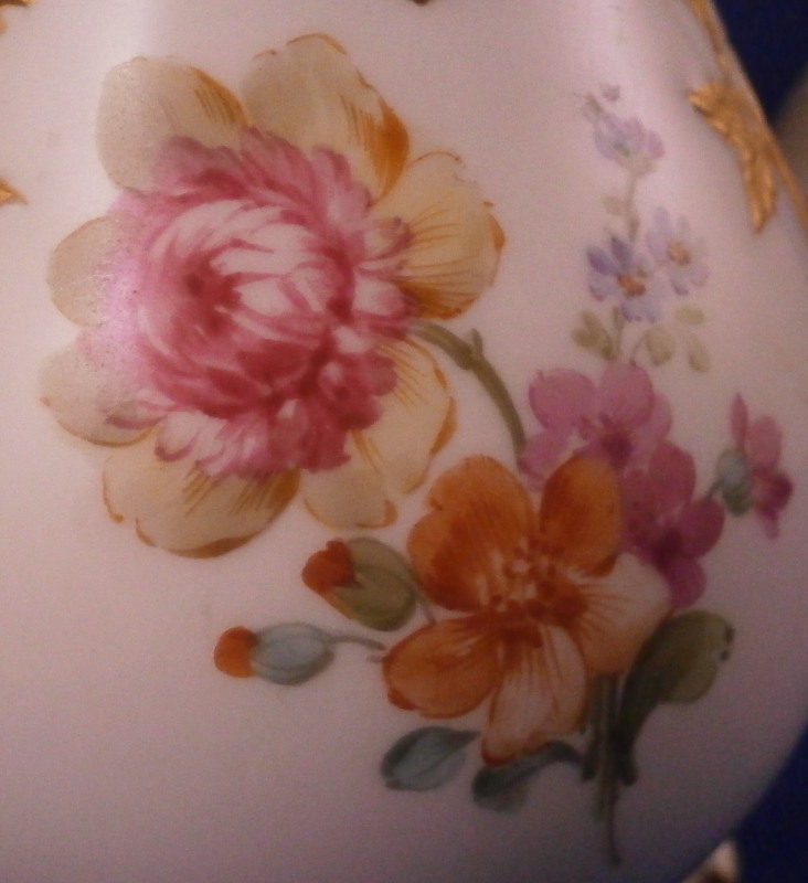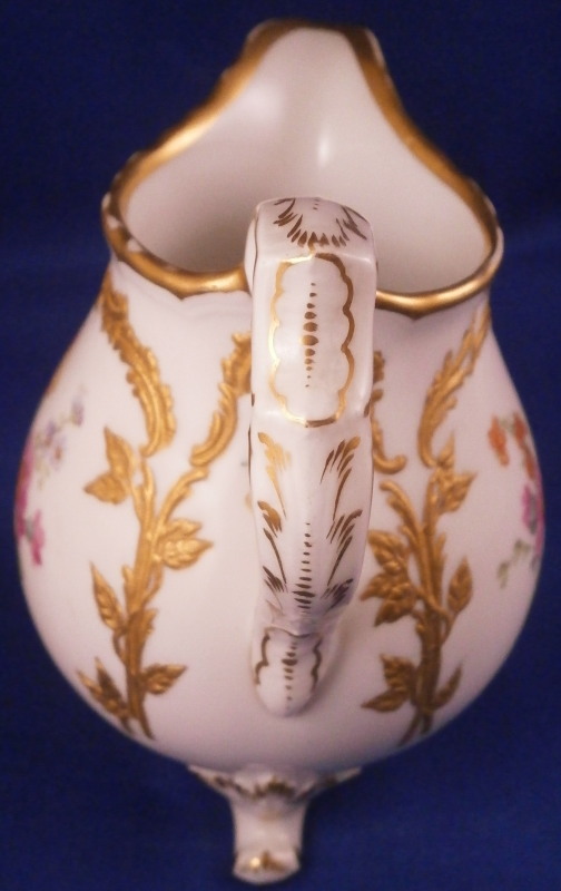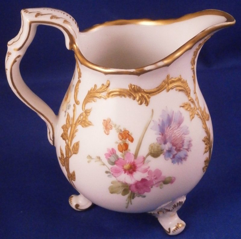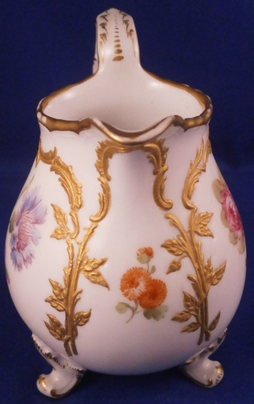 This is hard to find milk pot / creamer / jug / pitcher made by KPM in the early 20th century. It is hand painted with two high quality large floral arrangements - one on either side - as well as two smaller flowers and an amazing raised gold trim. Nice shape to the handle which is also highlighted with gilding and it sits on three little feet with more gilding to them. The piece is in superb condition with a touch of wear to the gilding along the top edge. The piece is 4.125 inches tall including the handle, 3.625 from handle to spout and and 2.75 inches in diameter. It is marked underneath with the under glaze blue scepter as well as the usual impressed marks and it used to have the red orb mark as well but it was sanded off for whatever reason and only a tiny piece of red remains. One can see by the quality and style of the flowers that it was painted by KPM so that is no worry at all. No idea why anyone wanted to do this except to maybe make it appear older than it is?? Please email me for more information or other pictures.