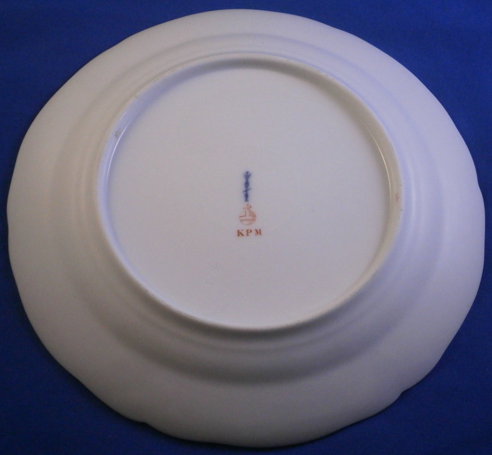 This is a superb dessert plate made by KPM in the early 20th century. The design is called Neuzierat and this is the version with the spaces between the raised design and the rims left white and not fully gilded. The piece is hand painted superbly along the rim with three larger floral arrangements and three small flowers and has a superb raised gold trim in between that juts out into the well of the plate. A single flower adorns the center. The dish is marked underneath with the under glaze blue scepter mark as well as the red orb, a gilder's and painter's mark and the usual impressed marks as shown. It is in great condition with the stems of one of the floral arrangements mostly gone which was probably a firing issue and some very minor wear to the gilding along the very edge. It displays superbly! The plate is 0.875 inches tall and 7.375 inches in diameter. Please email me for more information or other pictures.