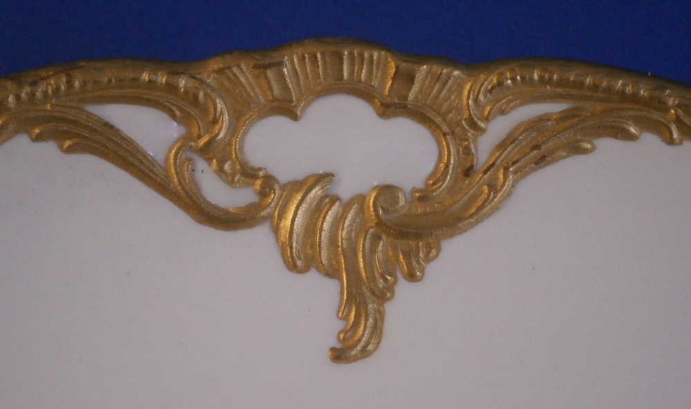 This is a great plate made by KPM in the early 20th century. It is from their Neuzierat line which happens to be one of my personal favorites! The piece is hand painted in the center with a superb still life type fruit scene including a nice large red pear with its leaf and a few green grapes on their stalk. And as if the quality of the painting is not nice enough the edge has this superb relief design to it that has been fully gilded to look amazing. That combo is hard to beat and makes this one elegant plate! It is in perfect condition. The dish is about 1 inch tall with a diameter of 8.625 inches. It is marked underneath with the under glaze blue scepter, the red orb mark as well as the usual impressed and painter's / gilder's marks as shown. Please email me for more information or other pictures.