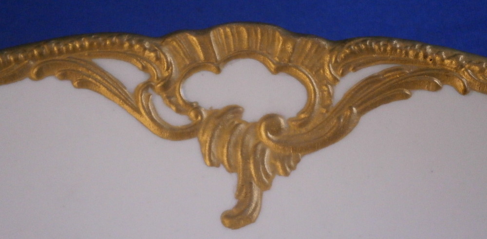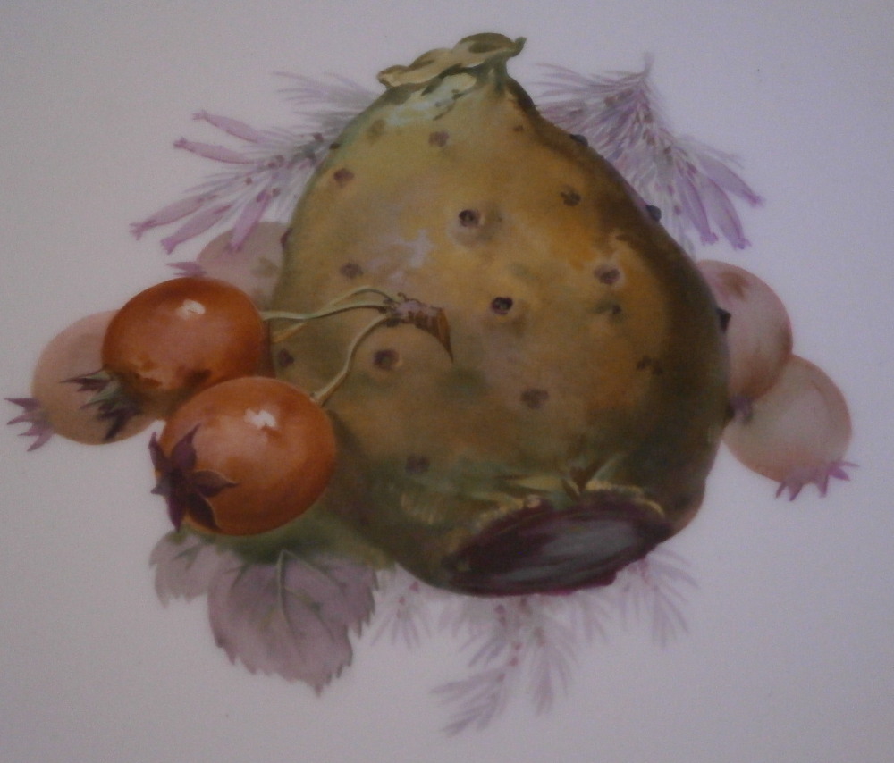 This is a great plate made by KPM in the early 20th century. It is from their Neuzierat line which happens to be one of my personal favorites! The piece is hand painted in the center with a superb still life type fruit scene including a cool cactus fruit with some red berries next to it and branches of a flowering bush in the background as well as some leaves. And as if the quality of the painting is not nice enough the edge has this superb relief design to it that has been fully gilded to look amazing. That combo is hard to beat and makes this one elegant plate! It is in perfect condition. The dish is about 1 inch tall with a diameter of 8.625 inches. It is marked underneath with the under glaze blue scepter, the red orb mark as well as the usual impressed and painter's / gilder's marks as shown. Please email me for more information or other pictures.