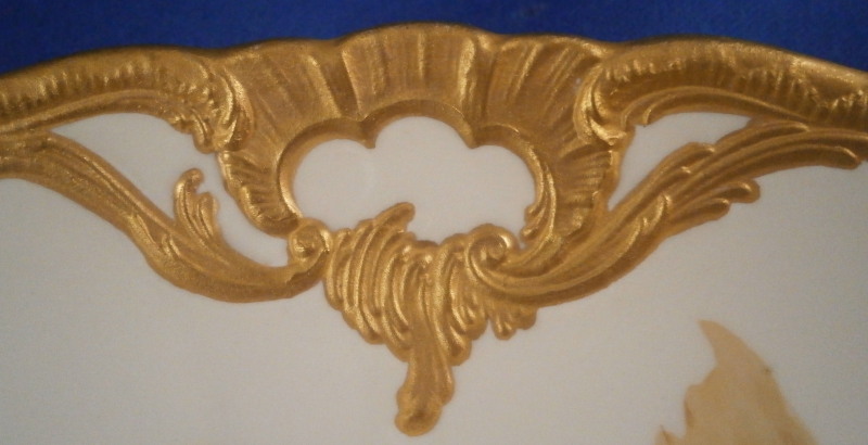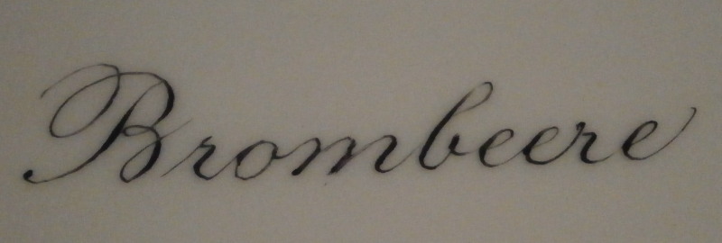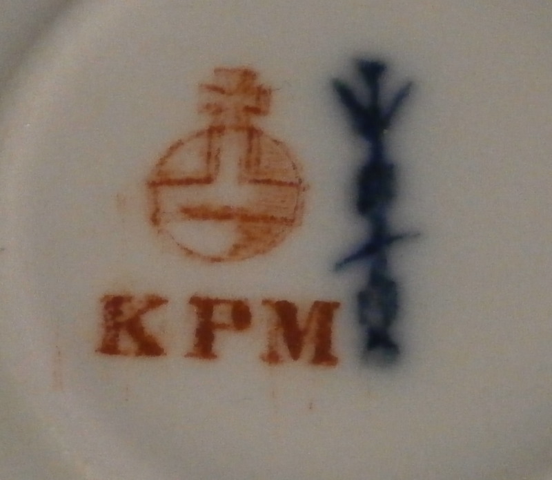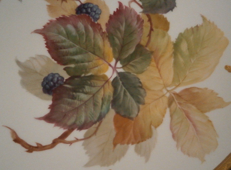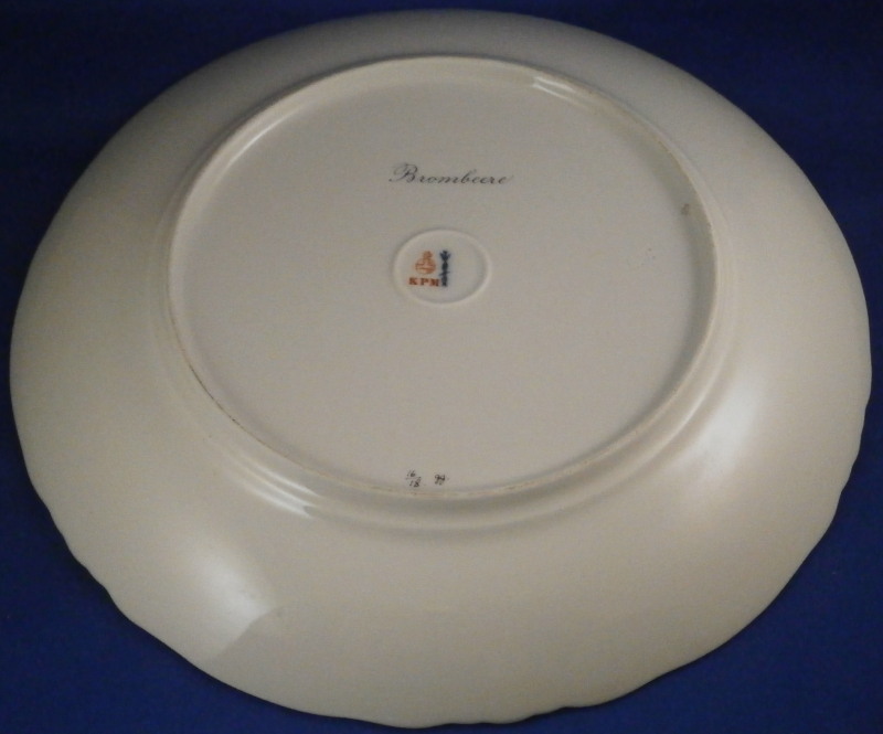 This is a superb plate made by KPM in the early 20th century. It is hand painted with the rarest design on these plates of this style - the tree branch / leaf motif. This one is of a piece of a blackberry with the leaves and berries coming of the vine . Kind of the German version of the Flora Danica :) Just an amazingly detailed painting. The rim itself is painted with gold on a raised design. The plate is in perfect condition. It is the very rare large size being 10.75 inches in diameter and 1.375 inches tall. This size is almost impossible to find! The plate is marked underneath with the underglaze blue scepter, the red orb mark, some black numbers, a painter's mark near the foot and the usual impressed marks of this period as well as the word Brombeere in black which off course means Blackberry. Please email me for more information or other pictures.