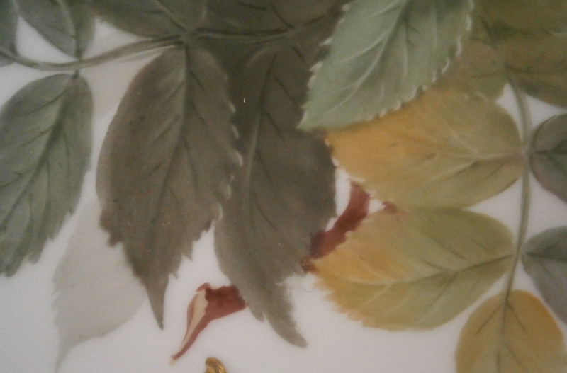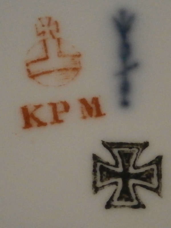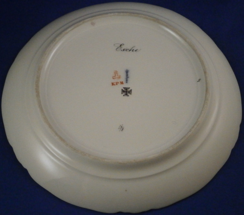This is a cute plate made by KPM in the early 20th century. It is hand painted with the rarest design on these plates of this style - the tree branch / leaf motif. This one is of branch of an Ash tree including its leaves in different colors and branch which in combination with that amazing gold trim makes this one really superb plate! Kind of the German version of the Flora Danica :) Just an amazingly detailed painting and the with rim painted with gold on a raised design it is just spectacular. The plate is in perfect condition. It is 7.375 inches in diameter so the smaller version and 0.875 inches tall. The plate is marked underneath with the under glaze blue scepter, the red orb mark, the iron cross, some black numbers, a painter's and a gilder's mark, the usual impressed marks of this period and the name of the tree - Esche in black script. I have five other matching plates if anyone would like a pair or a set of these. These are perfect for display! Please email me for more information or other pictures.