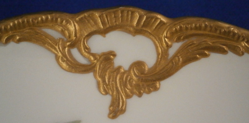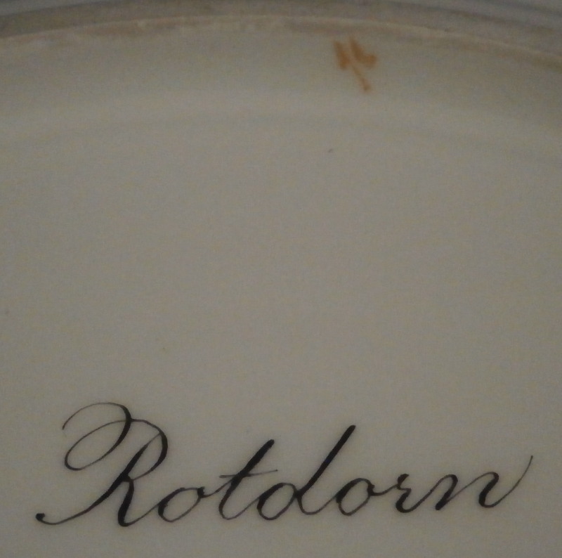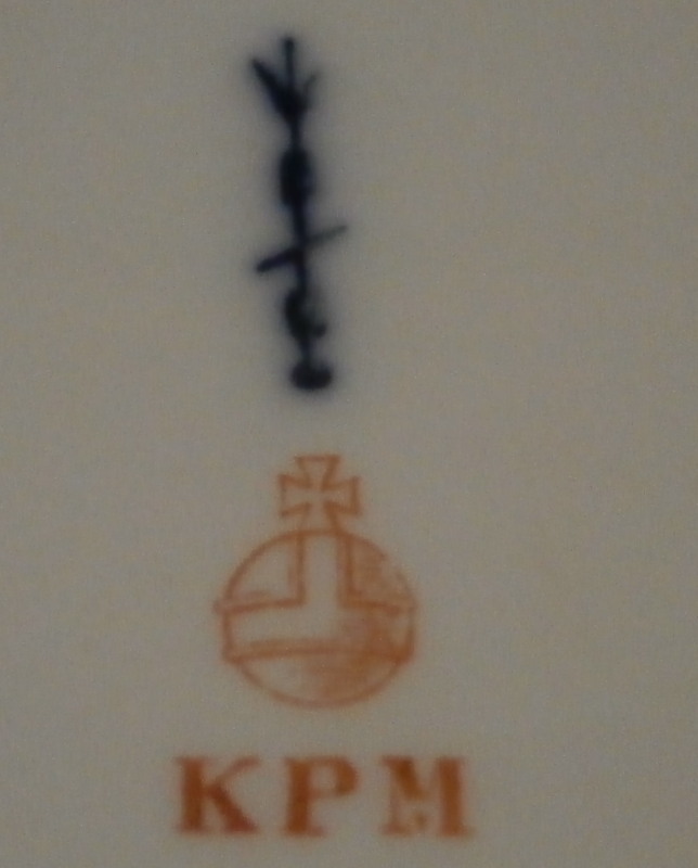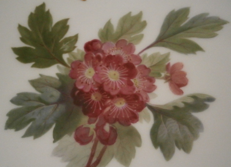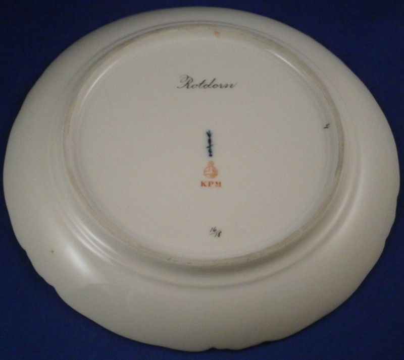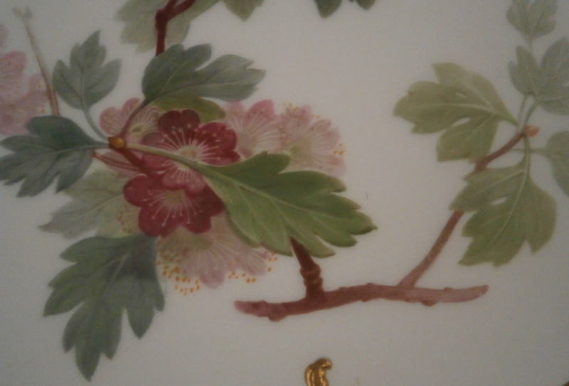 This is a cute plate made by KPM in the early 20th century. It is hand painted with the rarest design on these plates of this style - the tree branch / leaf motif. This one is of branch of the Hawthorn tree including its leaves with those amazing red blossoms and the branch which in combination with that amazing gold trim makes this one really superb plate! Especially the red of the flower pop and make this a very special palte! Kind of the German version of the Flora Danica :) Just an amazingly detailed painting and the with rim painted with gold on a raised design it is just spectacular. The plate is in perfect condition. It is 7.375 inches in diameter so the smaller version and 0.875 inches tall. The plate is marked underneath with the under glaze blue scepter, the red orb mark, some black numbers, a painter's and a gilder's mark, the usual impressed marks of this period and the name of the tree - Rotdorn in black script. I have five other matching plates if anyone would like a pair or a set of these. These are perfect for display! Please email me for more information or other pictures.