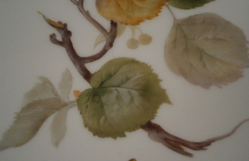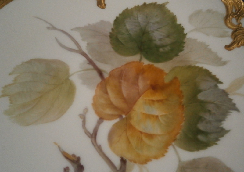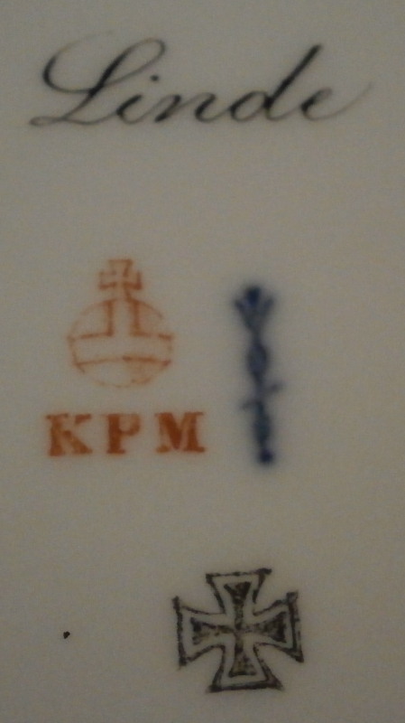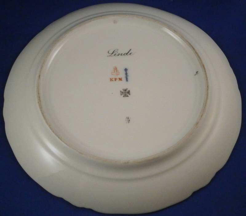 This is a cute plate made by KPM in the early 20th century. It is hand painted with the rarest design on these plates of this style - the tree branch / leaf motif. This one is of branch of the Linden tree also knowns as Lime Bushes or Basswood including its leaves in different colors and the branch which in combination with that amazing gold trim makes this one really superb plate! Kind of the German version of the Flora Danica :) Just an amazingly detailed painting and the with rim painted with gold on a raised design it is just spectacular. The plate is in perfect condition. It is 7.375 inches in diameter so the smaller version and 0.875 inches tall. The plate is marked underneath with the under glaze blue scepter, the red orb mark, the black iron cross mark, some black numbers, a painter's and a gilder's mark, the usual impressed marks of this period and the name of the tree - Linde in black script. I have five other matching plates if anyone would like a pair or a set of these. These are perfect for display! Please email me for more information or other pictures.
