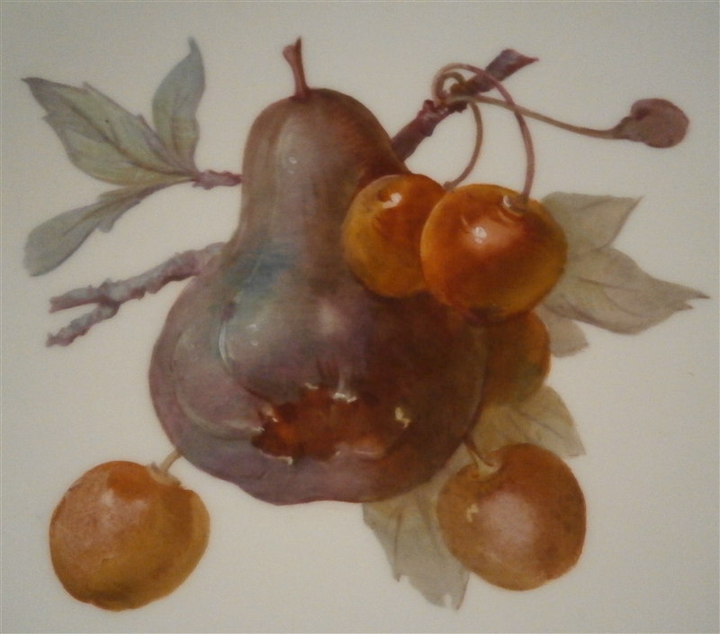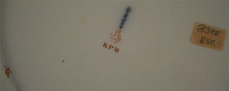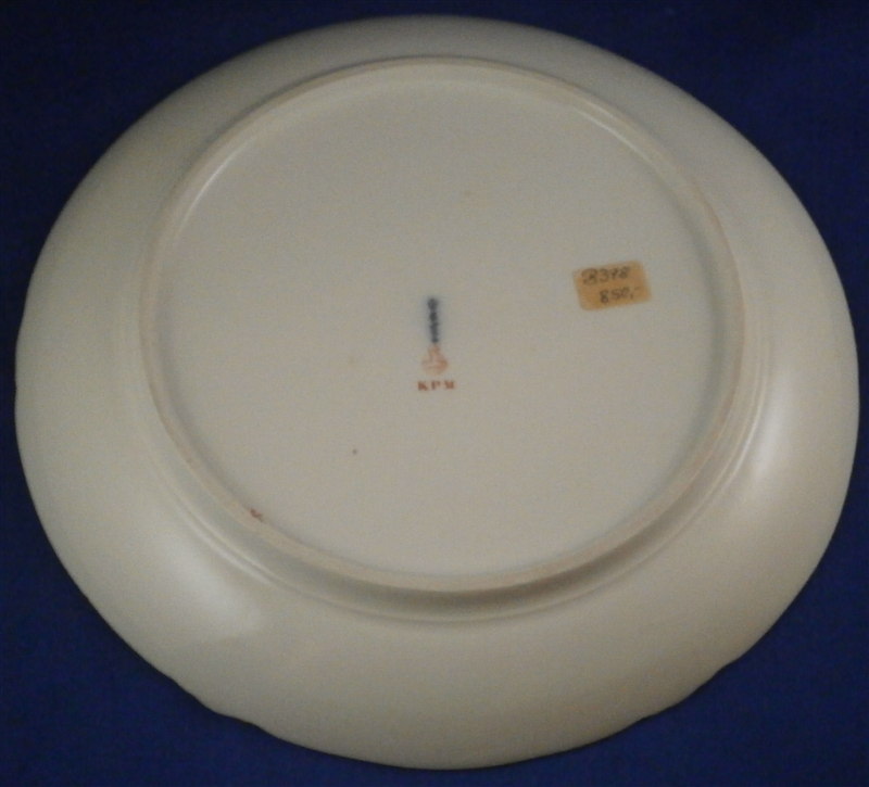 This is a plate made by KPM in the early 20th century. It is hand painted with a superb fruit still life of a pear (not sure it is a pear) and some cherries with their leaves in the center as well as a superb raised gold trim. These plates do look amazing on the wall especially in your kitchen! Superb quality of the painting! The plate is in perfect condition. It is 1 inch tall and 8.625 inches in diameter. It is marked underneath with the underglaze blue scepter, the red orb mark, some painter's mark as well as the usual impressed marks of the period. Please email me for more information or other pictures.