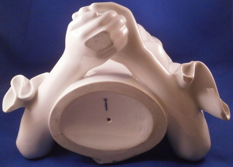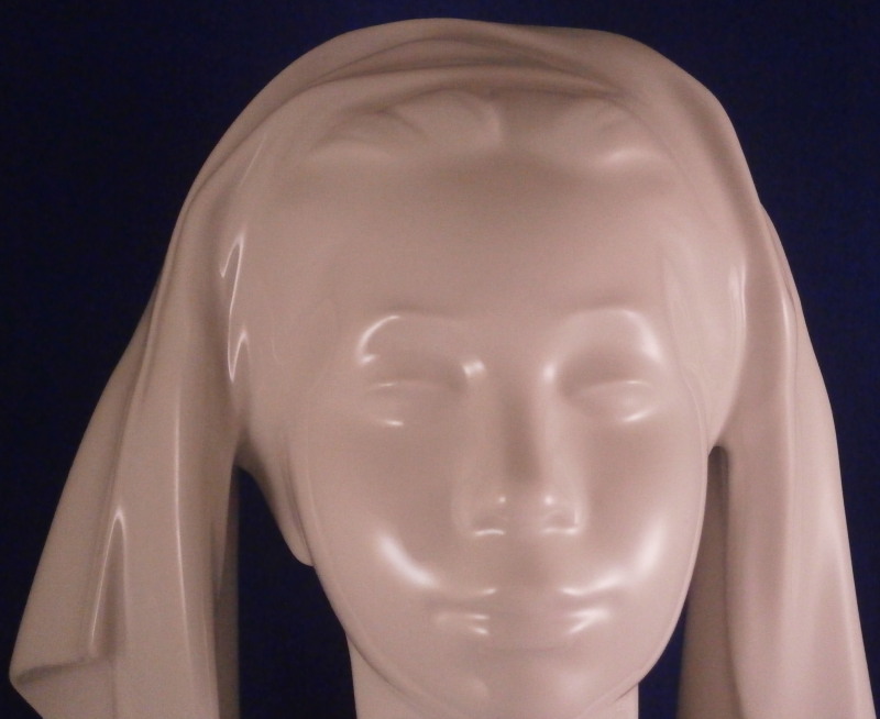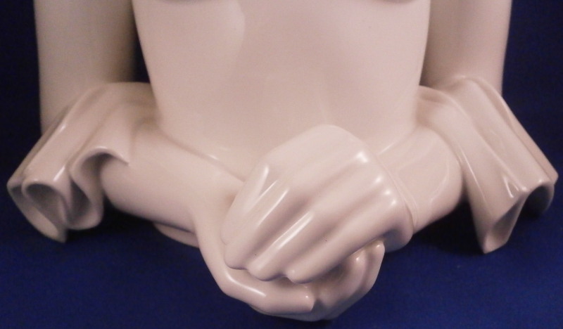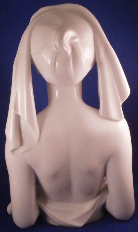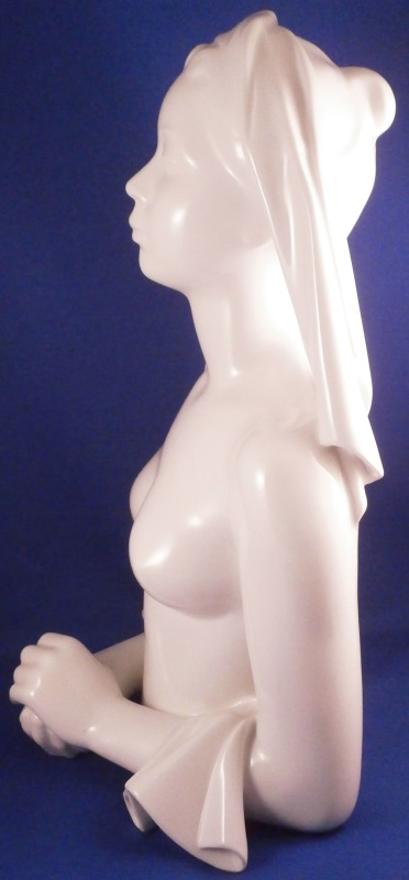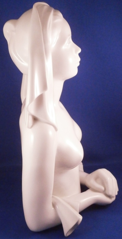 This is a large and superb figural bust of a nude lady made by KPM in the 20th century. The piece was first designed by Siegmund Schütz in about 1951 and is titled Nausikaa and she looks to be from the early years around when she was first designed though the date code is hard to figure out. The figurine is of a lady with a cloth over her head, her bust exposed with her hands folded in front of her. The piece was first designed by Siegmund Schütz in about 1951 and is titled Nausikaa (a character in Homer's Odyssey - she was the daughter of King Alcinous and Queen Arete of Phaeacia). It is superbly modeled and rather large piece that is stunning. The figure is in perfect condition. The figurine is marked underneath with the under glaze blue scepter mark as well as the usual impressed marks of the period. The figure is 12.25 inches tall, 5.5 inches deep and 7.5 inches wide. Please email me for more information or other pictures.