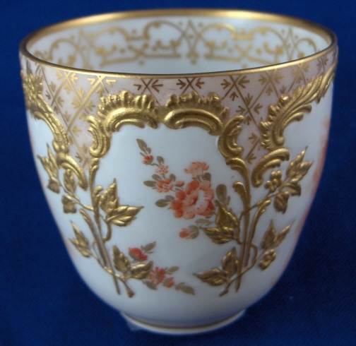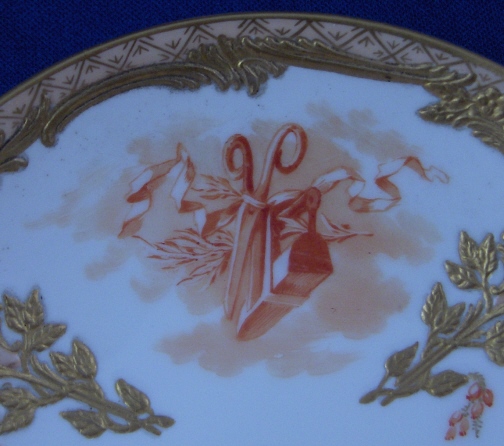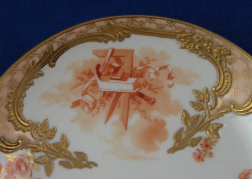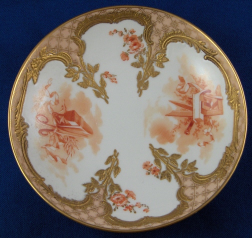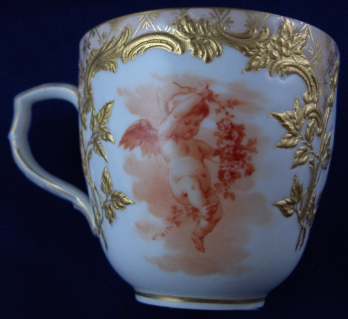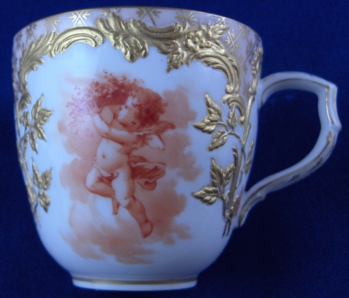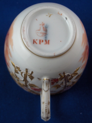 This is a cup and saucer made by KPM in the early 20th century. The cup is nicely handpainted with two orange scenes of a cherub in the clouds with some flowers as well as the nice gold trim of the Neuzierat line of porcelain. It is a raised leaf design painted with gilding and also has a nice gilding to the inside of the cup. The top rim is filled in with a peach ground color and a gold design which makes this extra nice. Nice handle shape! The saucer has two orange scenes of a more artsy nature with some woodworking tools including a plane on one side and an iron and a pair of scissors on the other. Same gold trim and orange flowers as the cup. Both pieces are in perfect condition. Both are marked underneath with the underglaze blue scepter mark, the red orb as well as various painter's / gilder's marks and the usual impressed marks of this period. There are also the usual impressed marks. The cup is 2.25 inches tall and 2.375 inches in diameter. The saucer is 1 inch tall and 4.5 inches in diameter. Please email me for more information or other pictures.