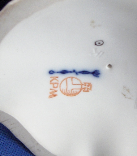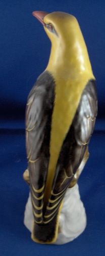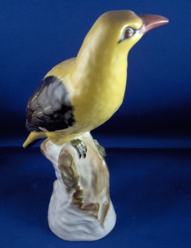 This is a bird made by KPM around 1911. It is a golden Oriole and it is handpainted with great attention to detail down to the feathers on the wings. The bird is in great condition with a shallow small glaze chip to the bottom edge in the back. Need to look for it to see it. The figurine is 8.5 inches tall, 5.5 inches deep and 2.5 inches wide. It is marked underneath with the underglaze blue scepter and the red orb mark as well as impressed 1K and a black circle with a dot in it which would be a painters mark. Please email me for more information or other pictures.