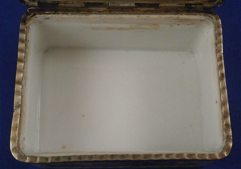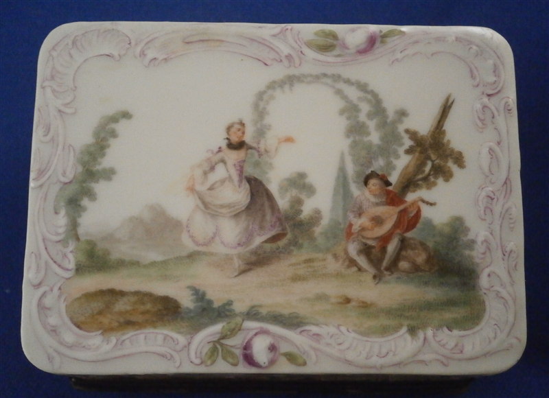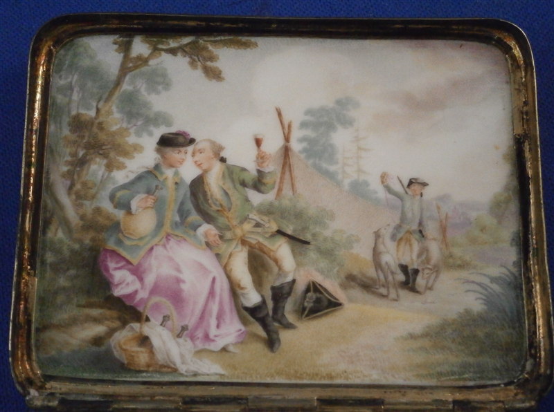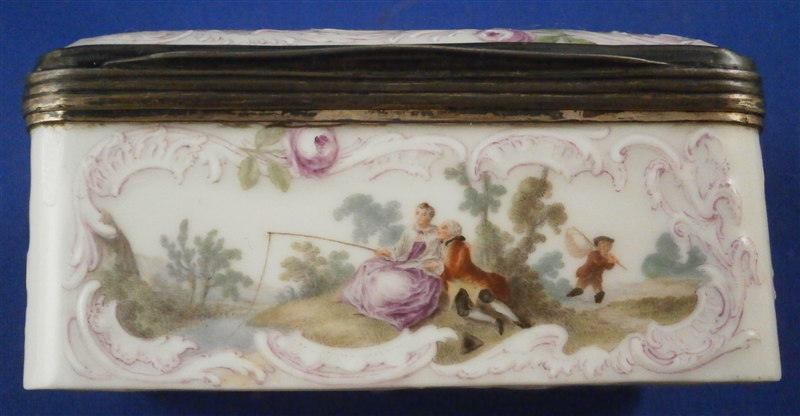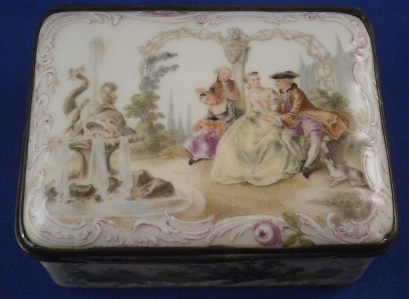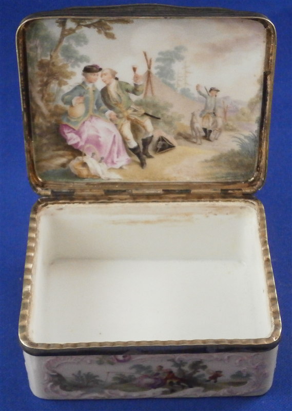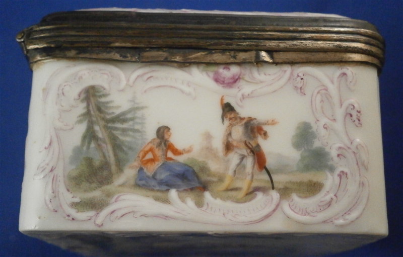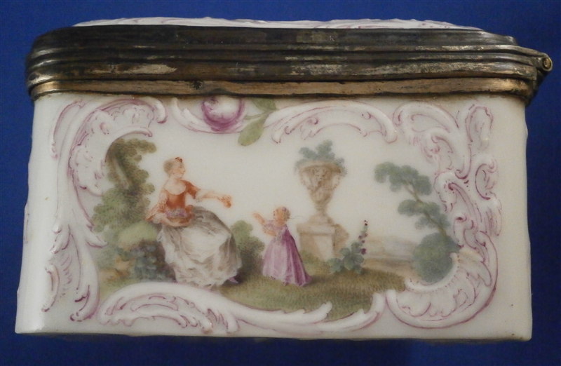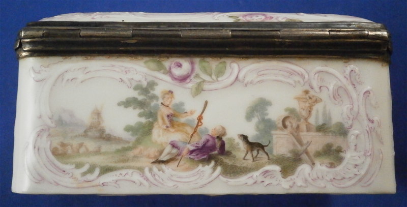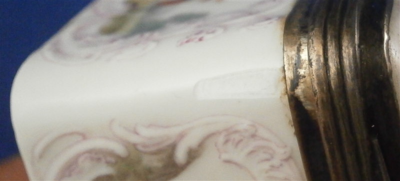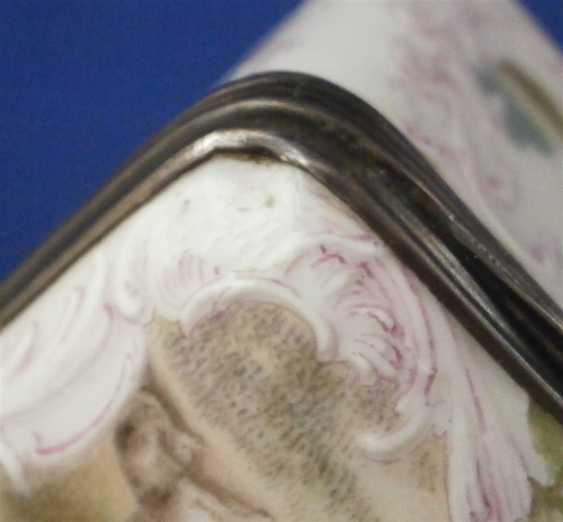 This is a superb tabatiere / snuff box made by Meissen around 1755-60. I am sure it is of this period and German though I cannot find this exact shape so it could well be by KPM as well but I am fairly certain it is a Meissen example. A box that is of superb quality with seven hand painted scenes as well as some nice puce outlined raised trim and a few roses. There are large scenes on the top, the inside of the top and the bottom and four smaller scenes on all four sides. The inside bottom part is left white for the tobacco. The quality of the scenes is superb and I like that the colors are a bit more muted than on many ones see but the painting detail is just amazing especially that of the inside lid scene! I always wonder how they could paint so well seeing that the heads of the figures are only a millimeter are so in size! The mounts on this piece are silver which has tarnished over time but could easily be cleaned if one wants to. The box is in great condition with two flat chips mostly to the glaze to the left top corner of the bottom front and to the right front corner of the lid. These are not obvious at all and the piece displays perfectly! There is barely any wear even the underside scene is in remarkable condition! The box is not marked which is normal but the silver has a shell hallmark as well as two others that date it to the mid 1750's to the early 1760s. The mounts are French but the box is definitely German. The snuff box is about 1.5 inches tall, 3.125 inches wide and 2.5 inches deep so a very nice size. Please email me for more information or other pictures.
