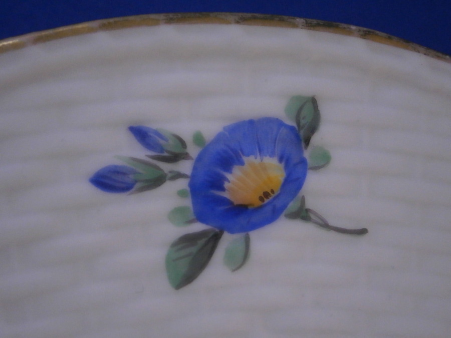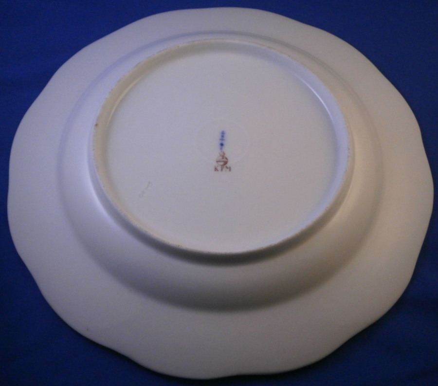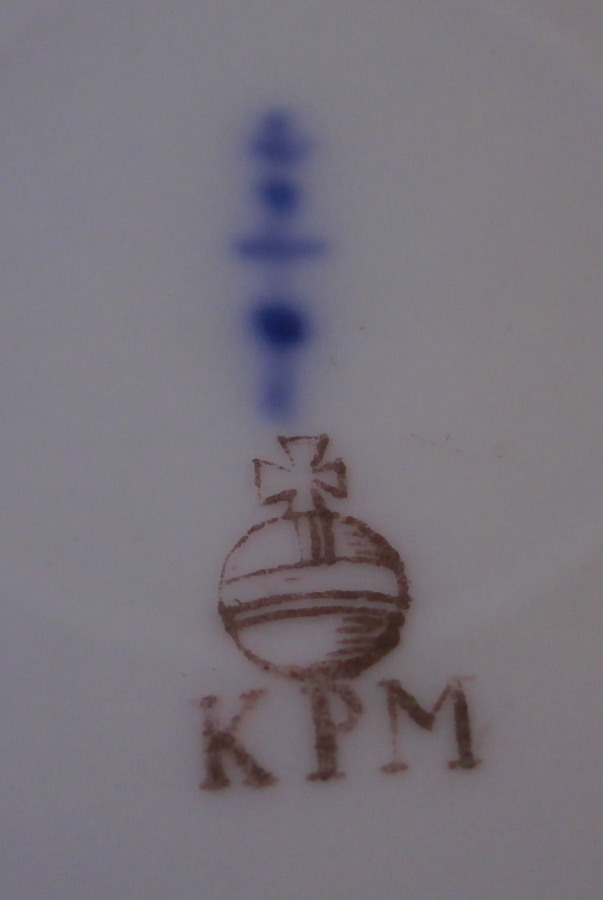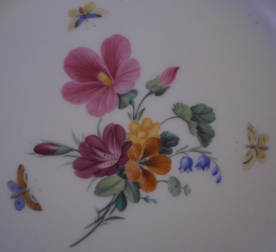 This is a nice early version of the Osier style plates made by KPM around 1832. It has the characterisitc basket weave design to the rim, a gold trim to the edge, three single flowers to the rim and a large floral arrangement in the center with three butterflies around it. All hand painted off course. One does not see these early version often at all anymore. The plate is 1.375 inches tall and 9.75 inches in diameter. It is in great condition with a tiny bit of wear and displays perfectly! The piece is marked underneath with the under glaze blue scepter as well as the red orb mark. Also some impressed marks as shown. Please email me for more information or other pictures.
