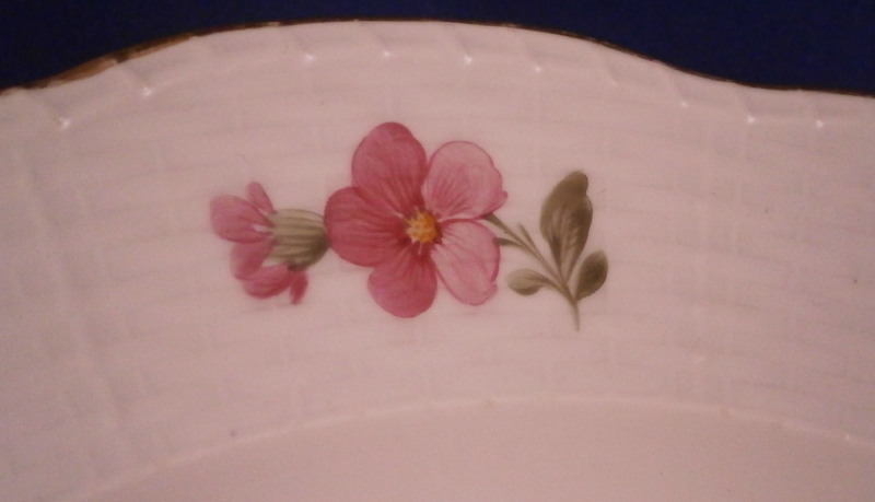 This is a nice dinner plate made by KPM around 1900. Its rim has a basket weave design to it called the Osier relief with three single flowers hand painted on it and a gold trim to the edge. The center of the plate has a hand painted floral arrangement in it as well as three butterflies around the arrangement. A very elegant plate! The plate is in perfect condition and is 1.125 inch tall and has a diameter of 9.625 inches. It is marked underneath with the under glaze blue scepter, the red orb as well as an artist marks and impressed marks M over 3 common to these pieces around this time. Please email me for more information or other pictures.