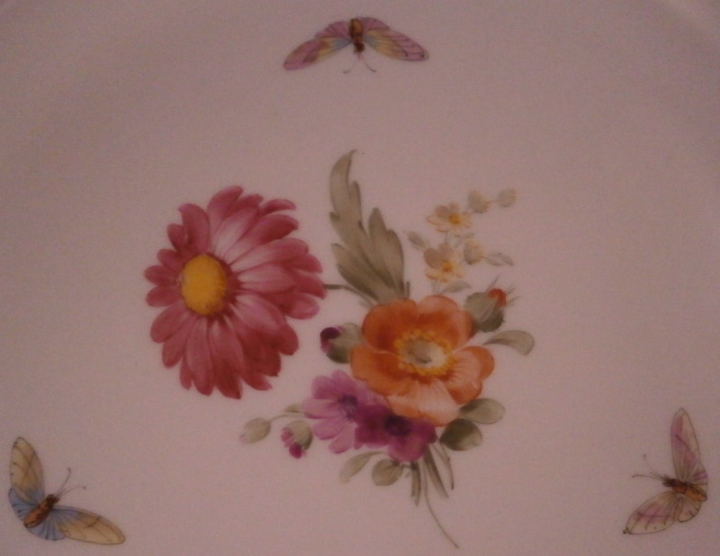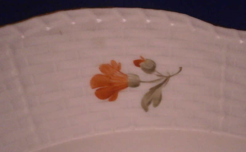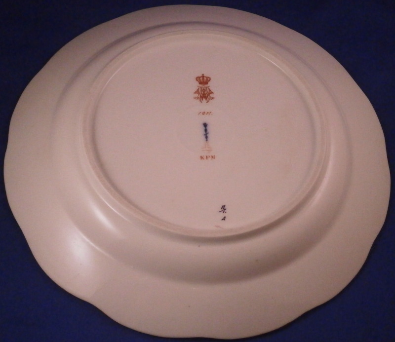 This is a dinner plate made by KPM in 1911 for the personal use of Kaiser Wilhelm II and his first wife Augusta Victoria of Schleswig-Holstein. A very nice piece with the rim having a basket weave design to it called the Osier relief with three single flowers hand painted on it and a gold trim to the edge. The center of the plate has a hand painted floral arrangement in it with the main flower being a nice pink and yellow color with an orange and two purple ones underneath as well as three butterflies around the arrangement. A very elegant plate with a nice provenance. The plate is in superb condition with some very minor use marks. The plate is 1.125 inch tall and has a diameter of 9.625 inches. It is marked underneath with the under glaze blue scepter, the red orb as well as some artist marks and impressed marks common to these pieces. And off course the WA under a crown monogram and the year 1911 under that. Please email me for more information or other pictures.