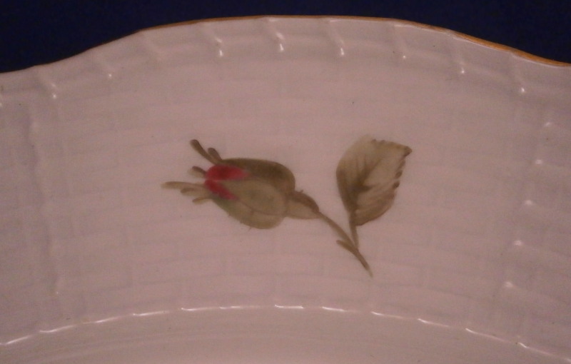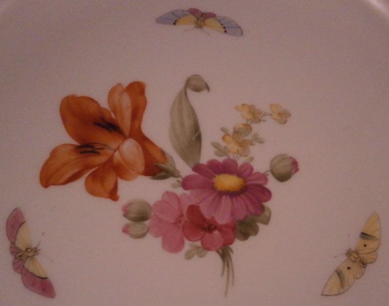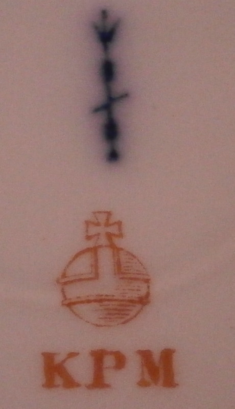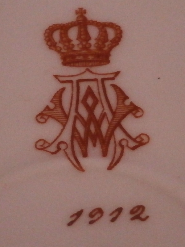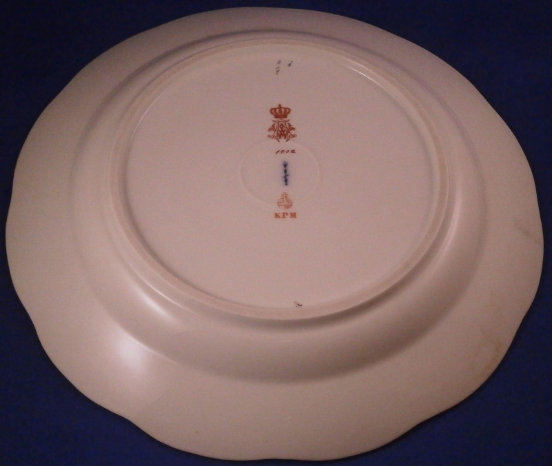 This is a dinner plate made by KPM in 1912 for the personal use of Kaiser Wilhelm II and his first wife Augusta Victoria of Schleswig-Holstein. A very nice piece with the rim having a basket weave design to it called the Osier relief with three single flowers hand painted on it and a gold trim to the edge. The center of the plate has a hand painted floral arrangement in it with the main flower being a large orange flower with a few pik abd purple ones underneath as well as three butterflies around the arrangement. A very elegant plate with a nice provenance. The plate is in great condition with a couple of use marks with really only the one cut on the large freen leaf in the floral arrangement being visible. It still displays perfectly! The plate is 1.25 inch tall and has a diameter of 9.625 inches. It is marked underneath with the under glaze blue scepter, the red orb as well as some artist marks and impressed marks common to these pieces. And off course the WA under a crown monogram and the year 1912 under that. Please email me for more information or other pictures.