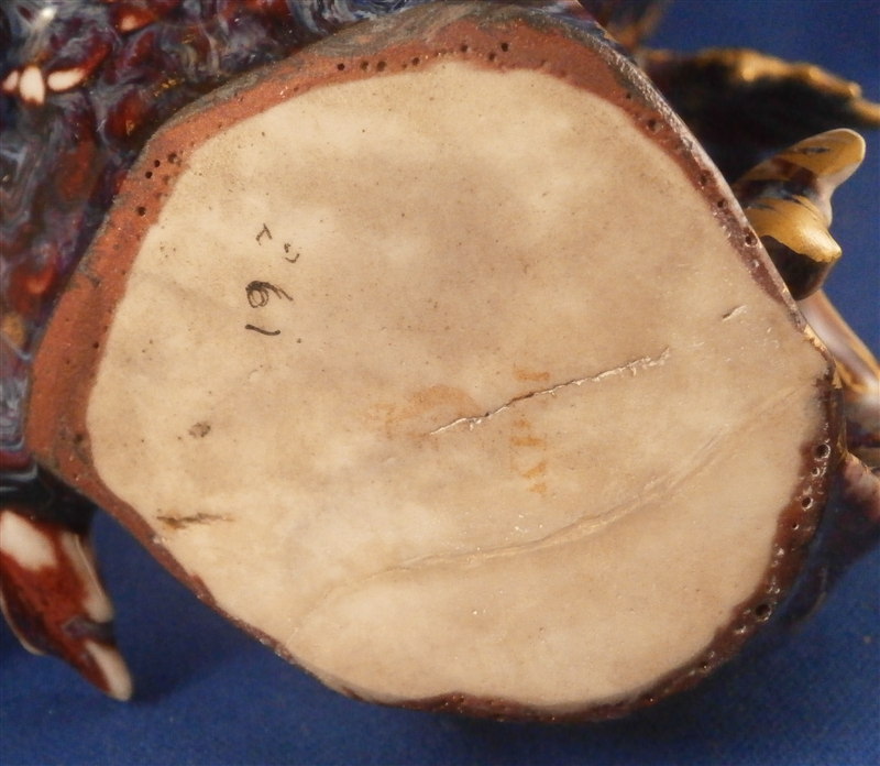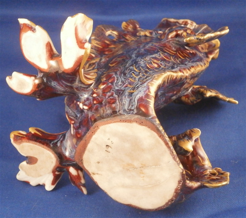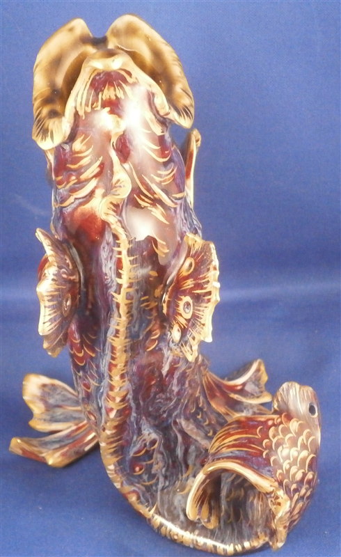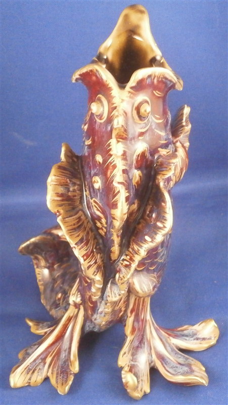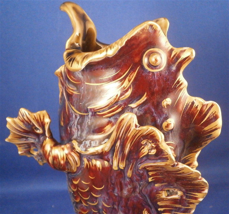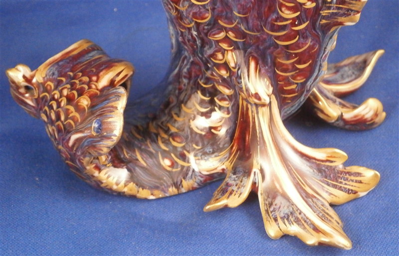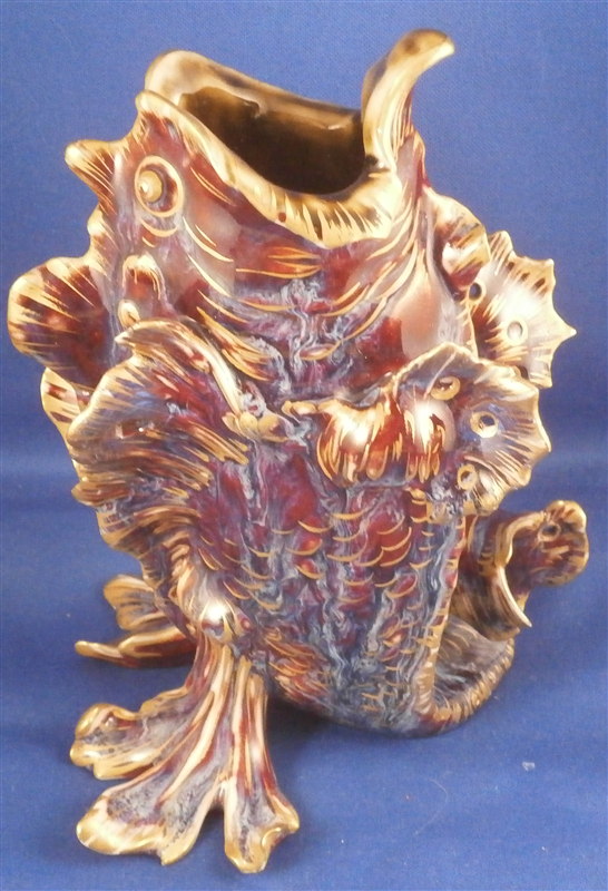 This is a very rare vase made by KPM in the late 19th century to about 1900. I have actually never seen this shape nor can I find it nor can I find anyone else that knows it. The vase is really neat be it a bit out there :) It is in the form of a fish - it reminds me of the lion fish - handpainted with a superb oxblood type glaze in reddish and blue tones and highlighted with lots of gilding! Just a fun piece to look at :) Look at all the detail and those eyes! The vase is marked underneath with the red orb mark on the unglazed bottom - the scepter mark is long gone - burned away during the firing processes which can happen on unglazed surfaces! There is also a black painter's number. It is in great condition with some minor restoration that is completely invisible. A very hard piece to photograph - it looks much nicer in person! The piece is a nice 6.75 inches tall. Please email me for more information or other pictures.