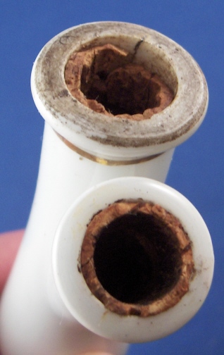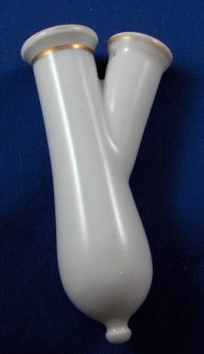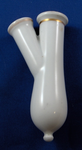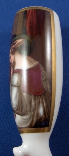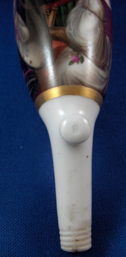 This is a superb porcelain pipe bowl made by KPM in the early 19th century. It is handpainted with a top quality scene of a husband and wife - him wearing his fighting attire and her wearing a nice dress. He is holding his shield up in front of her in which you can see her reflection. Just an amazingly detailed painting. The scene is surrounded with a gold trim. The pipe is marked on the bottom end across it so only two small lines are visible but it is also marked on the inside with the underglaze blue scepter of around 1820. There is also an impressed number 8 on that front stub which only Meissen and KPM did. The pipe is in great condition with a tiny bit of wear to the gold trim and a small scratch near the man's head and a small firing fault near the ladie's butt :) In that area the skirt is lighter than it should be I assume because of the impurity in the paste burned away and with it some paint. No big deal at all! The pipe was used but is fairly clean on the inside. The bowl is 4.875 inches tall and a little over 1.25 inches in diameter. It comes with the attachment between the pipe and the stem but no stem! Please email me for more information or other pictures.