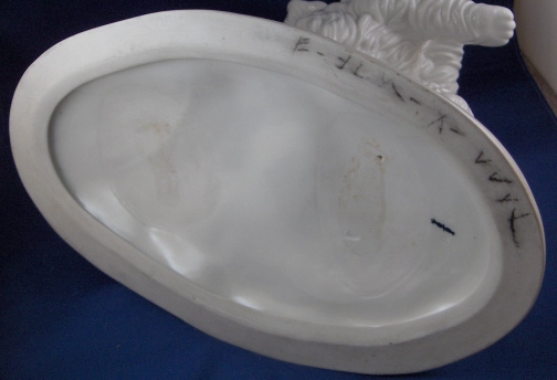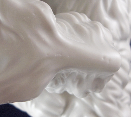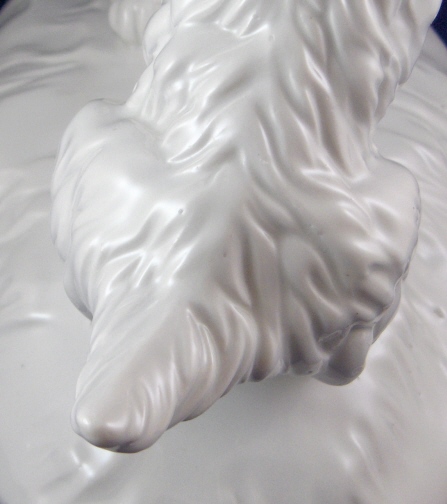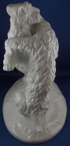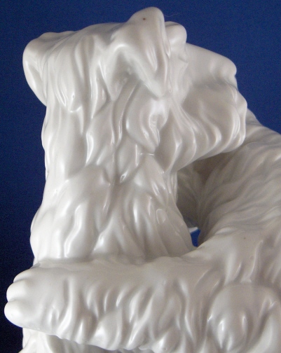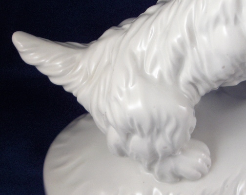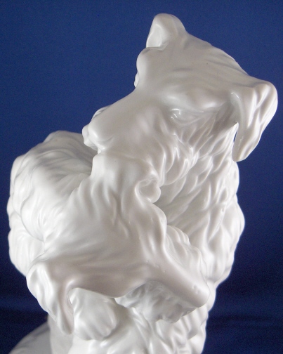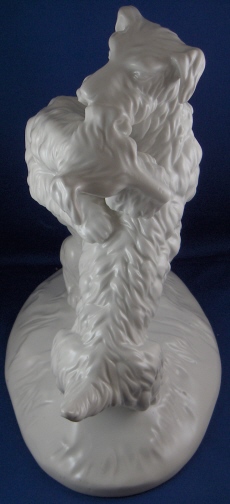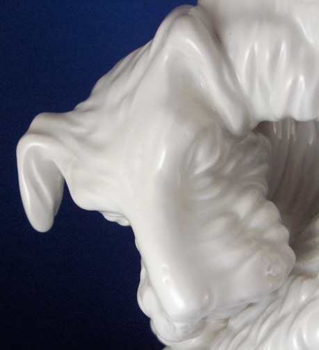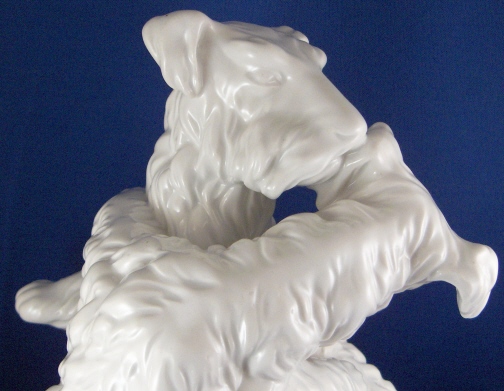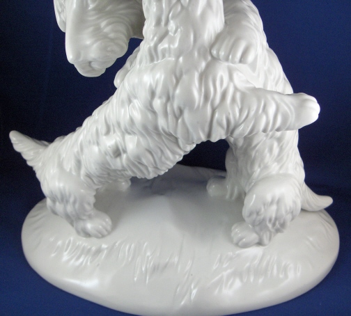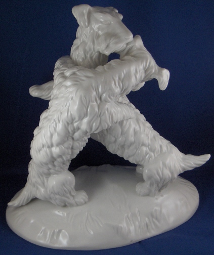 This is a rare dog figurine made by KPM in the 20th century. They are two terriers playing or even fighting standing on thei hind legs on a large base. The piece is quite impressive due to its size and detail. I have never seen this model before nor could I find it when looking for it so it is not a common piece by any means! The figurine is in perfect condition with some original manufacturing flaws in the form of glaze misses here and there but still deemed a factory first so couldn't have been too bad :) The figure is 11.25 inches tall, 11 inches wide and 6.875 inches deep plus quite heavy. The piece is marked underneath with the underglaze blue scepter as well as some impressed marks common to this period. Please email me for more information or other pictures.