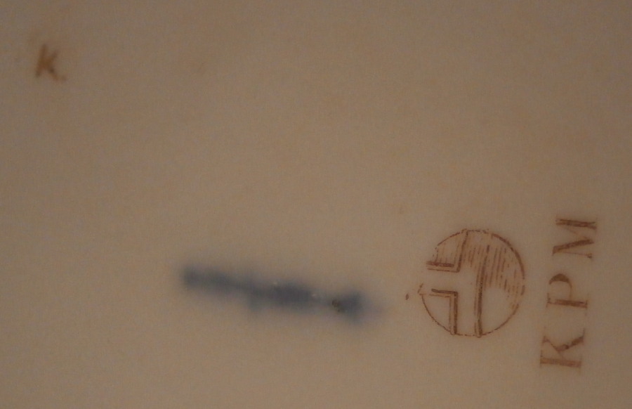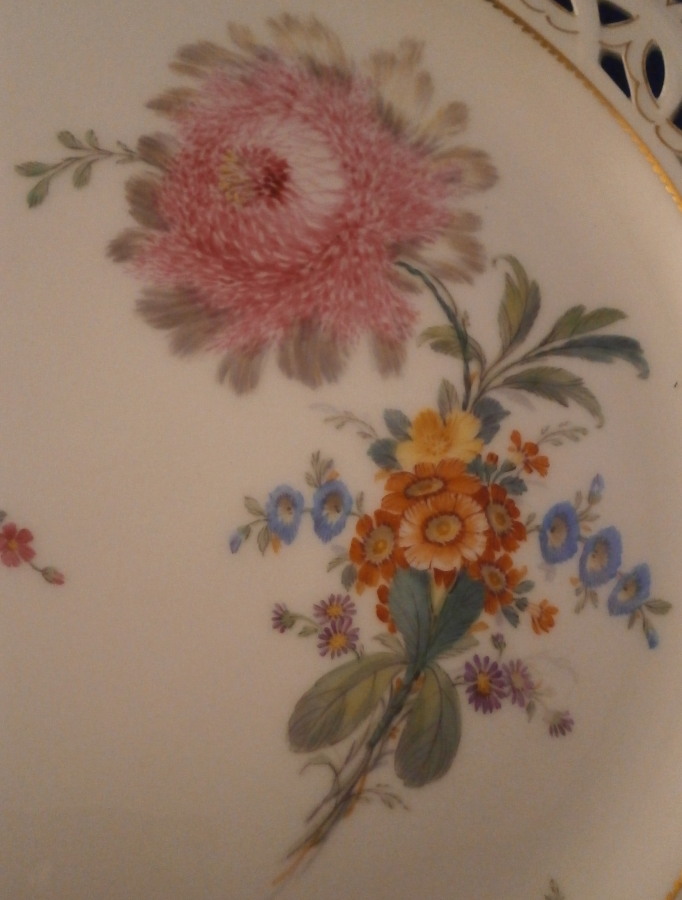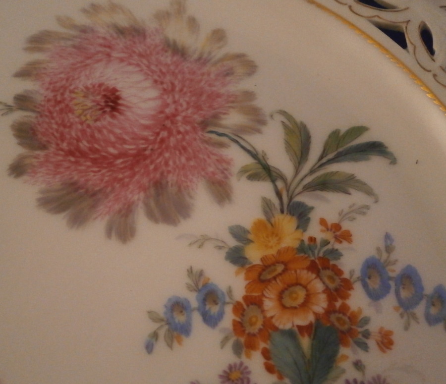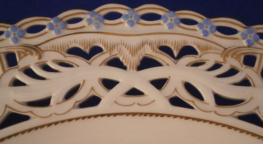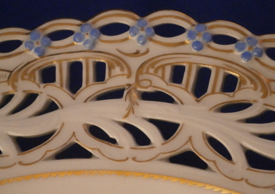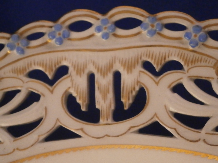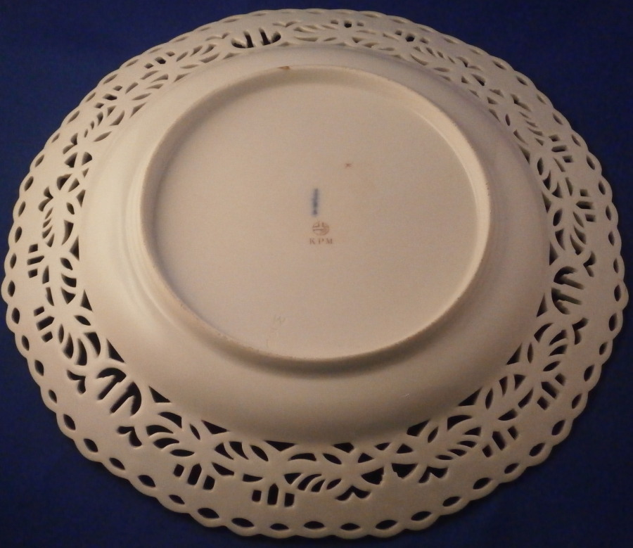 This is a superb reticulated plate made by KPM in the early 20th century. This is one of the fanciest reticulations they did and it is called Palmendurchbruch in German which translates to palm leaf reticulation which one can easily see in the design. The rim is completely reticulated with the palm leaves closest to the well, three different designs above that and the little arches along the edge with small forget me nots flowers in between them. Lots of gold highlights and a gold trim along the edge of the well. The center of the plate has a super floral arrangement to it as well as some small single flowers and tiny leaves. The flowers of this period are superb much nicer than more modern ones or even most earlier ones. The colors are nice and the detail top notch! The plate is in great condition with a small flaw to one of the edge arches on the underside as shown. It must have gotten knocked in that spot. It does not affect the palte at all and can only be seen from the underside not the top or even side view. The plate is marked underneath with the under glaze blue scepter mark as well as the over glaze red KPM orb mark showing it was painted by KPM and the usual impressed and artist marks as shown. The plate is 1.25 inches tall and 9.875 inches in diameter - a nice size for use or display. Please email me for more information or other pictures.