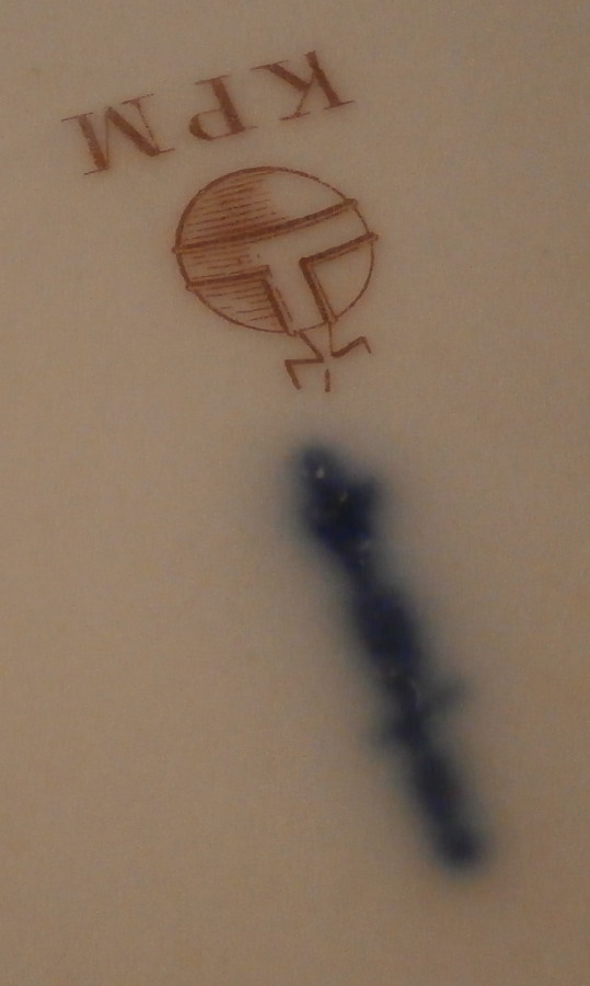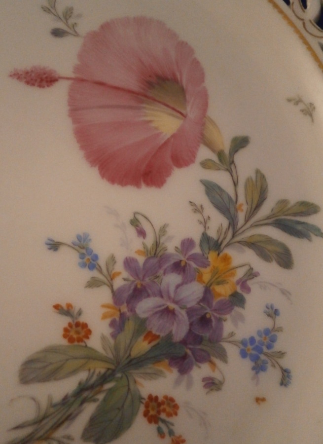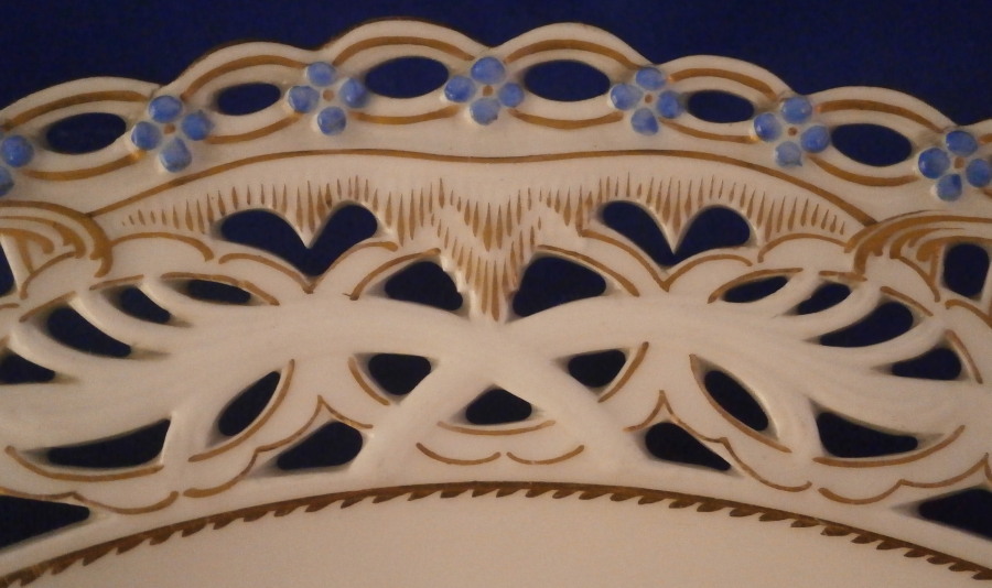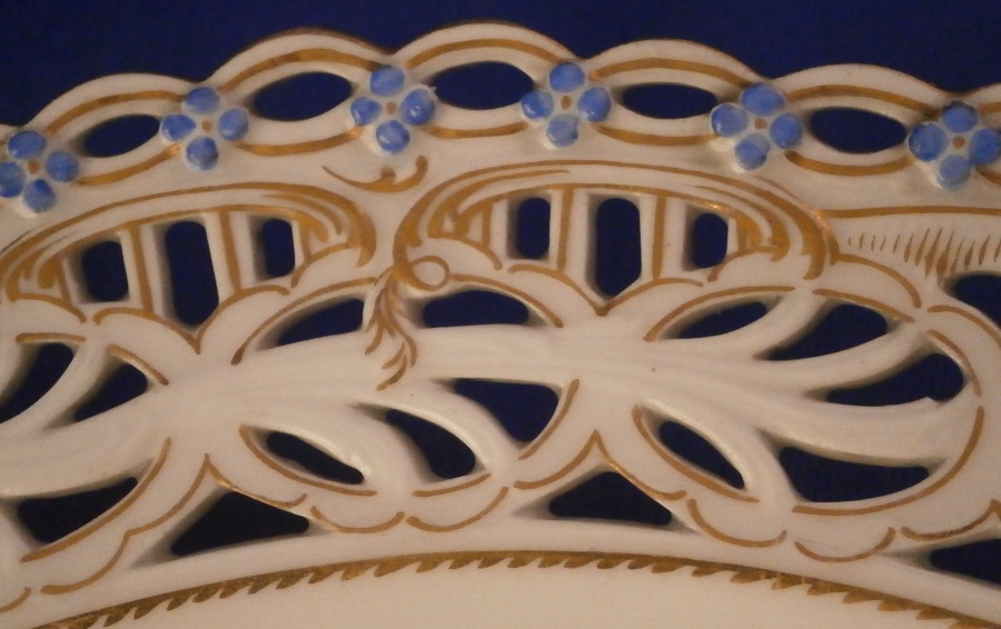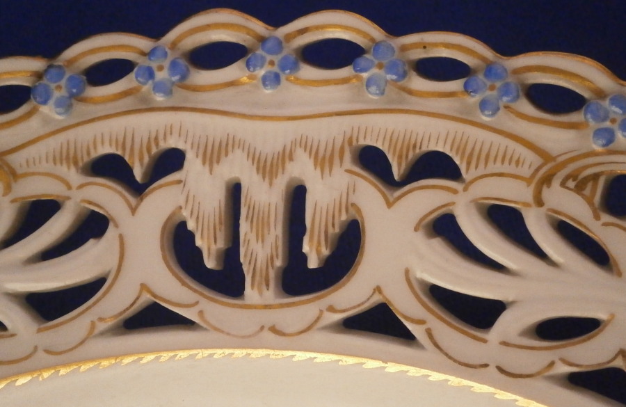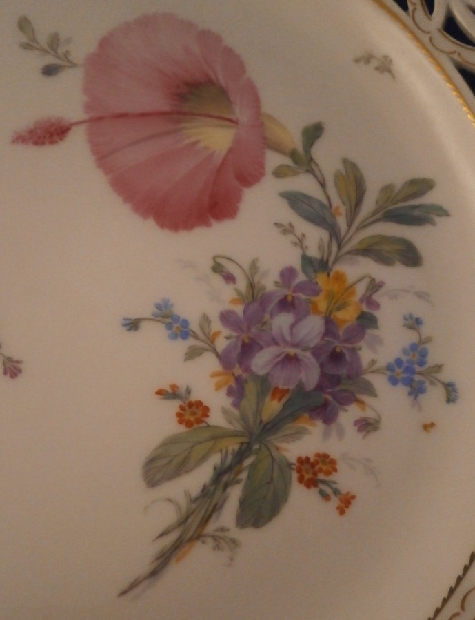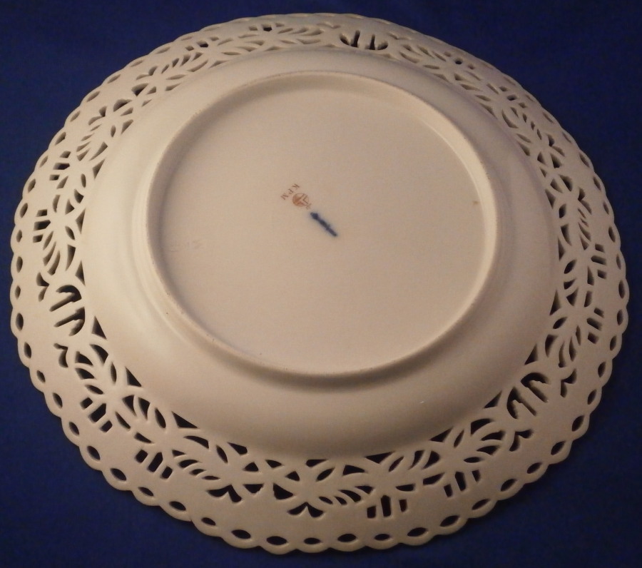 This is a superb reticulated plate made by KPM in the early 20th century. This is one of the fanciest reticulations they did and it is called Palmendurchbruch in German which translates to palm leaf reticulation which one can easily see in the design. The rim is completely reticulated with the palm leaves closest to the well, three different designs above that and the little arches along the edge with small forget me nots flowers in between them. Lots of gold highlights and a gold trim along the edge of the well. The center of the plate has a superb floral arrangement to it as well as some small single flowers and tiny leaves. The flowers of this period are superb much nicer than more modern ones or even most earlier ones. The colors are nice and the detail top notch! The plate is in great condition with two little flaws along the underside edge as shown. They either cut in a bit too far when doing the reticulation or it happened during the firing process. Either way it does not affect the plate at all and can only be seen from the underside not the top or even side view. The plate is marked underneath with the under glaze blue scepter mark as well as the over glaze red KPM orb mark showing it was painted by KPM and the usual impressed and artist marks as shown. The plate is 1.25 inches tall and 9.875 inches in diameter - a nice size for use or display. Please email me for more information or other pictures.