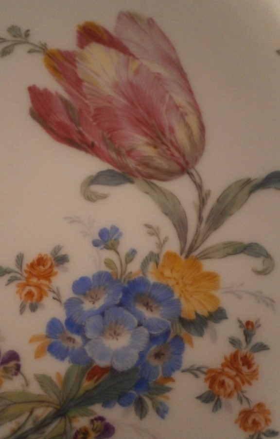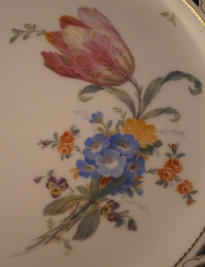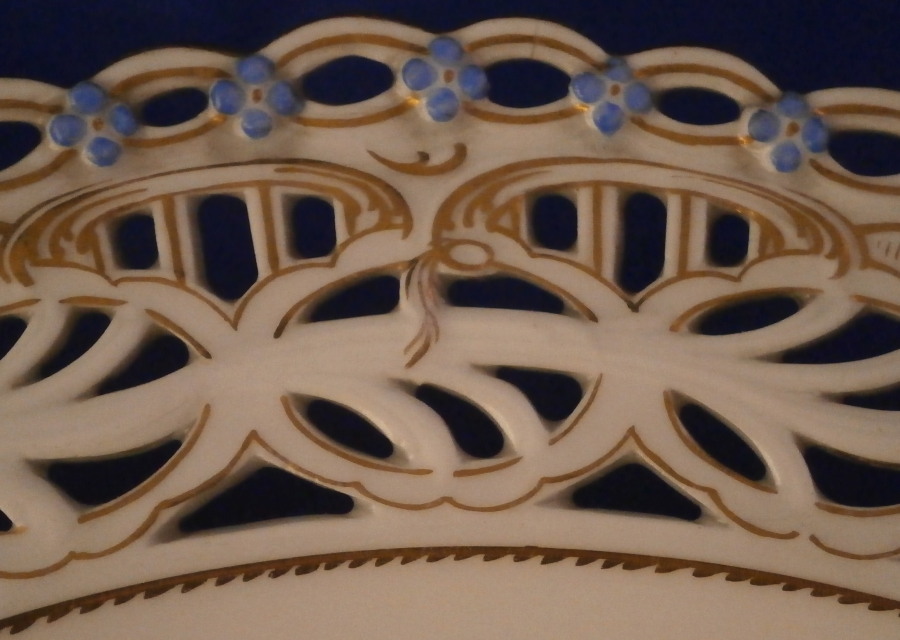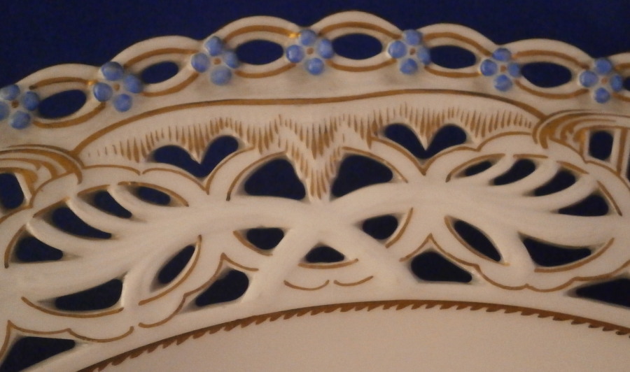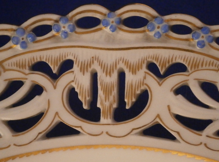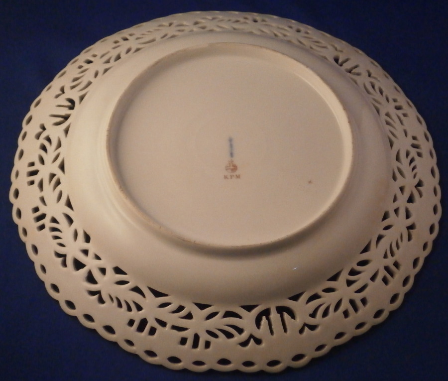 This is a superb reticulated plate made by KPM in the early 20th century. This is one of the fanciest reticulations they did and it is called Palmendurchbruch in German which translates to palm leaf reticulation which one can easily see in the design. The rim is completely reticulated with the palm leaves closest to the well, three different designs above that and the little arches along the edge with small forget me nots flowers in between them. Lots of gold highlights and a gold trim along the edge of the well. The center of the plate has a superb floral arrangement to it as well as some small single flowers and tiny leaves. The flowers of this period are superb much nicer than more modern ones or even most earlier ones. The colors are nice and the detail top notch! The plate is in great condition with a couple really tiny flat underside edge chips as shown. Some of them are glazed so from when it was made and do not affect the plate at all and can only be seen from the underside not the top or even side view. The plate is marked underneath with the under glaze blue scepter mark as well as the over glaze red KPM orb mark showing it was painted by KPM and the usual impressed and artist marks as shown. The plate is 1.25 inches tall and 9.875 inches in diameter - a nice size for use or display. Please email me for more information or other pictures.