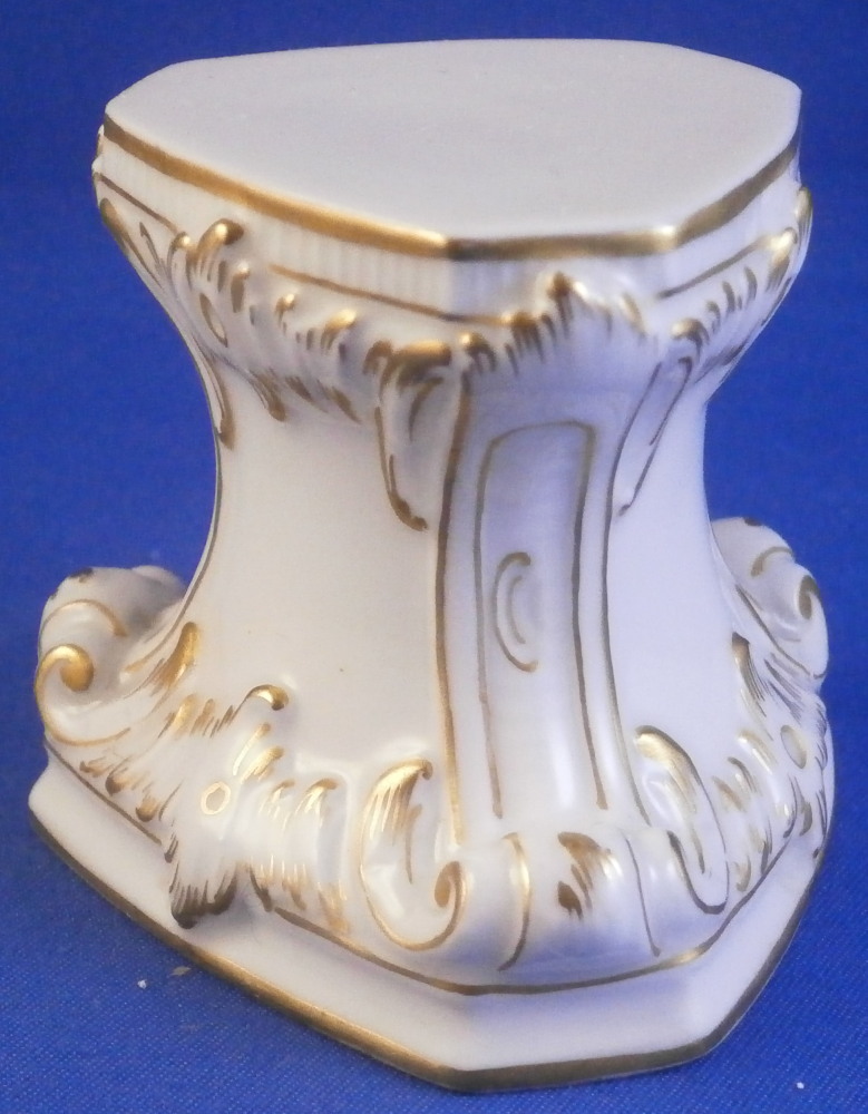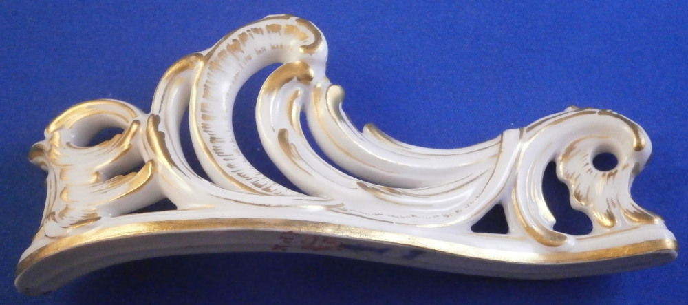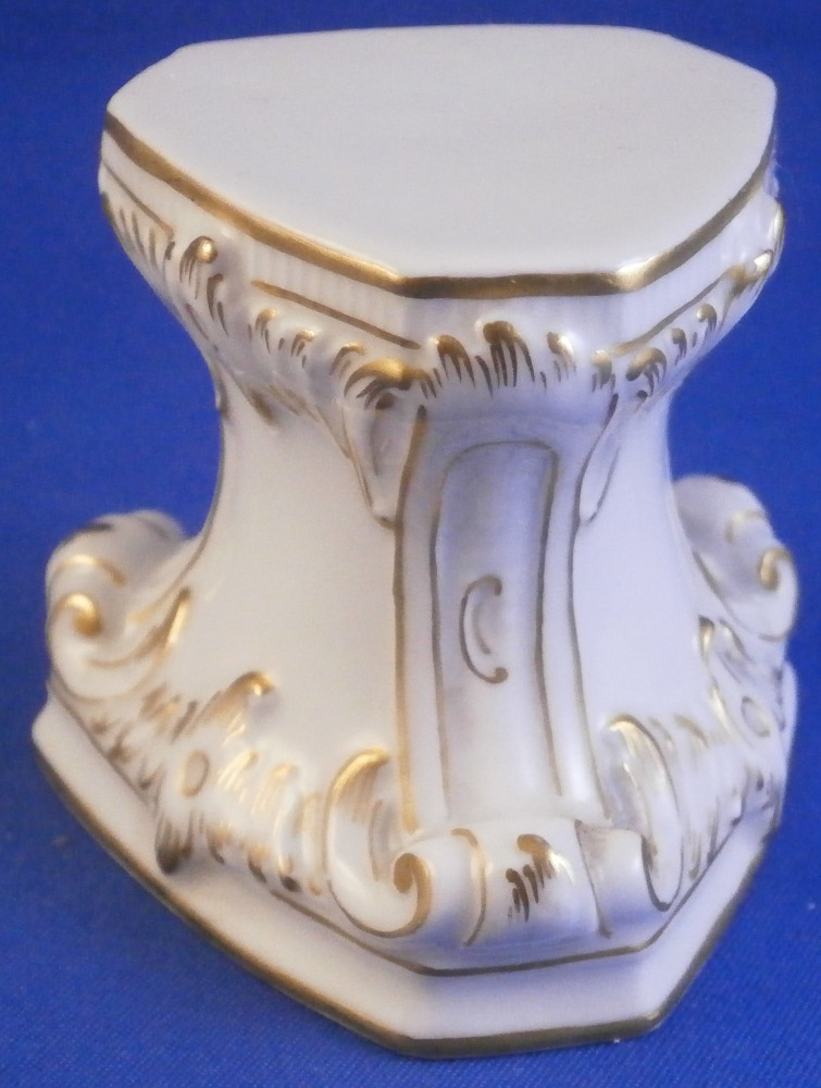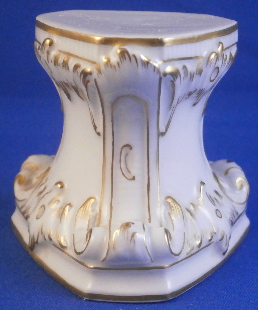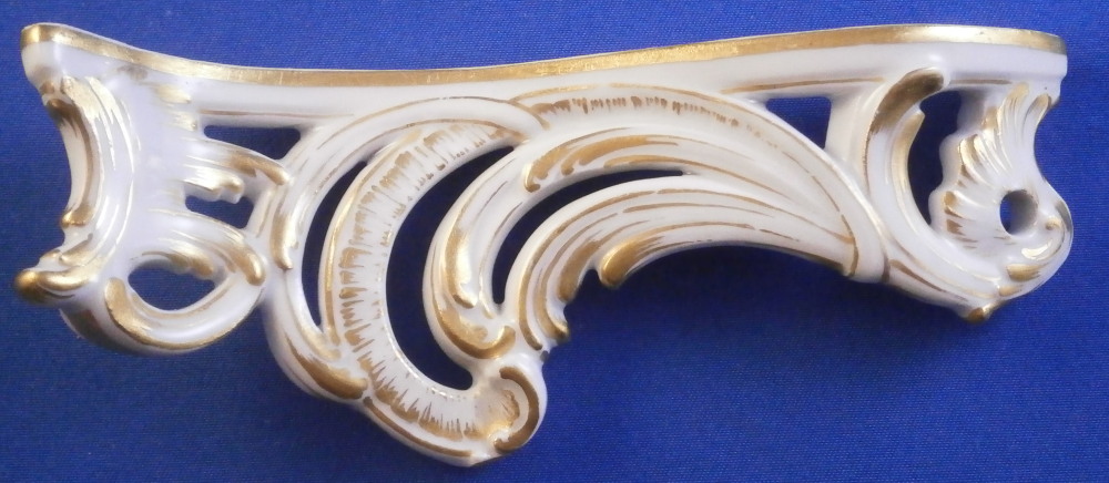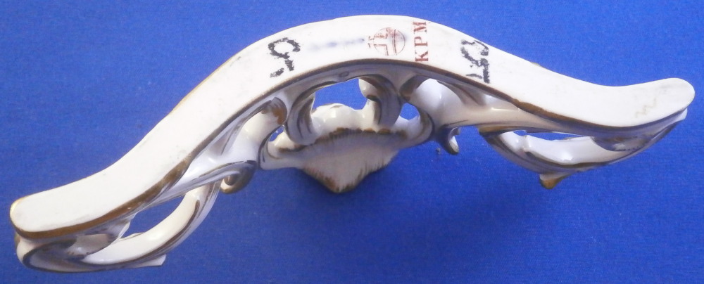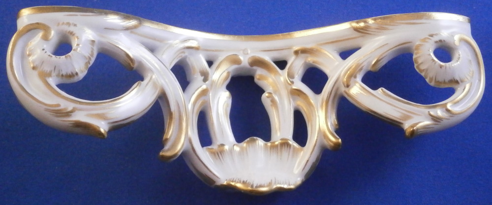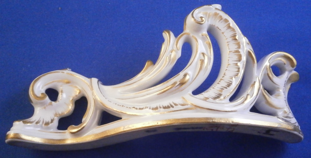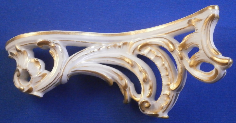 This is a n interesting set of pieces made during the Art Nouveau / Jugendstil period by KPM in Berlin , Germany. The main piece is a little pedestal / base for a small figurine. It is nicely modeled with lots of raised detail and gold trim. It's a triangular sort of shape and fits a small Weichmalerei figurine as I have shown in the example of the last photo - the figure is not included in this sale. The pedestal is nothing super special but what makes this set interesting are the three pieces of scroll work decorative elements that come with it. Likely made for a table display but if turned upside down could be made into a trim for a wall shelf as well. Each piece has some elaborate detail to it highlighted with gilding to match the pedestal perfectly. There is a cental piece and then one each for the right and left side as shown in my photo. I have never come across anything like it and it would look stunning set up on a table! A truly superb setup! All four peices are in perfect condition. The base is 1.875 inches tall and 2.125 inches wide at the bottom. The top is about 1.5 inches wide. The center scroll piece is about 5.25 inches wide 1.875 inches tall and 1.25 inches deep. Each side piece is about 4.75 inches wide, 2 inches tall and 1.25 inches deep. A very unusual combo that looks amaing! All are marked underneath with the blue scepter as well as the red orb mark and a gilder's mark and the usual impressed marks of the period as shown. Please email me for more information or other pictures.