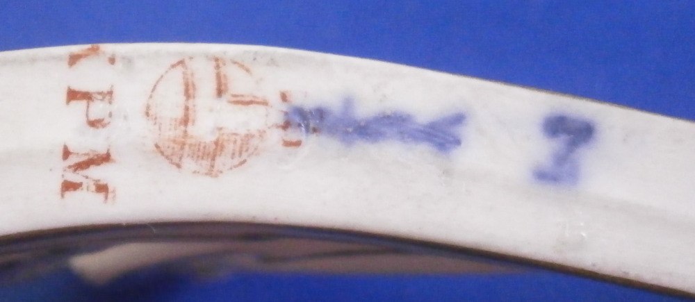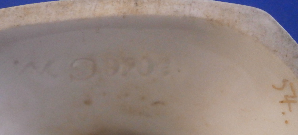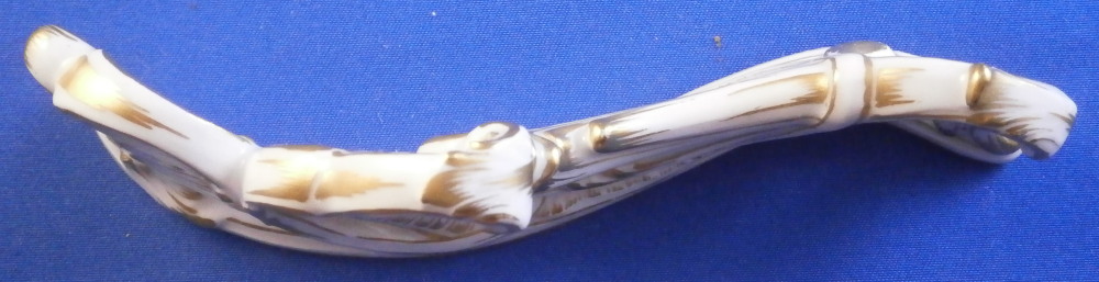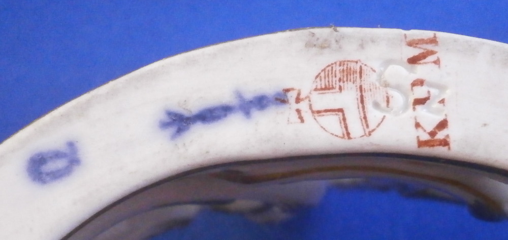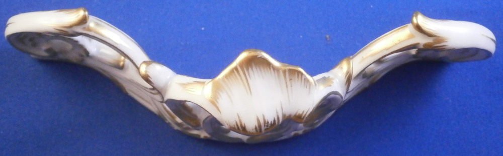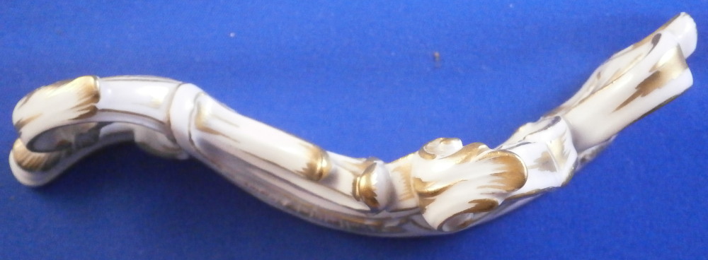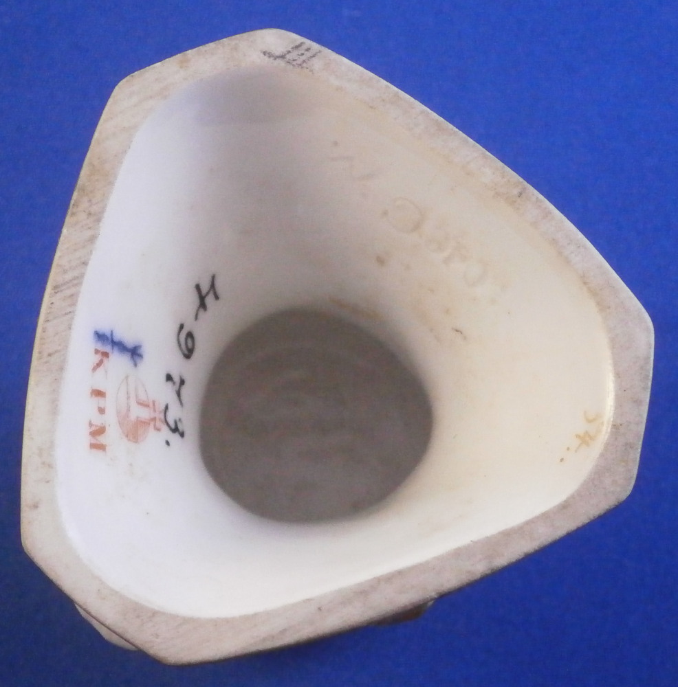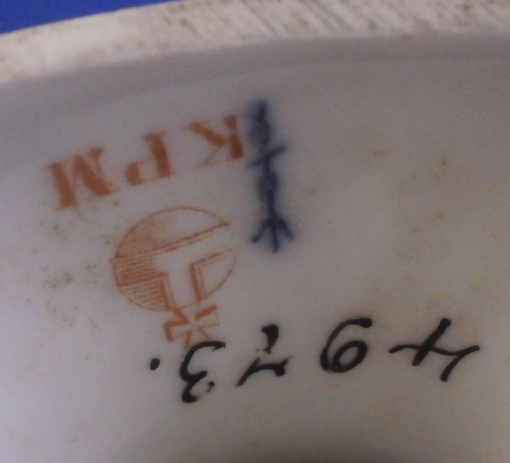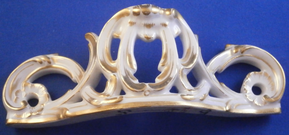 This is a n interesting set of pieces made during the Art Nouveau / Jugendstil period by KPM in Berlin , Germany. The main piece is a little pedestal / base for a small figurine. It is nicely modeled with lots of raised detail and gold trim. It's a triangular sort of shape and fits a small Weichmalerei figurine as I have shown in the example of the last photo - the figure is not included in this sale. The pedestal is nothing super special but what makes this set interesting are the three pieces of scroll work decorative elements that come with it. Likely made for a table display but if turned upside down could be made into a trim for a wall shelf as well. Each piece has some elaborate detail to it highlighted with gilding to match the pedestal perfectly. There is a cental piece and then one each for the right and left side as shown in my photo. I have never come across anything like it and it would look stunning set up on a table! A truly superb setup! All four peices are in perfect condition. The base is 1.875 inches tall and 2.125 inches wide at the bottom. The top is about 1.5 inches wide. The center scroll piece is about 5.25 inches wide 1.875 inches tall and 1.25 inches deep. Each side piece is about 4.75 inches wide, 2 inches tall and 1.25 inches deep. A very unusual combo that looks amaing! All are marked underneath with the blue scepter as well as the red orb mark and a gilder's mark and the usual impressed marks of the period as shown. Please email me for more information or other pictures.