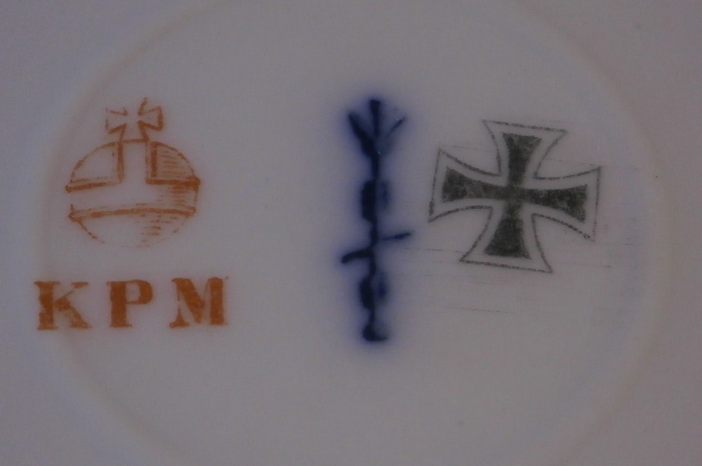 This is a plate made by KPM during the first World War. It is nicely hand painted with a large floral arrangement in the center in pink, grey and green tones which I find very elegant. Three smaller flowers on the rim as well as a very nice rim design in pink and green! A really nice color combination! The plate is in decent condition with a reglued chip to the edge as shown. Hides it pretty well and it displays superbly! The plate is 1.25 inches tall and 9.375 inches in diameter. The plate is marked underneath with the under glaze blue scepter, the red orb, the iron cross as well as various artist and impressed marks. First choice. I have a few more of these in perfect condition if anyone would like more than one! Please email me for more information or other pictures.