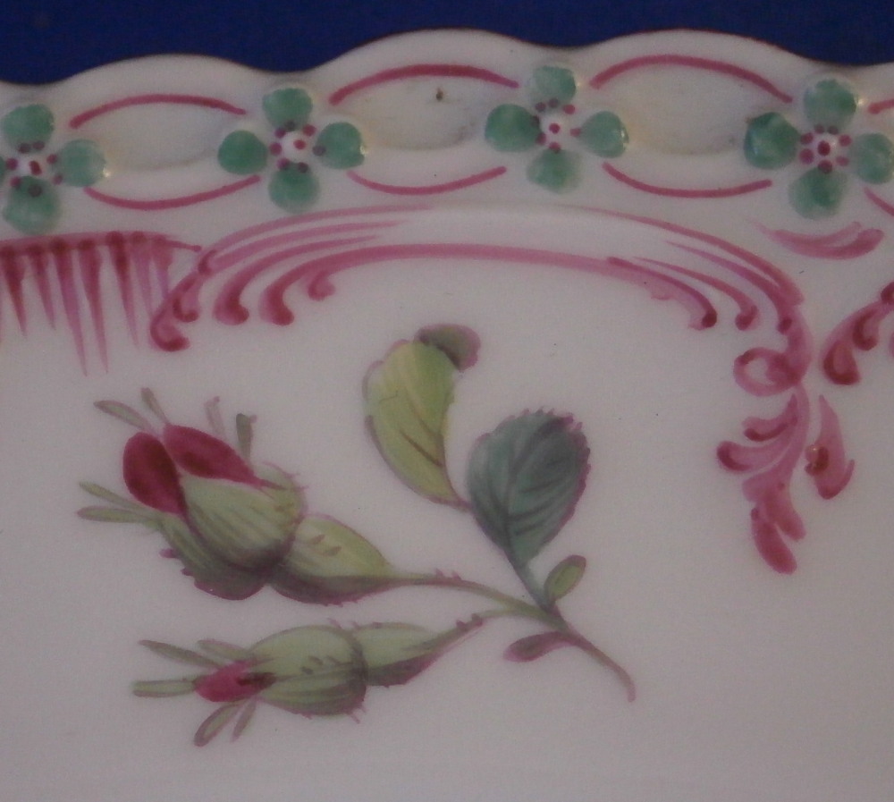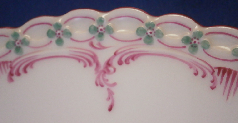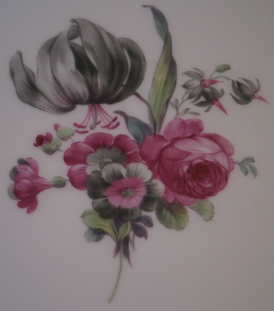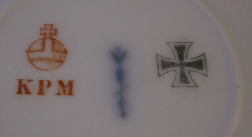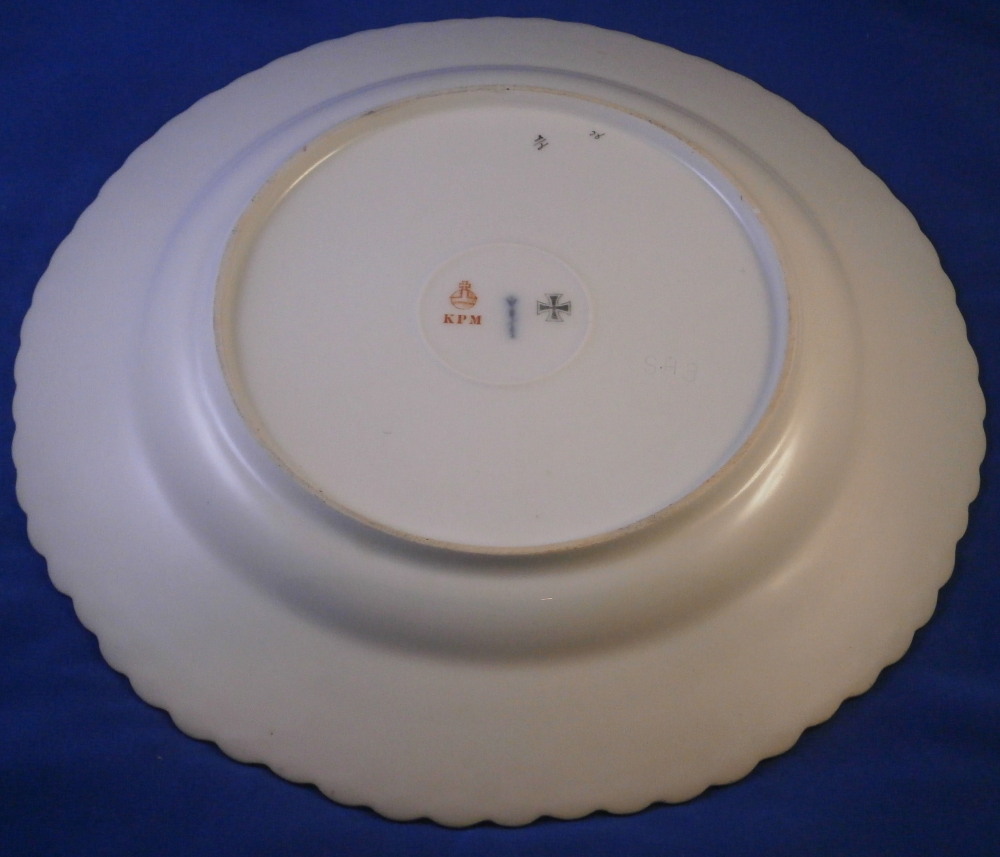This is a plate made by KPM during the first World War in the earlier 20th century. It is nicely hand painted with a large floral arrangement in the center in pink, grey and green tones which I find very elegant. Three smaller flowers on the rim as well as a very nice rim design in pink and green! A really nice color combination! The plate is in perfect condition! It is 1.25 inches tall and 9.5 inches in diameter. The plate is marked underneath with the under glaze blue scepter, the red orb, the iron cross as well as various artist and impressed marks. First choice. I have a few more of these if anyone would like more than one! Please email me for more information or other pictures.