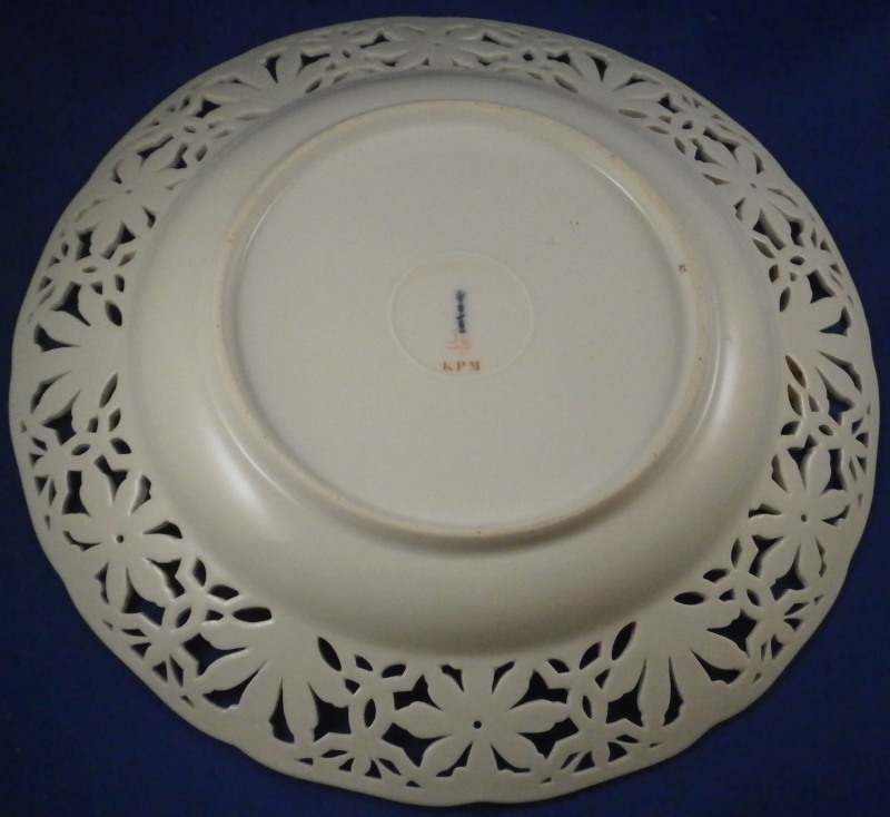 This is a reticulated plate made by KPM in the beginning of the 20th century. It is hand painted with a nice floral arrangement in the center with three smaller flowers around it and a superb reticulated rim highlighted with a pink design. Really quite elegant! The plate is in perfect condition and marked underneath with the underglaze blue scepter mark as well as the overglaze red KPM orb mark showing it was painted by KPM. Also some impressed marks typical of this time period. There is a painter's mark on the footring. The plate is 1.375 inches tall and 9 inches in diameter. Please email me for more information or other pictures.