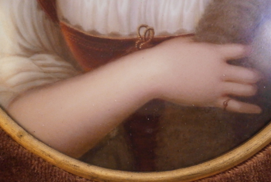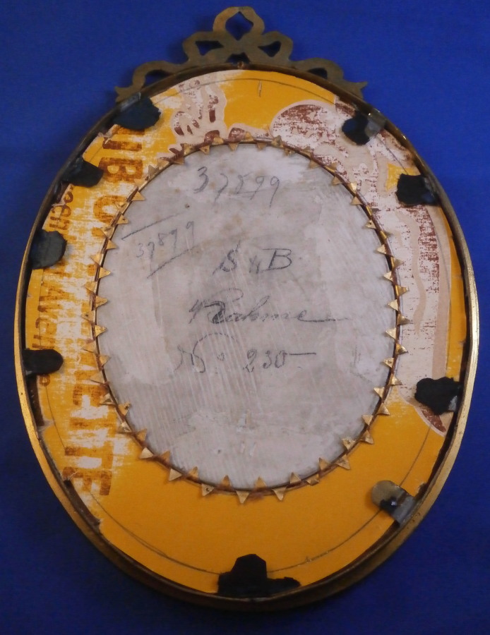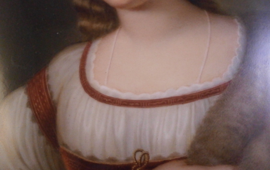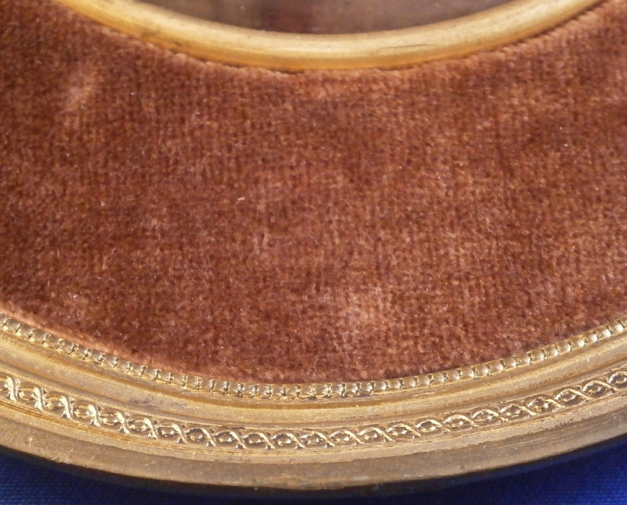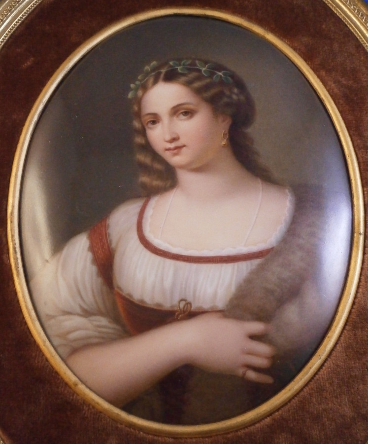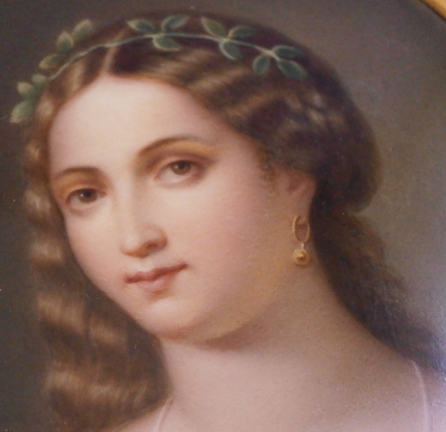 This is a superb porcelain plaque made by KPM Berlin in the mid to late 19th century. It is hand painted with a really nicely done ortrait of a young lady waering a nice dress with a fur over her shoulders. She has a leaf garland in her hair, is wearing an earring and a ring on her pinky finger. It is a top quality piece! It comes in a nice farme with a gilded center oval around the plaque, then a velvet type material that probably used to be red and then the outer gold metal frame with some nice detail to it. A bow to the top which cane be used for hanging. The plaque is in superb condition - the frame has a few issues but display nicely. The plaque is about 5.5 inches tall and 4.25 inches wide so a nice size. The entire frame is about 9.75 inches tall and 6.625 inches wide. The porcelain is marked with the impressed KPM under a scepter mark as well as the number 11 as shown. Some old pencil writing on the back as well. Please email me for more information or photos.