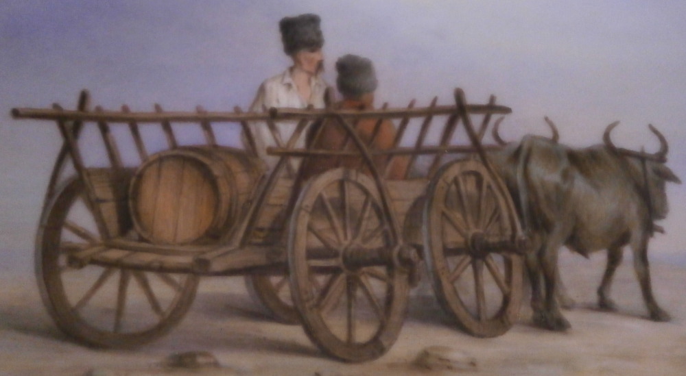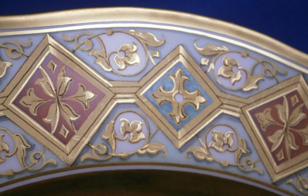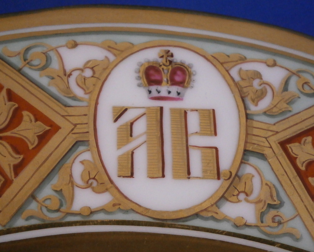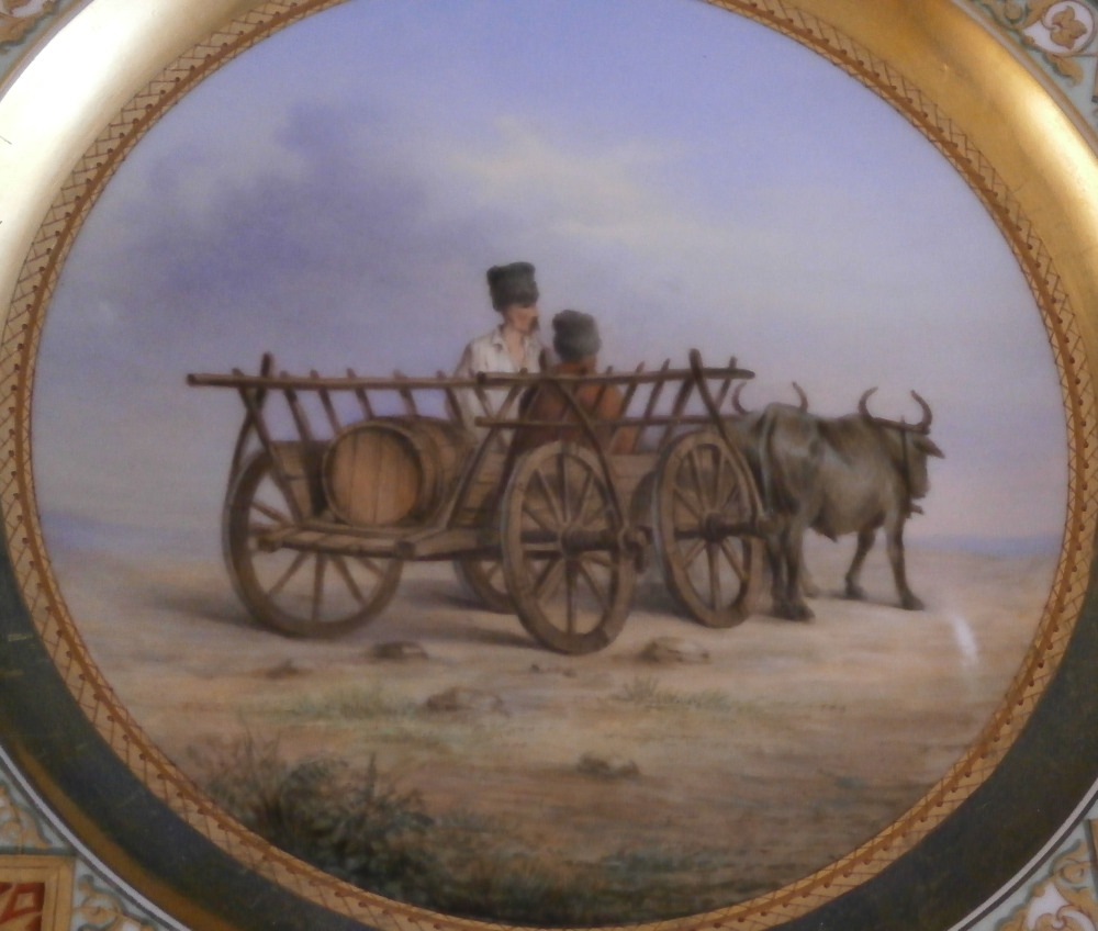 This is a really rare plate made by KPM between 1849 and 1870. A superb piece that is often said to come from the service of the Russian Grand Duke Andrei Vladimirovich but he was born after this plate was made and his royal cypher is different. I personally think it was for his father Grand Duke Vladimir Alexandrovich as he seemed to have used different cyphers. Or maybe for a wedding between two people whose last names ended with an A and a V. Either way this is an amazing plate with a nice rim shape. The rim is decorated with a hand painted design of alternating red and green lozenge shaped panels with gold designs to them with gold leaf scrolls in between and a Russian royal princely crown over the cyrillic monogram / cypher AV. The rim design is certainly based on the Gothic art that many services by the Imperial St. Petersburg company also used in their services. The well of the plate has a thick gold band to the edge with a rope like design under that but the best part is certainly the hand painted scene in the center of the plate including a cart pulled by two oxen. There are also two gentleman - one sitting and one standing. The cart has a barrel in the back. Nice landscape surrounding. An extremely well painted scene! I have four of these plates each with a different scene from everyday life in Russia. The plate is in superb condition with just a spot of stacking wear as shown and some minor use marks. As good as it gets for being 150 plus years old! It displays superbly! The plate is 1.375 inches tall and 9.875 inches in diameter. It is marked underneath with the under glaze blue scepter over the so called penny mark as well as the red orb (really hard to see unless you light it at the right angle!) and some impressed marks. Please email me for more information or other pictures.