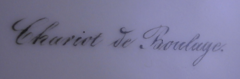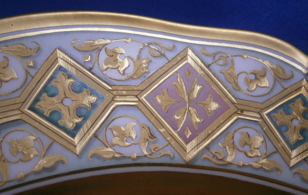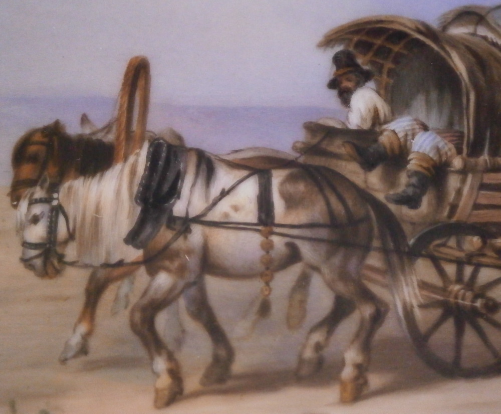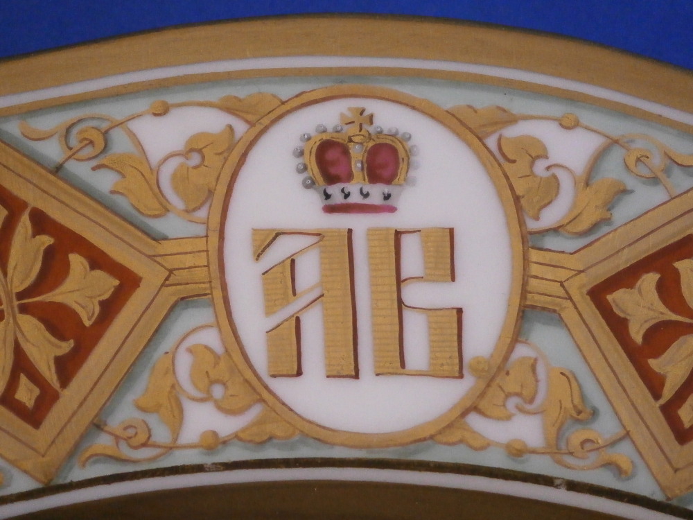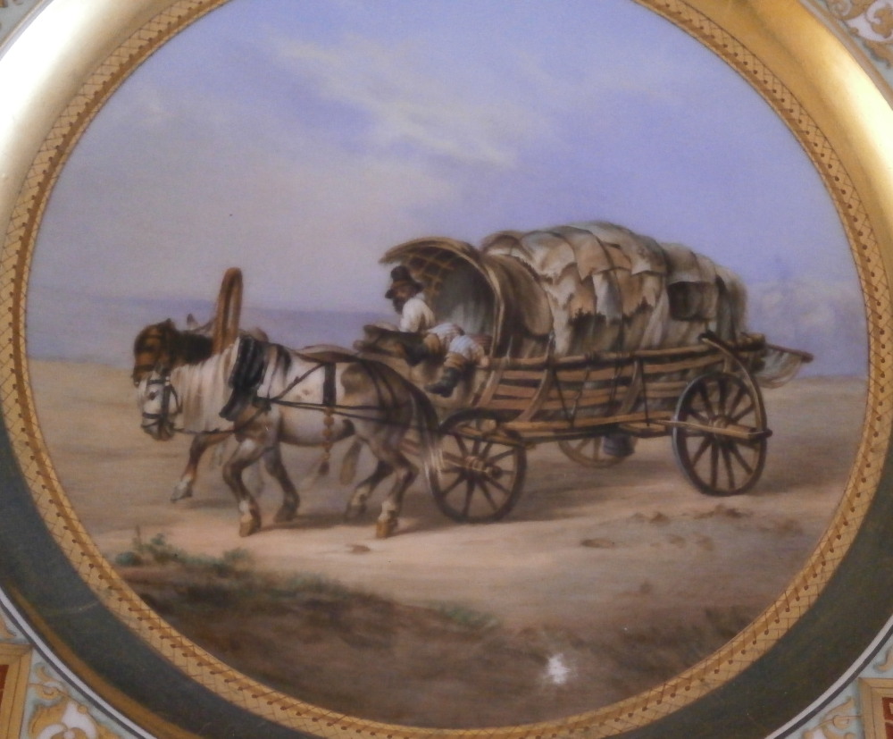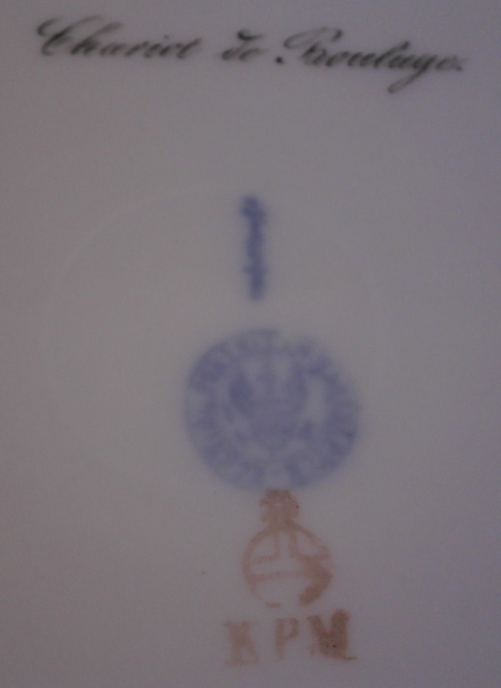 This is a really rare plate made by KPM between 1849 and 1870. A superb piece that is often said to come from the service of the Russian Grand Duke Andrei Vladimirovich but he was born after this plate was made and his royal cypher is different. I personally think it was for his father Grand Duke Vladimir Alexandrovich as he seemed to have used different cyphers. Or maybe for a wedding between two people whose last names ended with an A and a V. Either way this is an amazing plate with a nice rim shape. The rim is decorated with a hand painted design of alternating red and green lozenge shaped panels with gold designs to them with gold leaf scrolls in between and a Russian royal princely crown over the cyrillic monogram / cypher AV. The rim design is certainly based on the Gothic art that many services by the Imperial St. Petersburg company also used in their services. The well of the plate has a thick gold band to the edge with a rope like design under that but the best part is certainly the hand painted scene in the center of the plate including a covered wagon cart pulled by two horses. There are also two gentleman - one sitting and steering the wagon and one fallen back / passed out so you can only see his legs. I especially like the way the horse is drawn! An extremely well painted scene! I have four of these plates each with a different scene from everyday life in Russia. The plate is in superb condition with just a spot of stacking wear as shown and some minor age marks. As good as it gets for being 150 plus years old! It displays superbly! The plate is 1.375 inches tall and 9.75 inches in diameter. It is marked underneath with the under glaze blue scepter over the so called penny mark as well as the red orb and some impressed marks. The title of the scene is written in French script - Chariot de Roulage which means Rolling Carriage I think. Please email me for more information or other pictures.